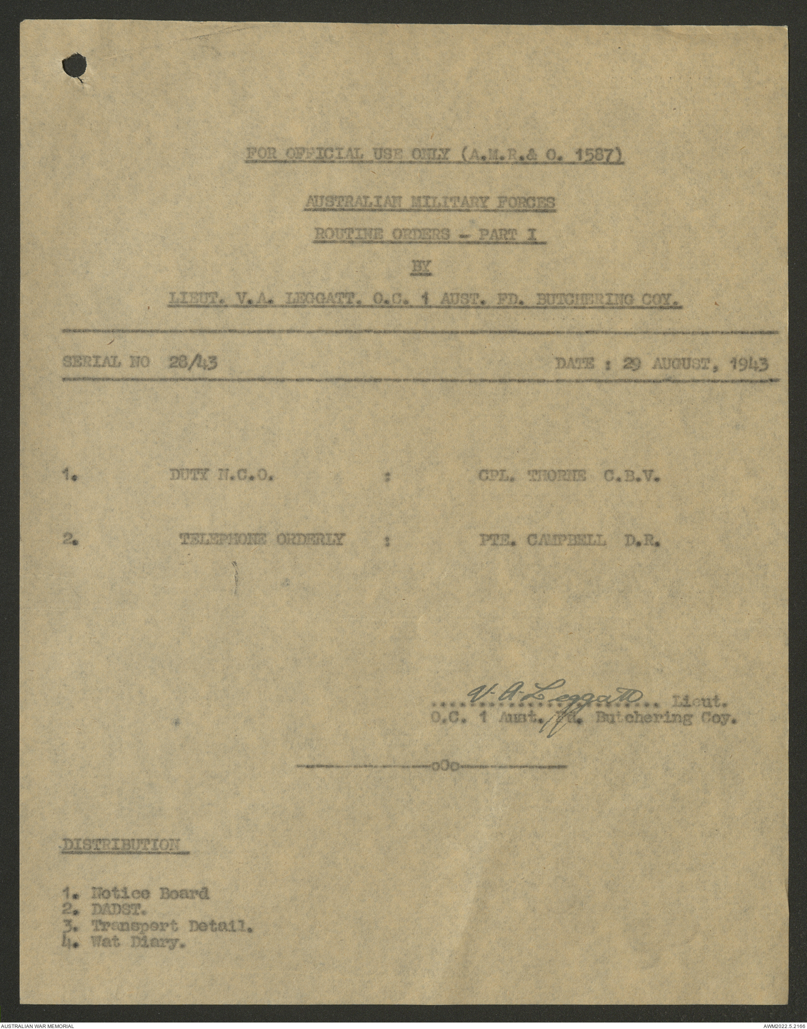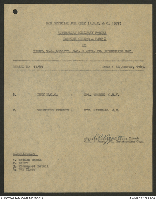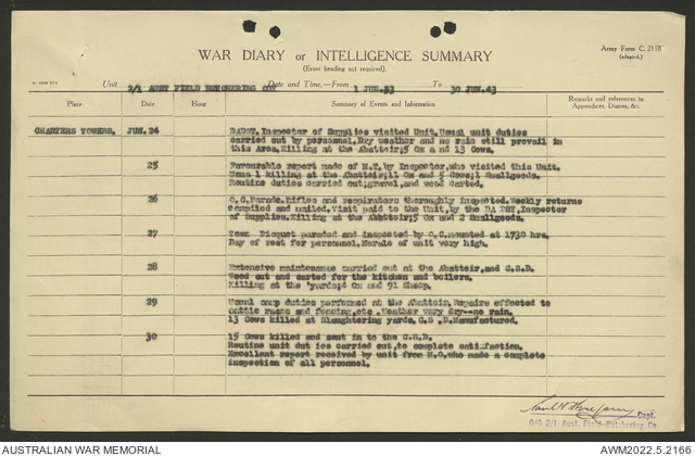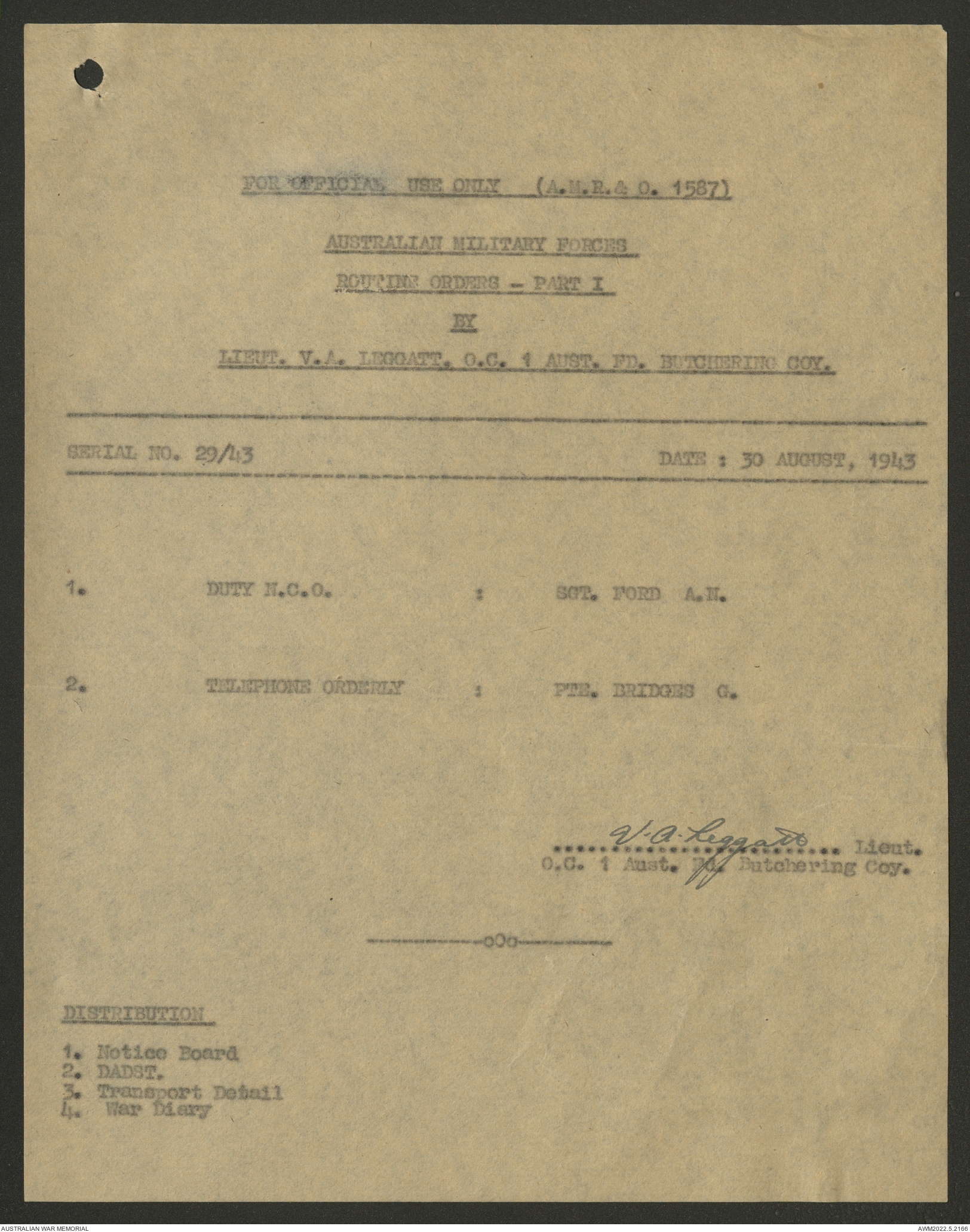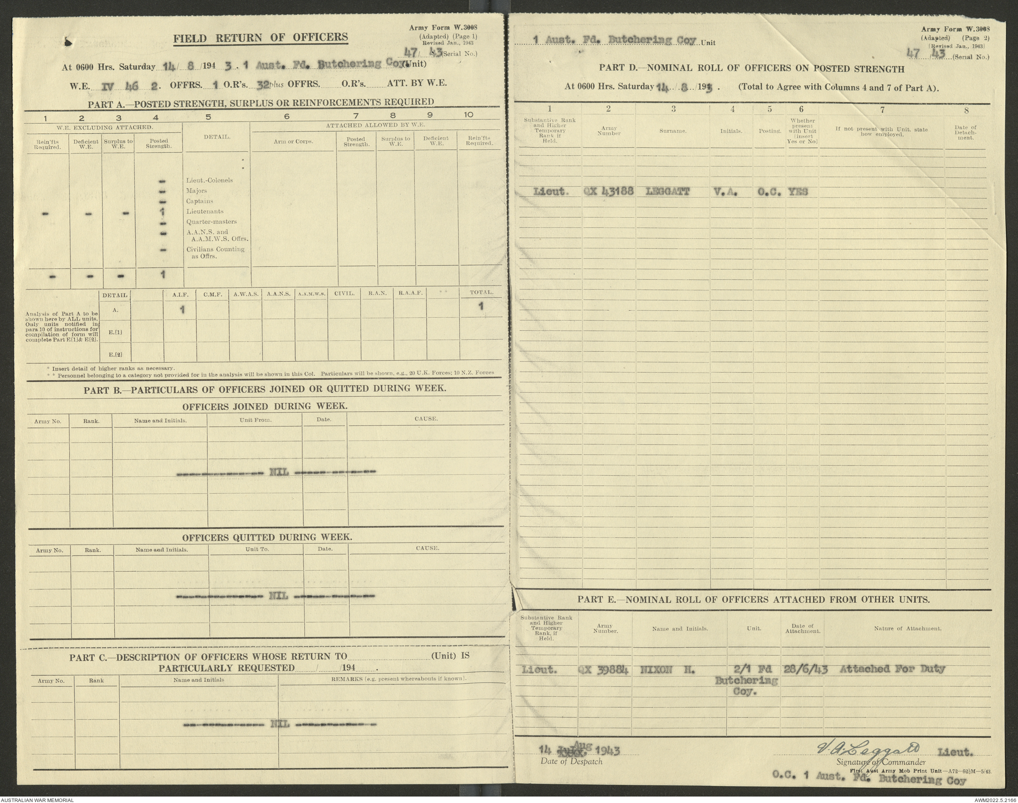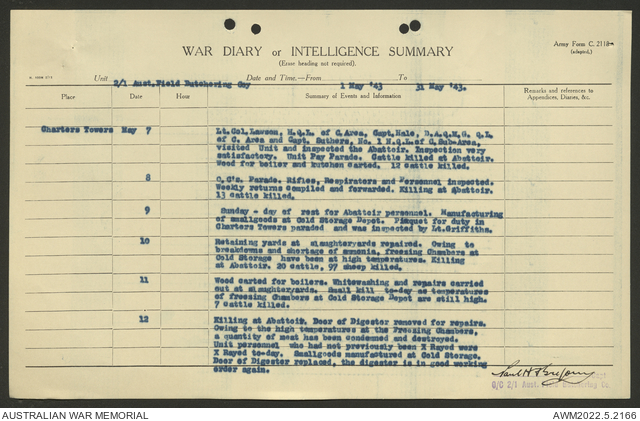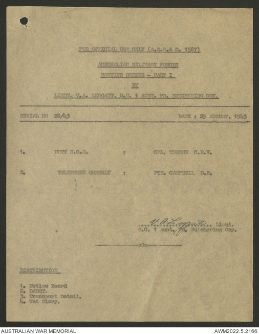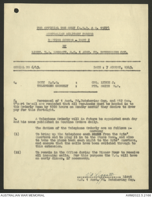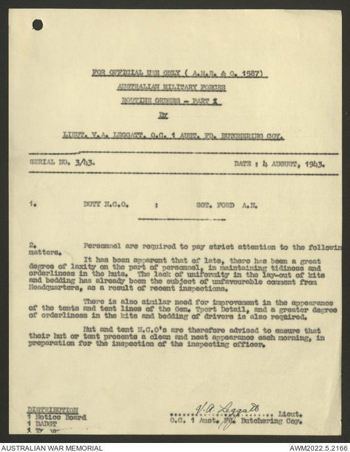AWM52 10/28/1/1 - [Unit War Diaries, 1939-45 War] 1 Australian Field Butchering Company, March 1942 - August 1943