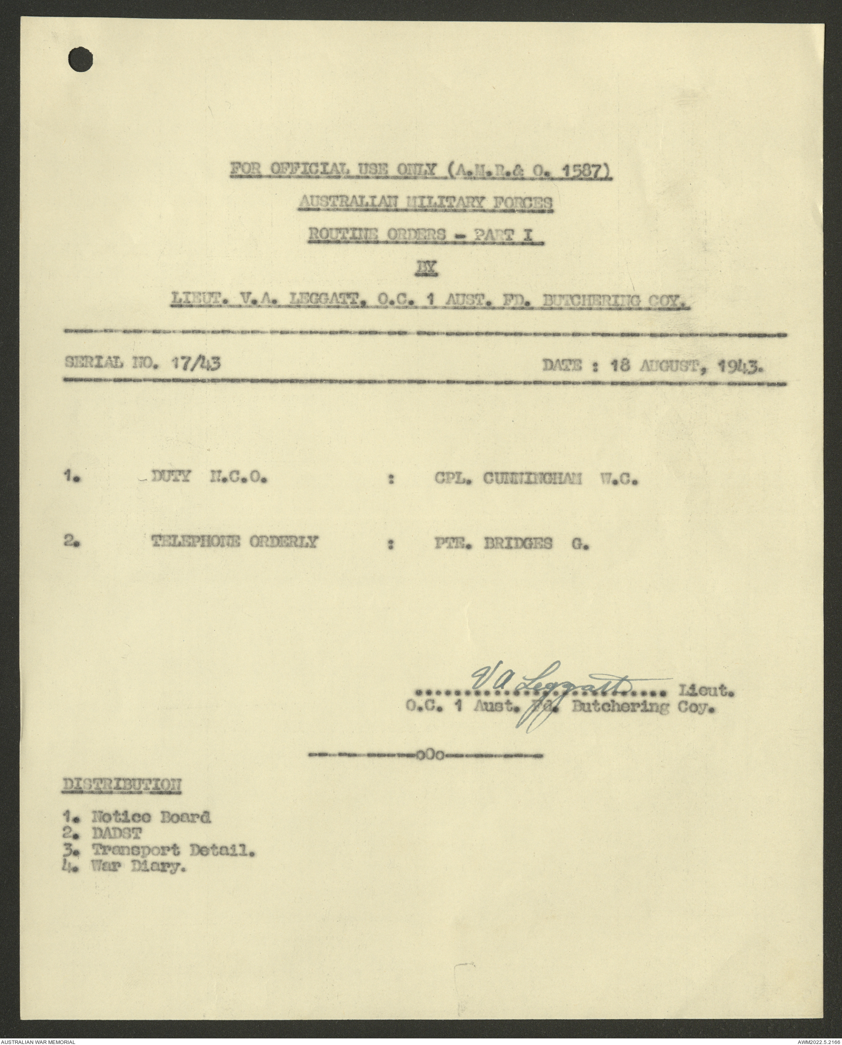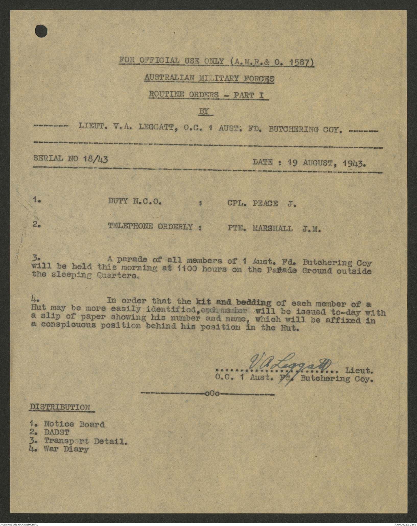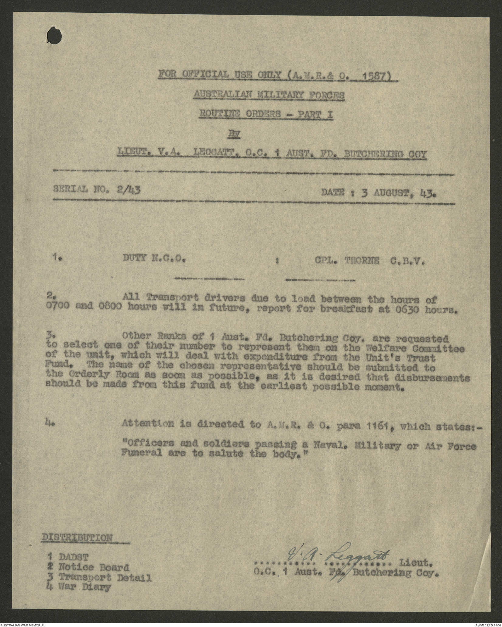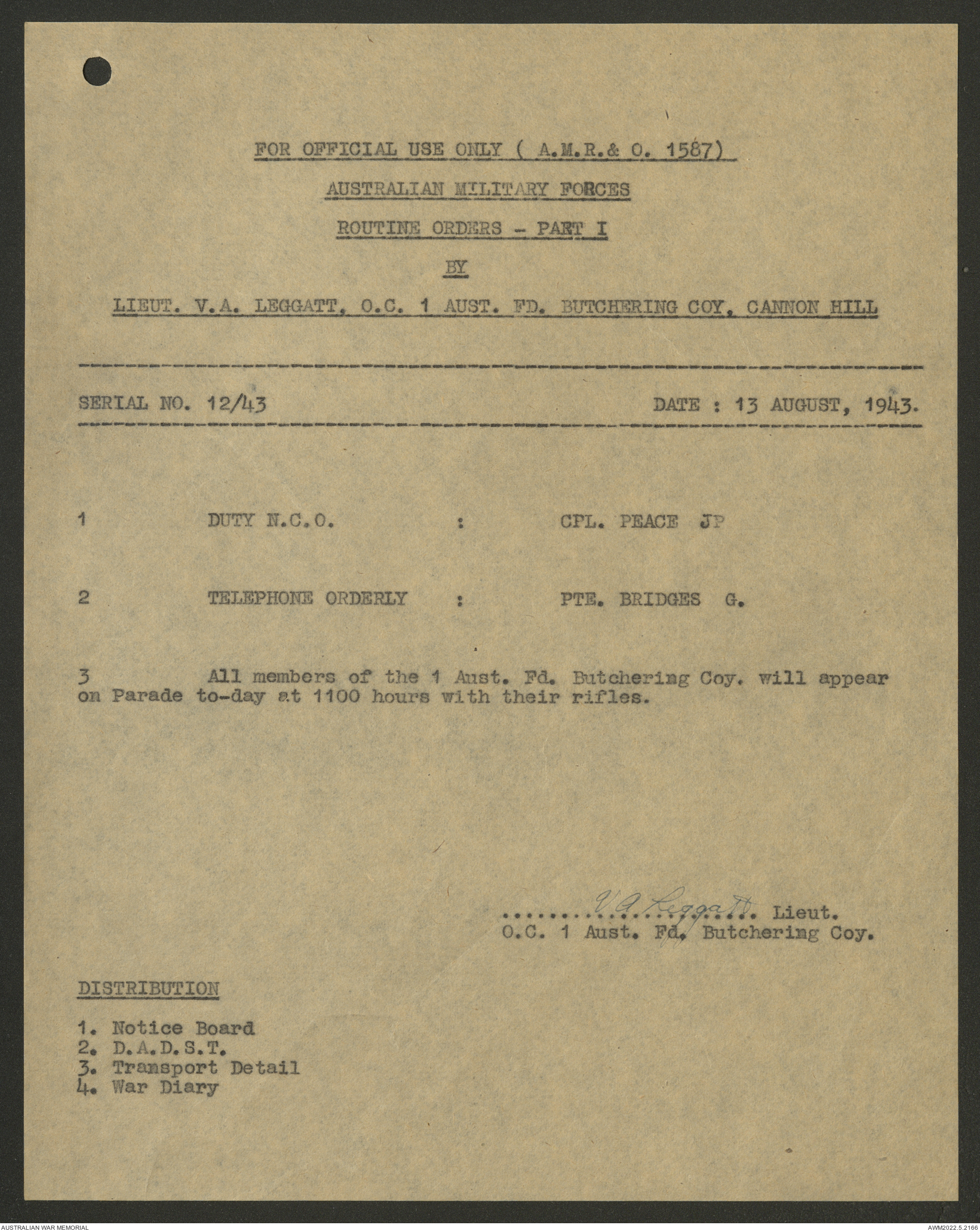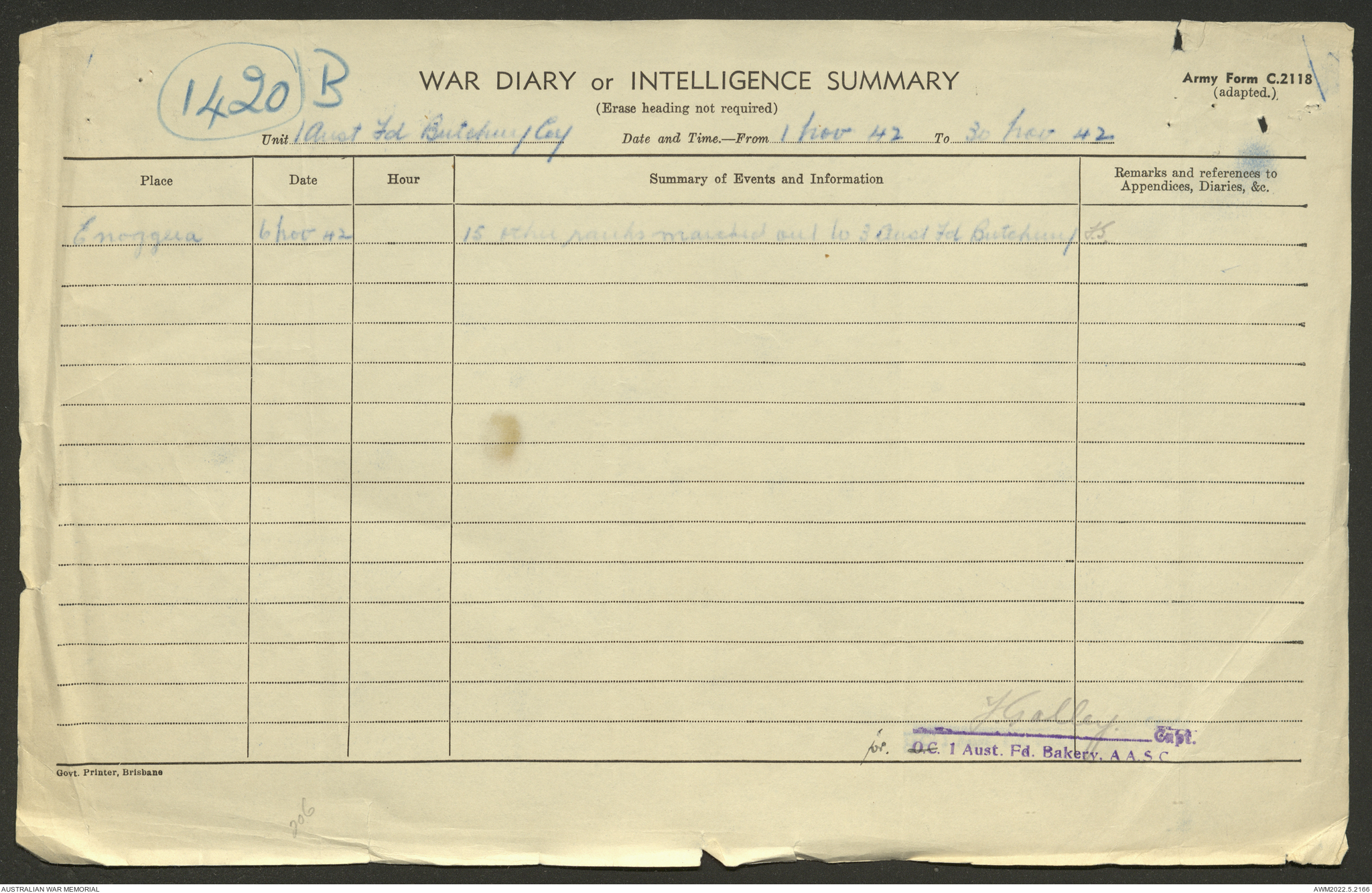 AWM52 10/28/1/1 - [Unit War Diaries, 1939-45 War] 1 Australian Field Butchering Company, March 1942 - August 1943