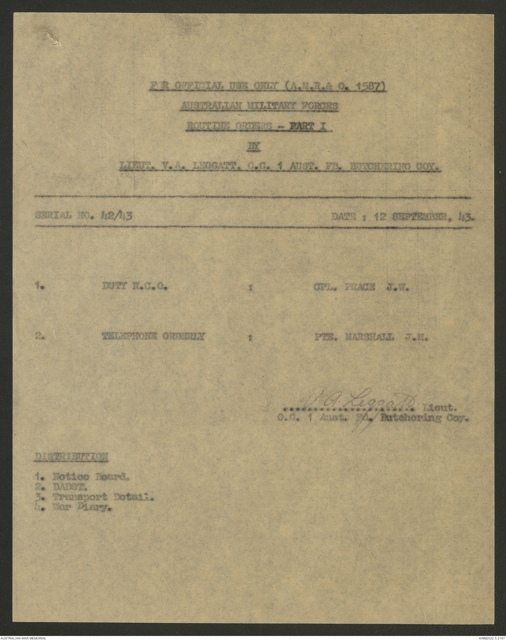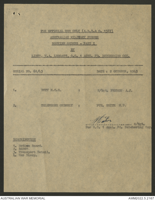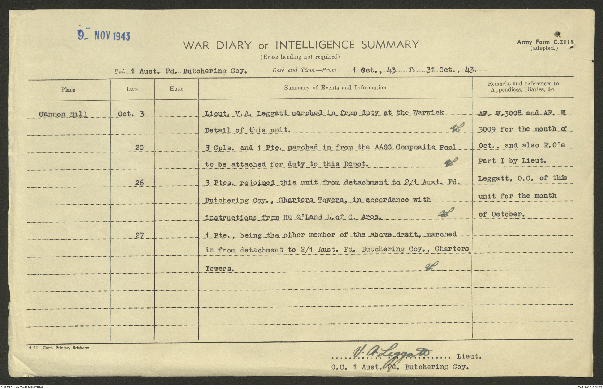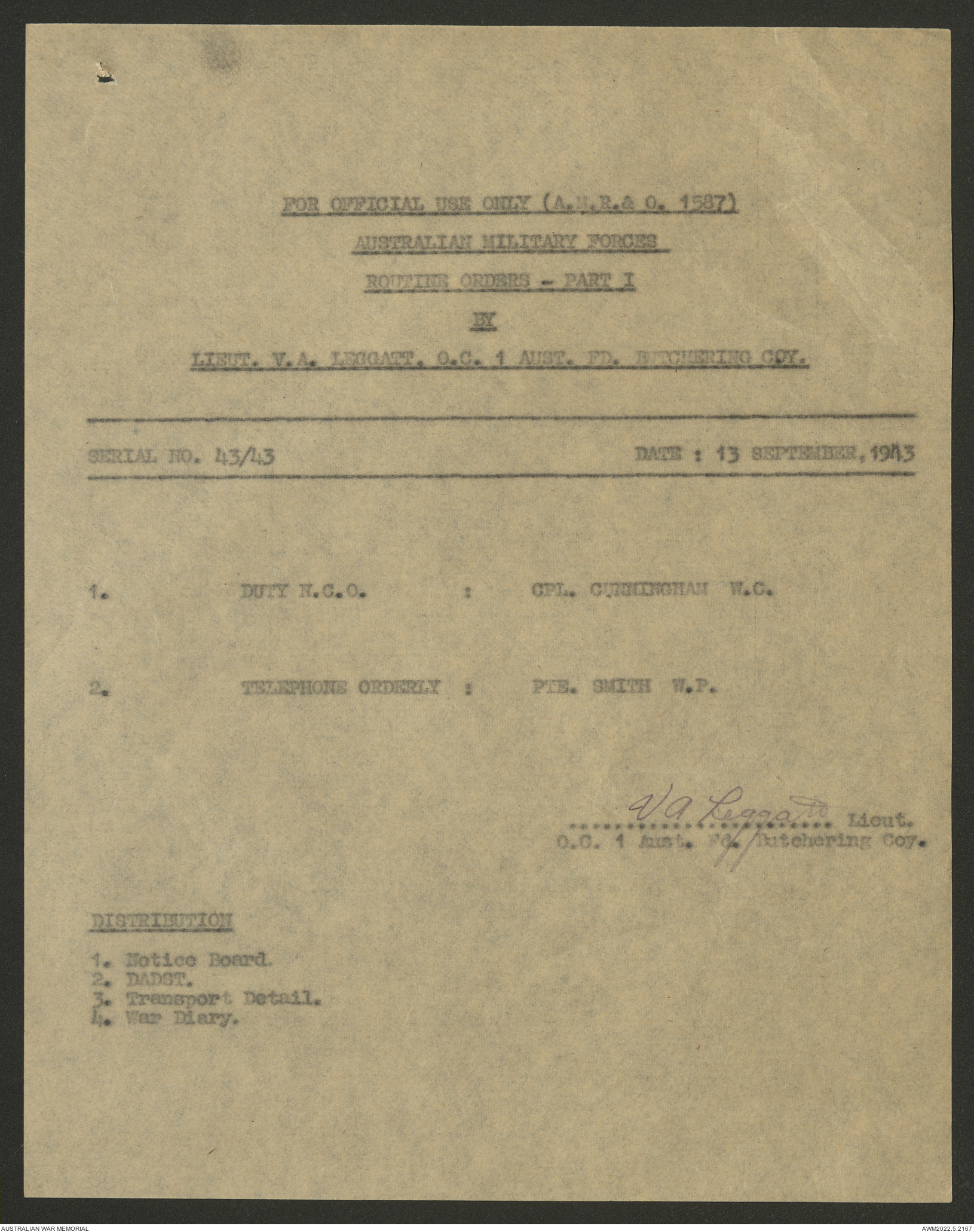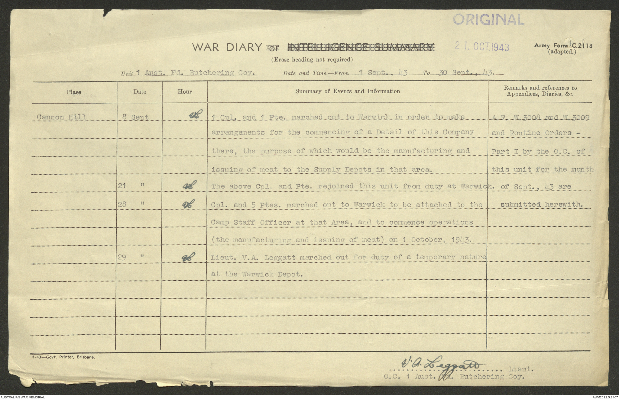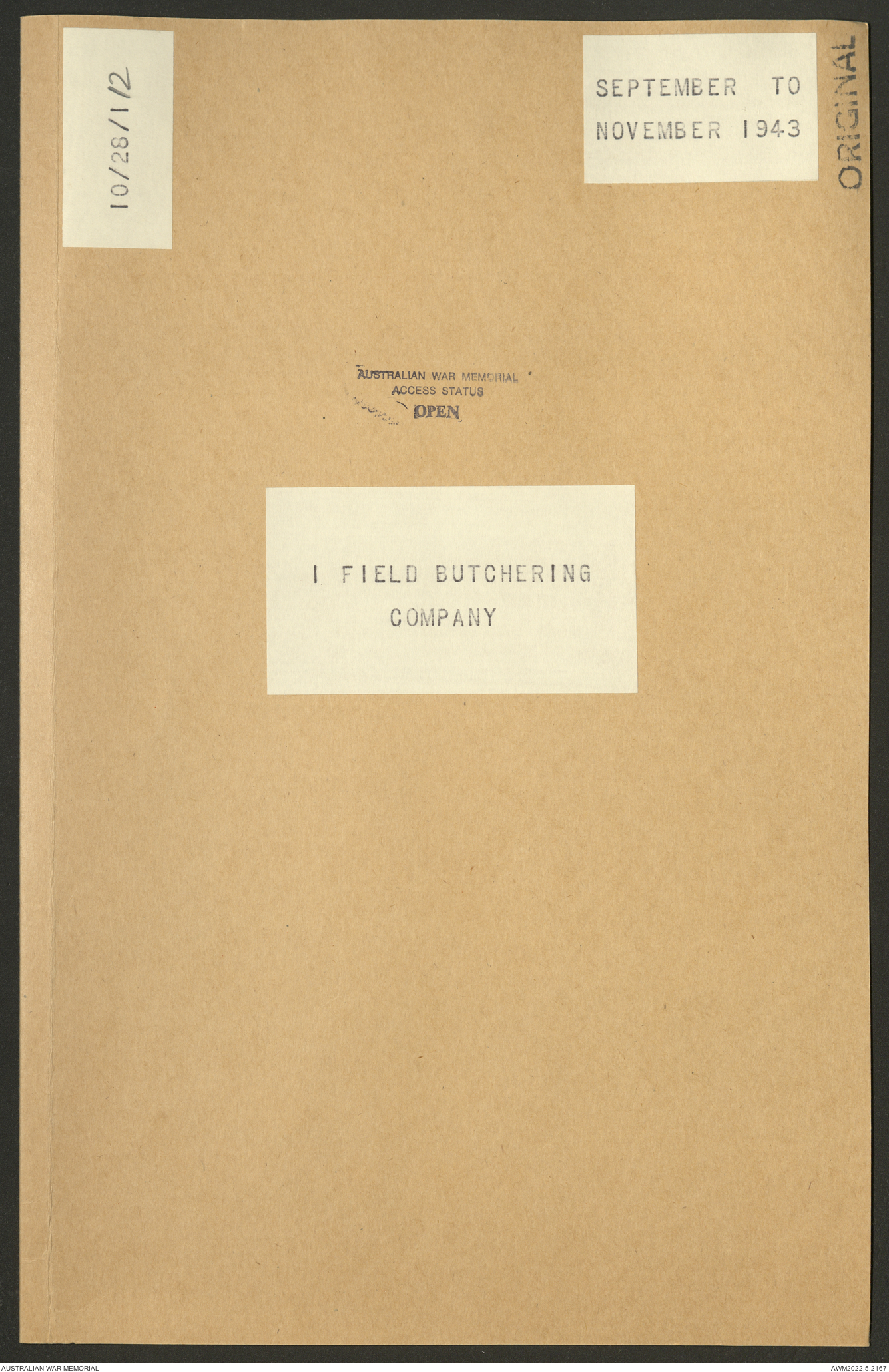 AWM52 10/28/1/2 - [Unit War Diaries, 1939-45 War] 1 Australian Field Butchering Company, September - November 1943