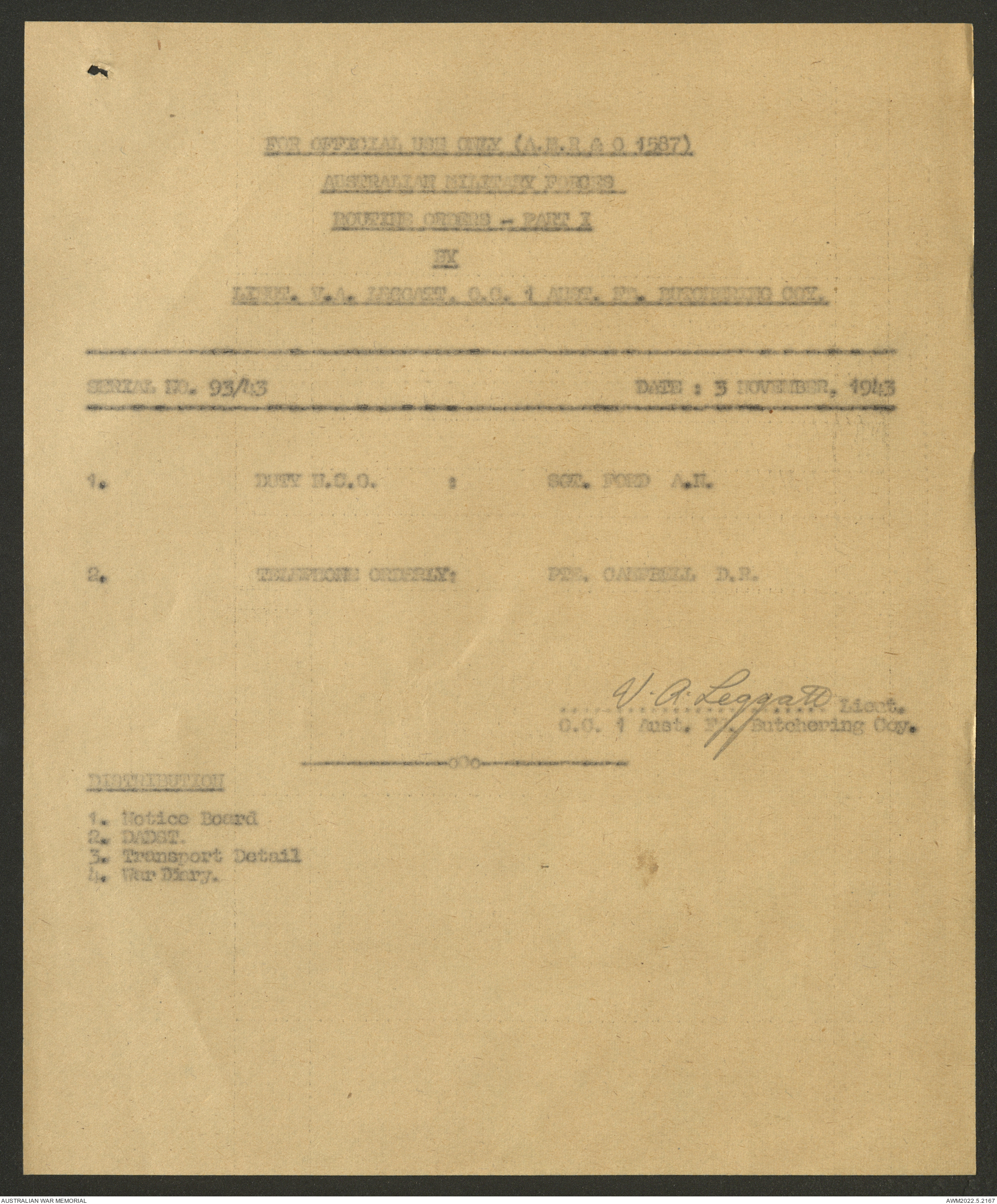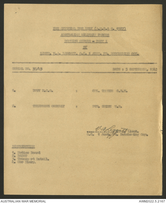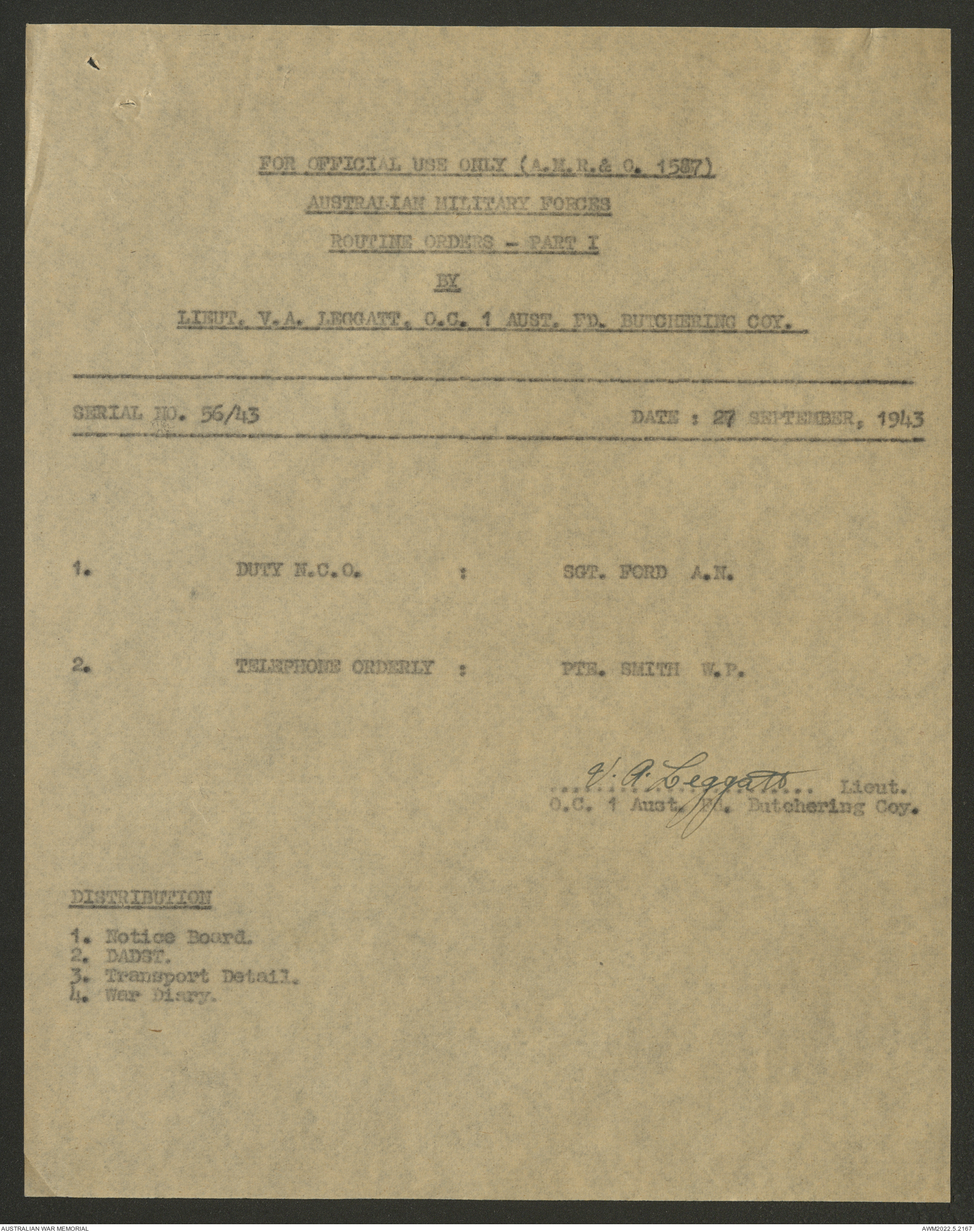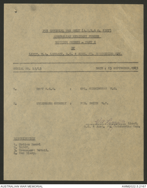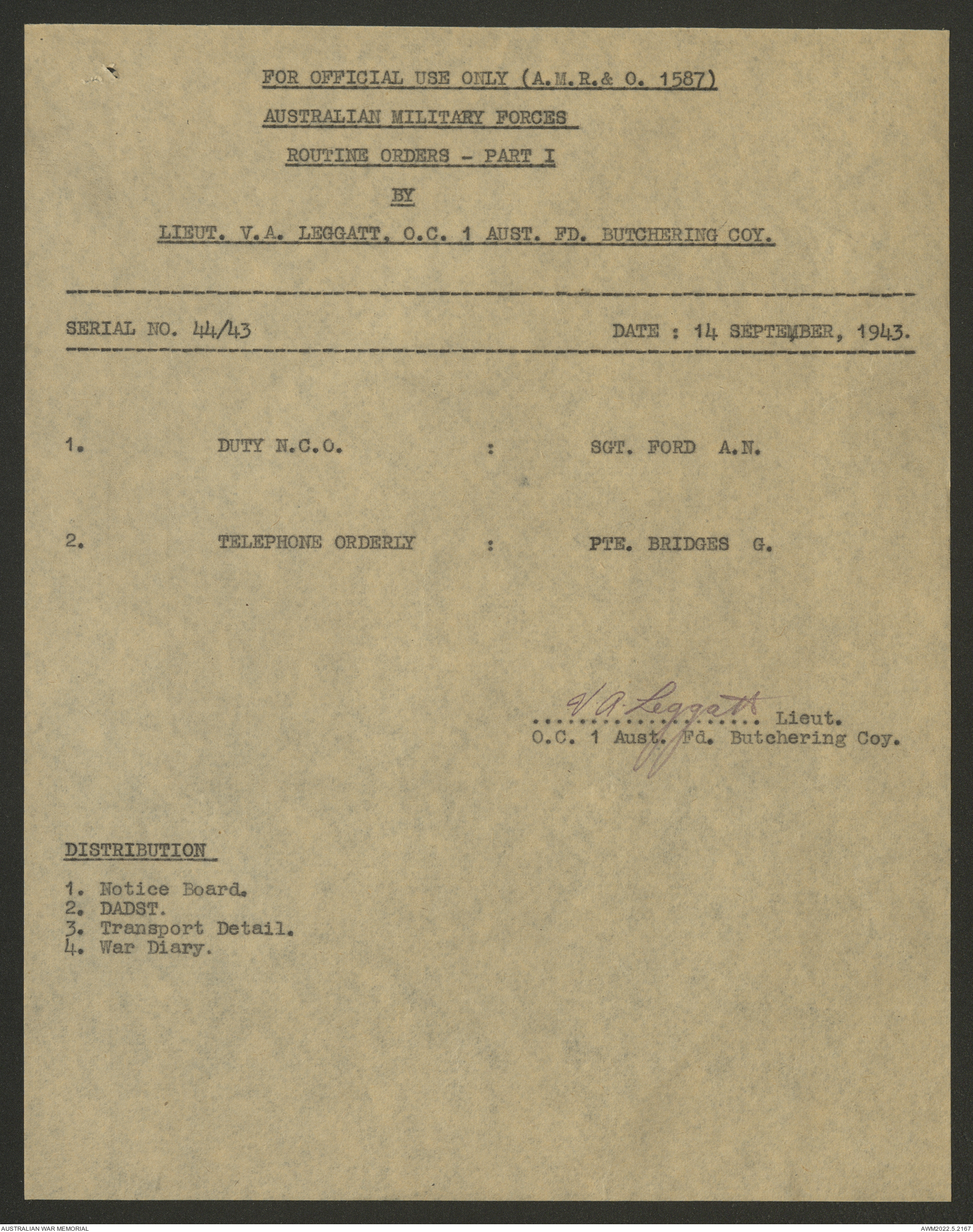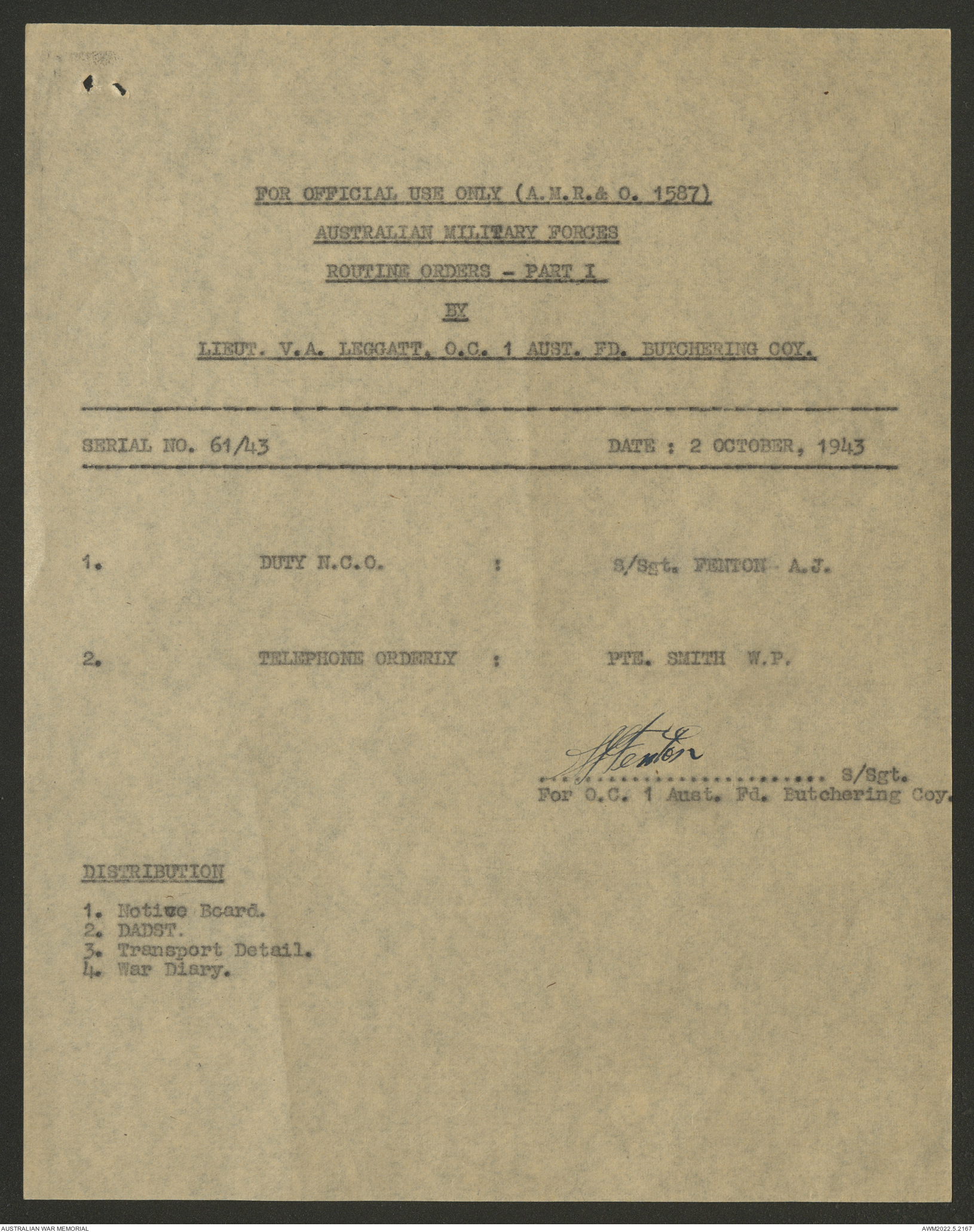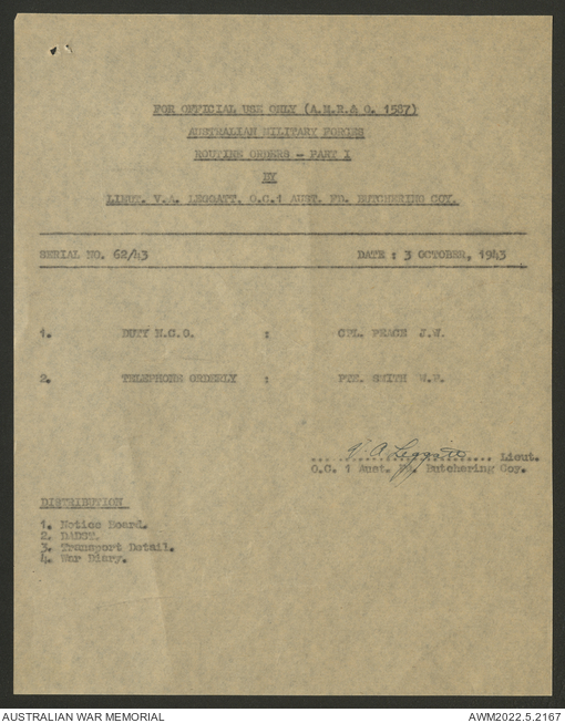 AWM52 10/28/1/2 - [Unit War Diaries, 1939-45 War] 1 Australian Field Butchering Company, September - November 1943