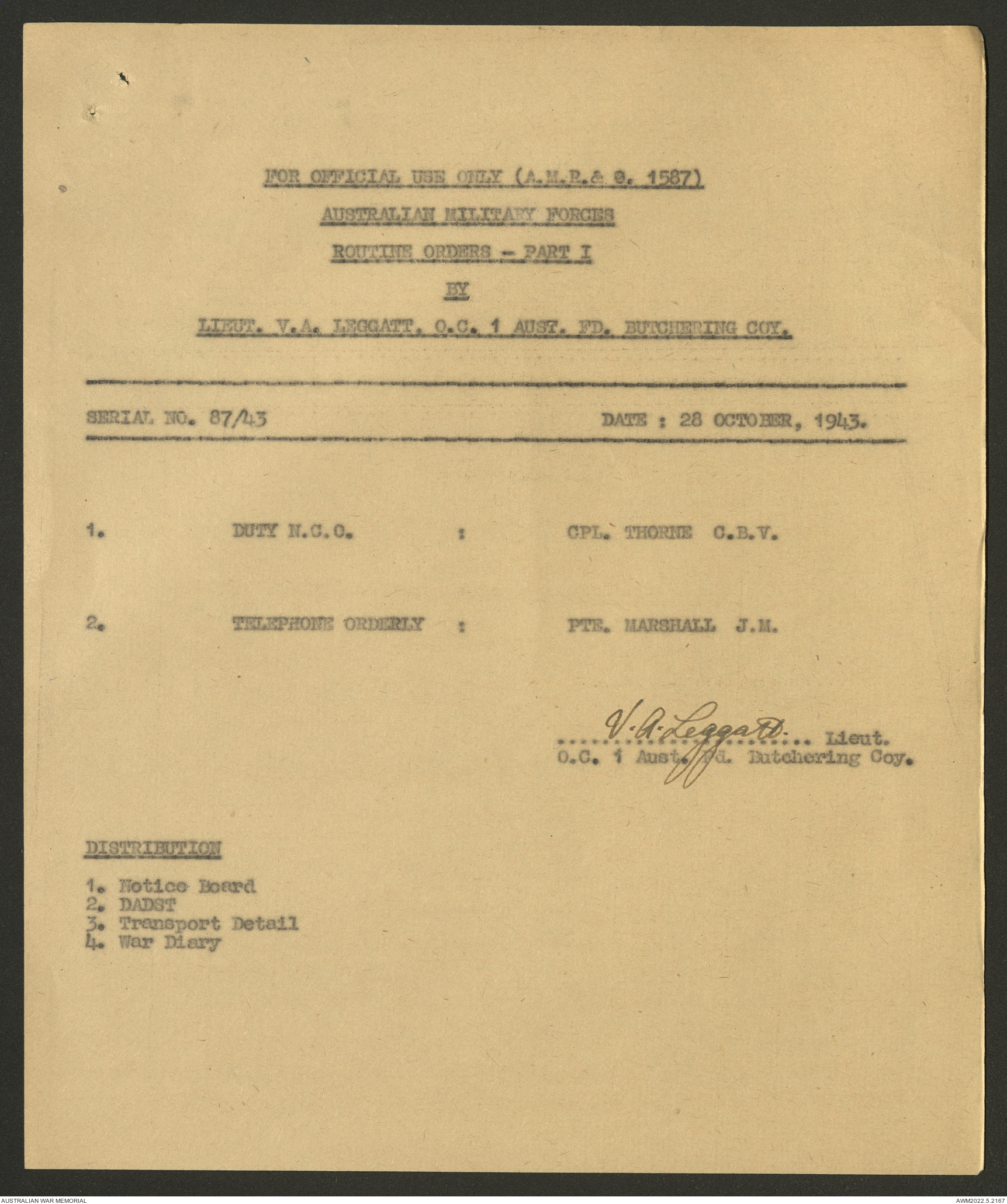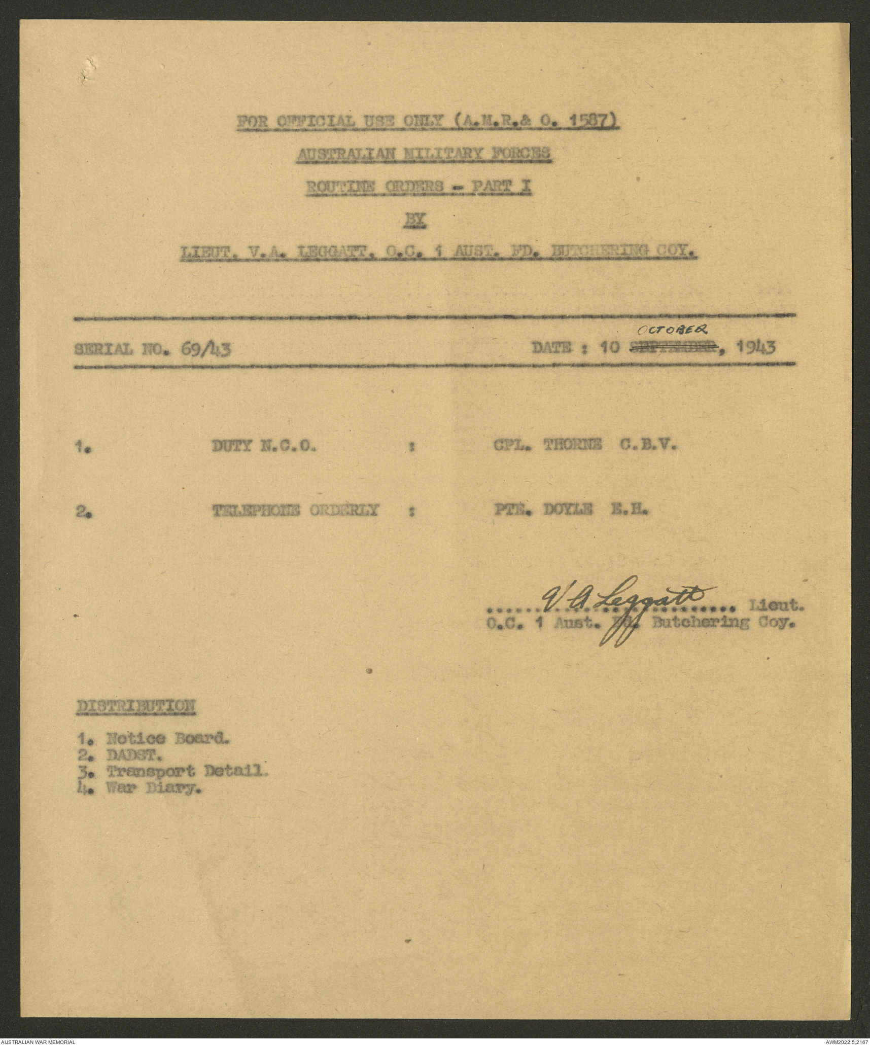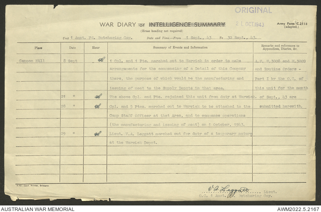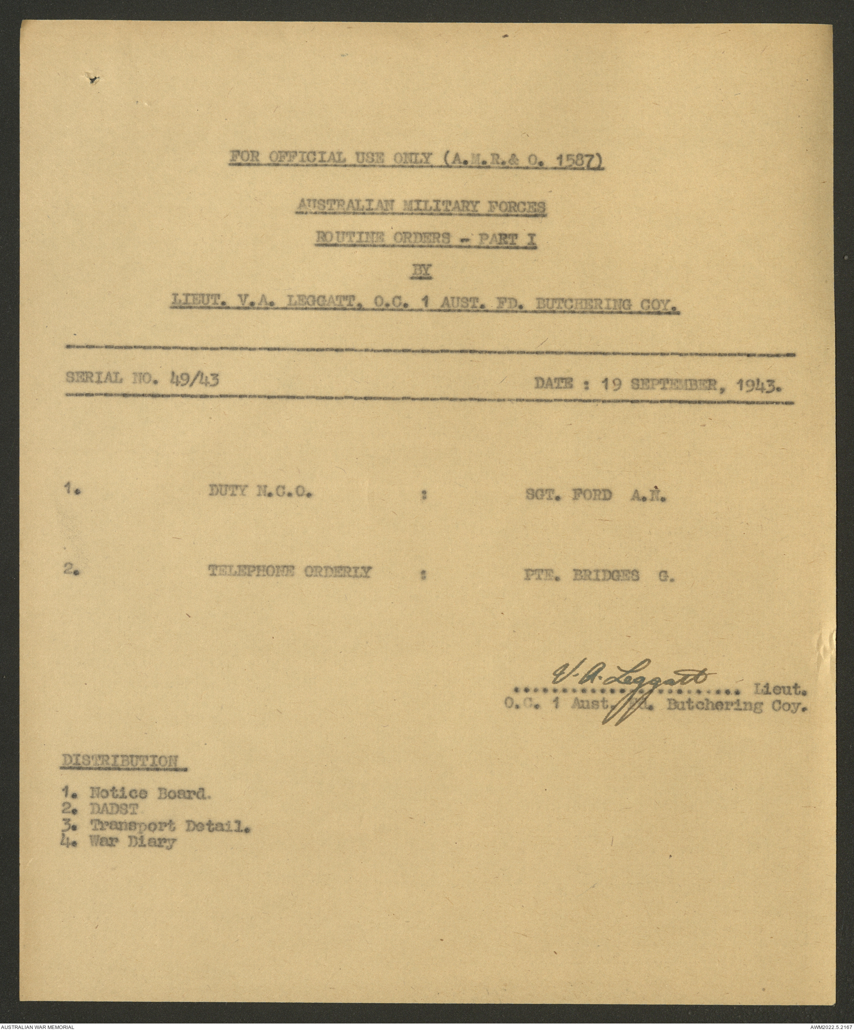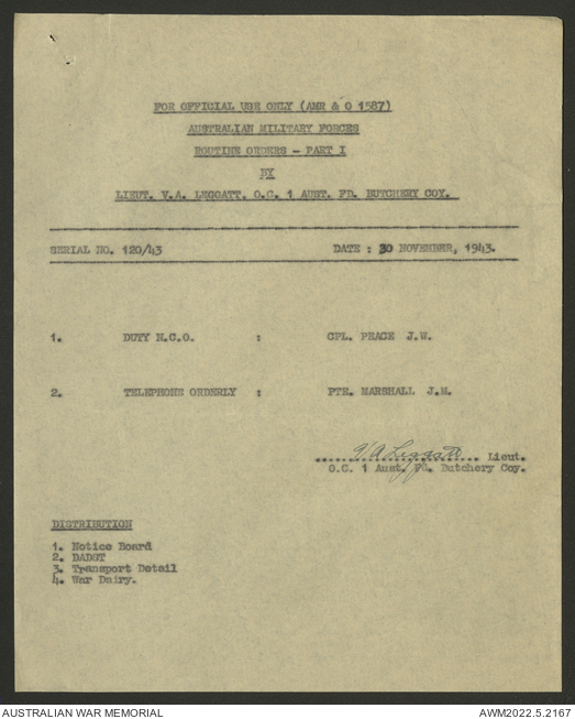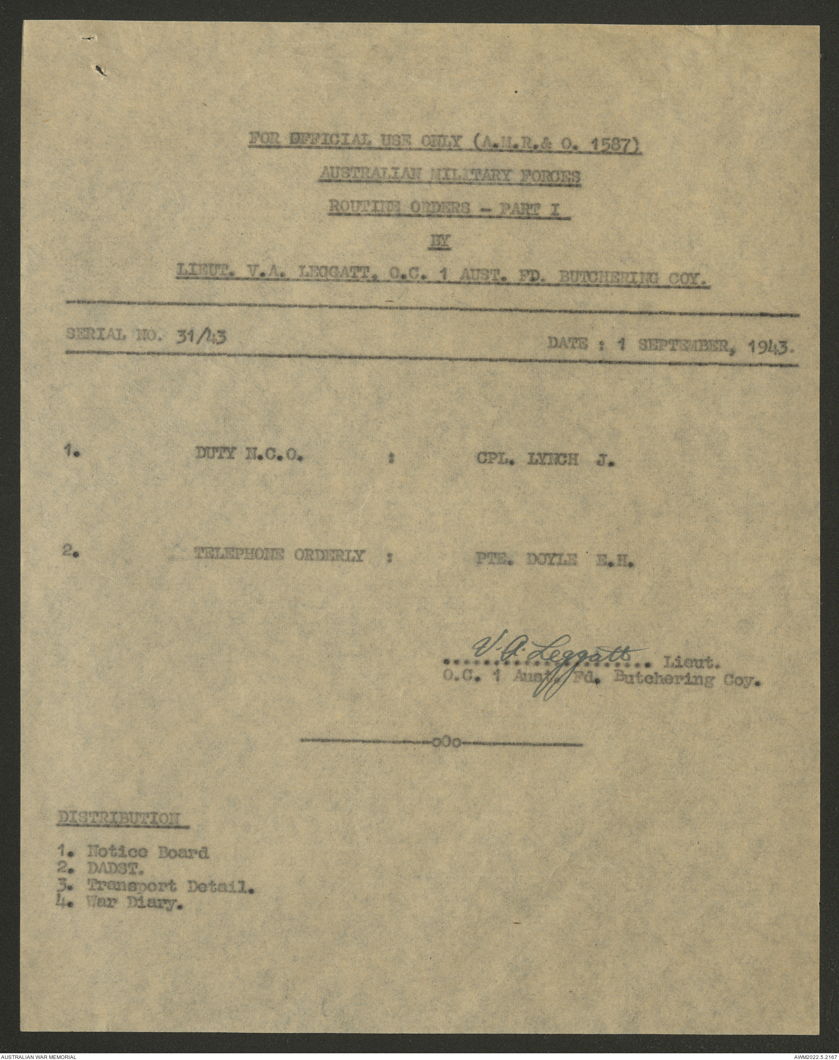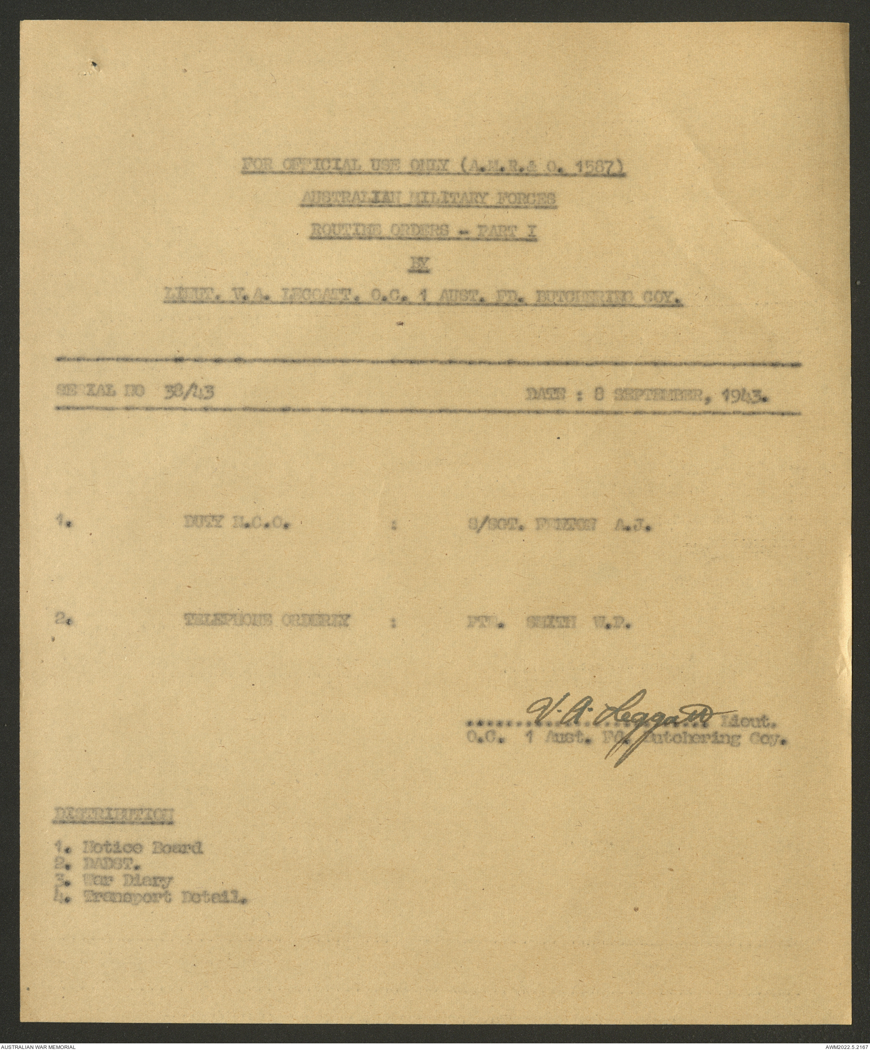 AWM52 10/28/1/2 - [Unit War Diaries, 1939-45 War] 1 Australian Field Butchering Company, September - November 1943