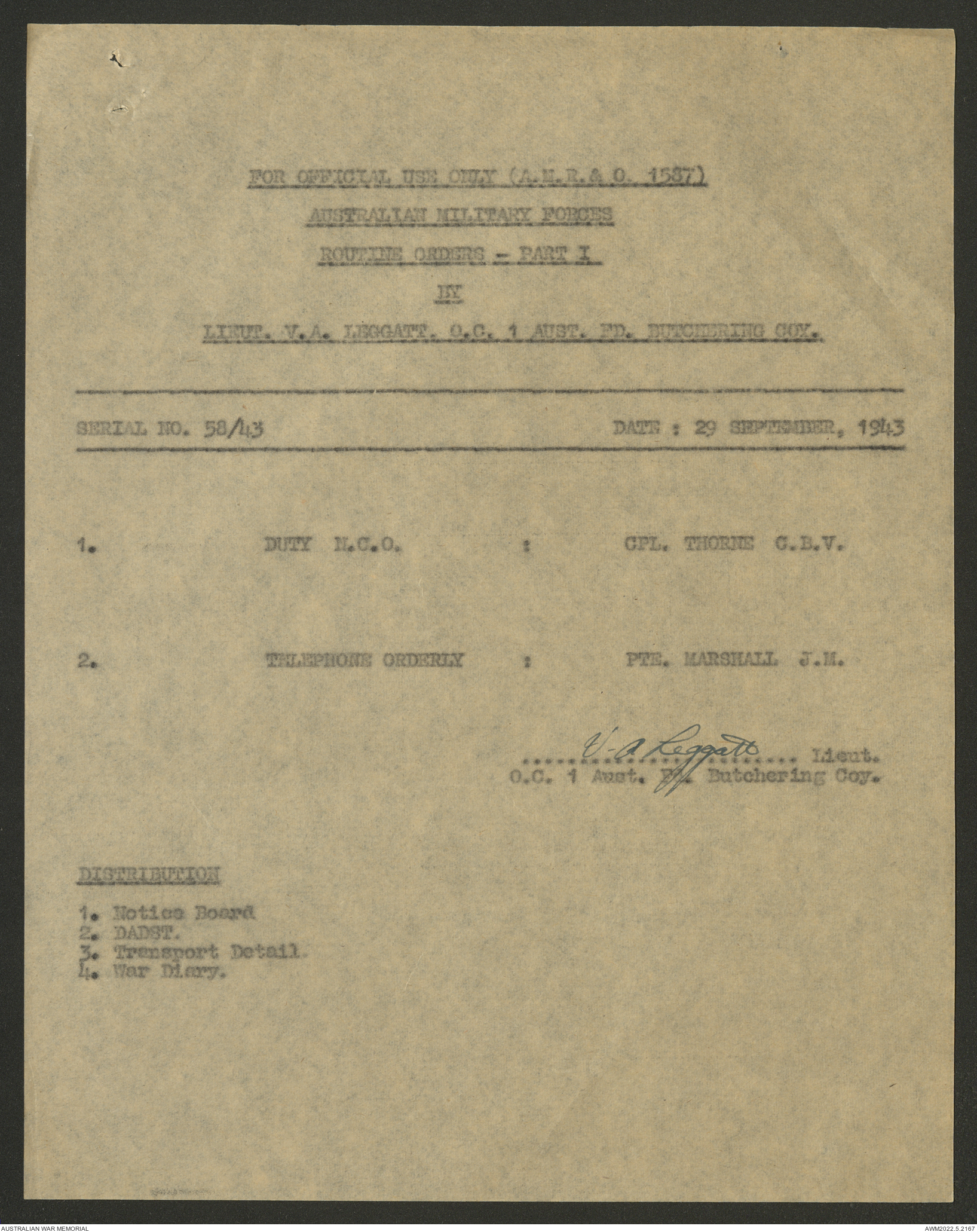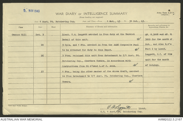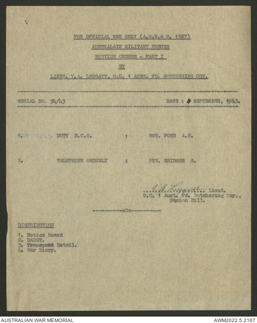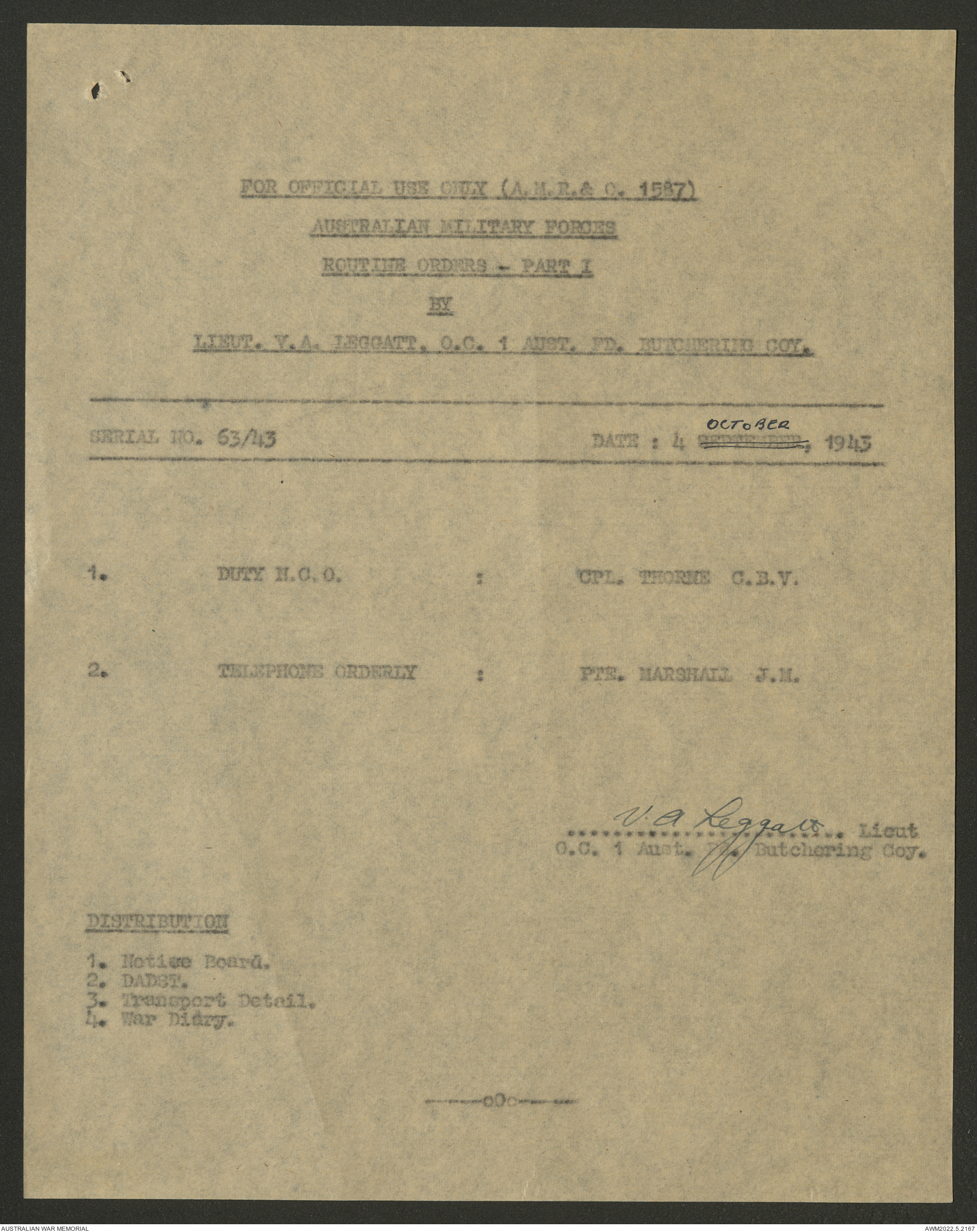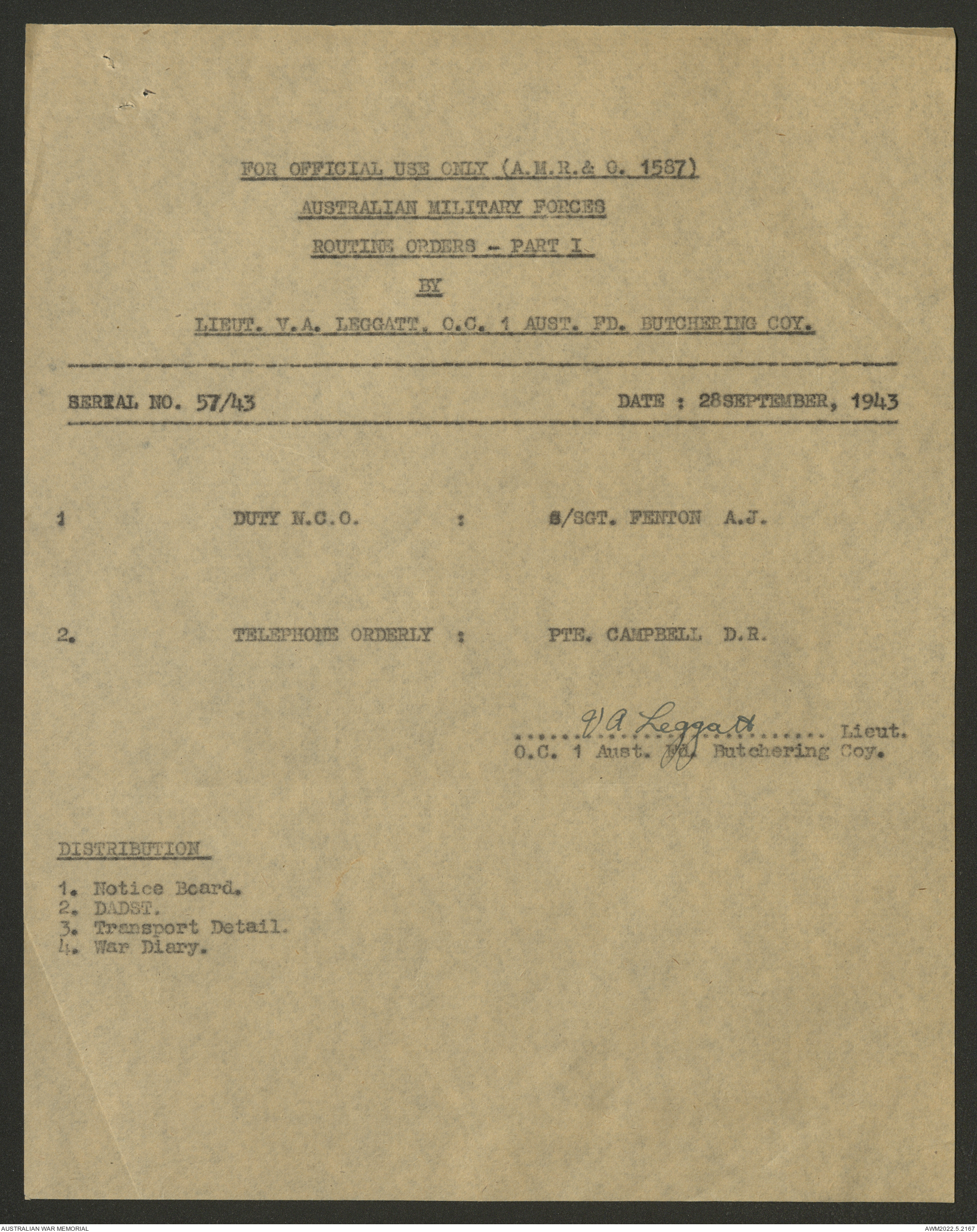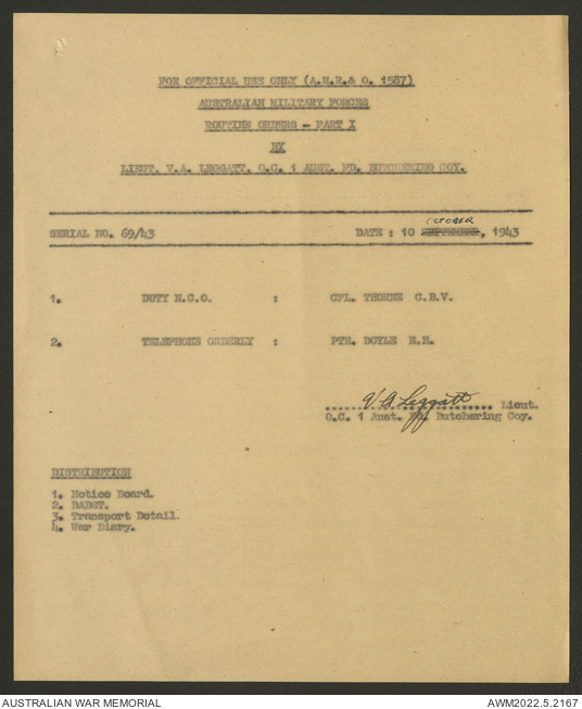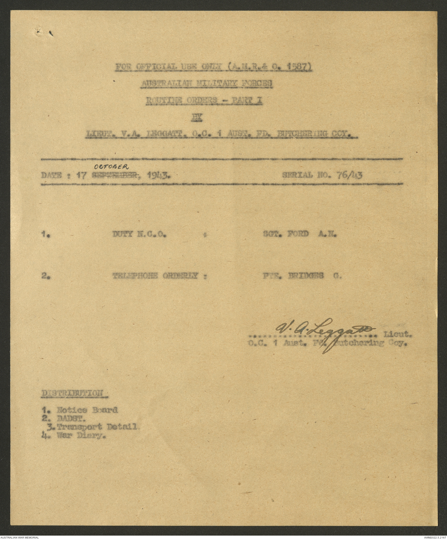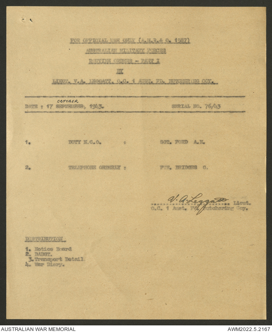 AWM52 10/28/1/2 - [Unit War Diaries, 1939-45 War] 1 Australian Field Butchering Company, September - November 1943