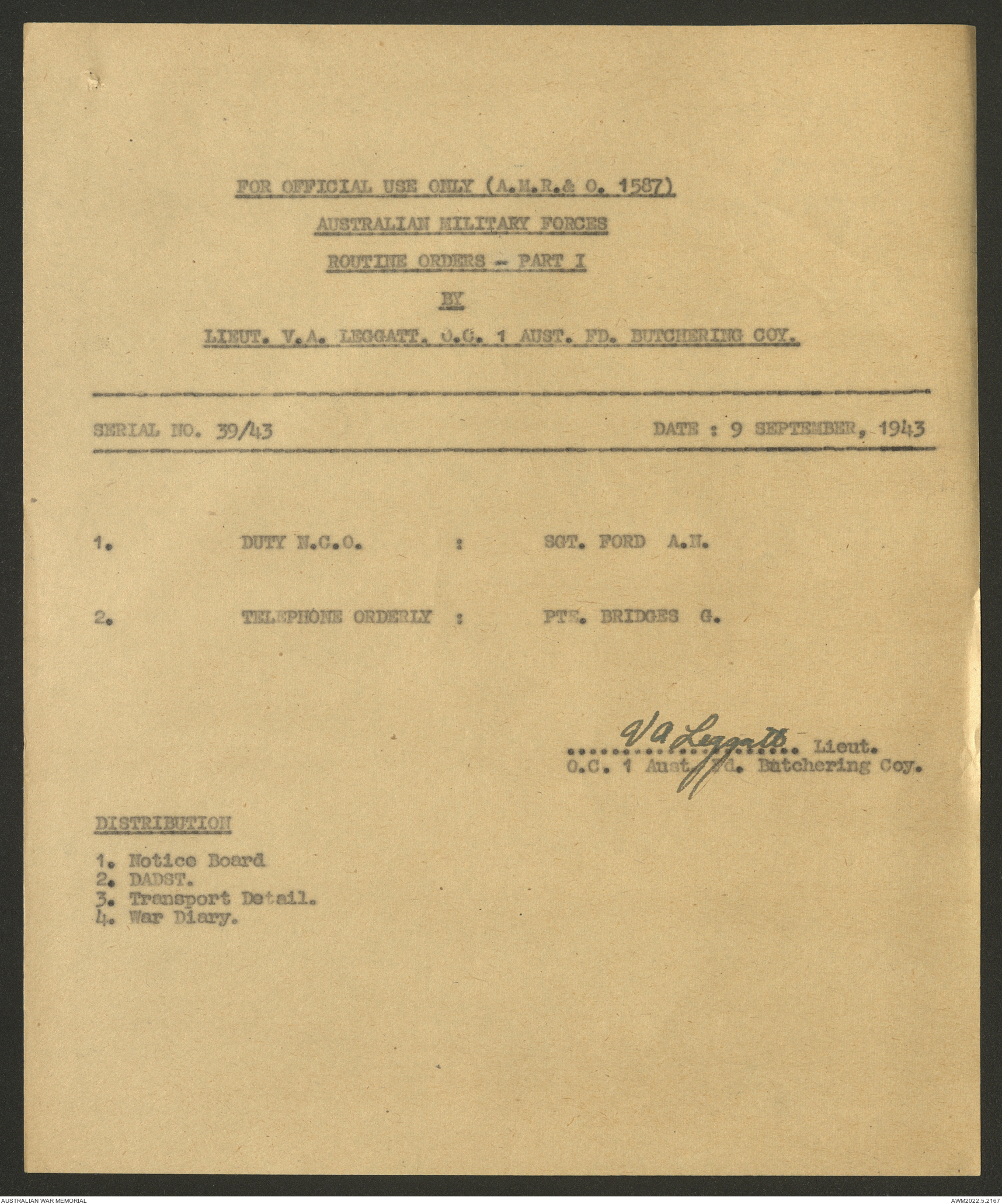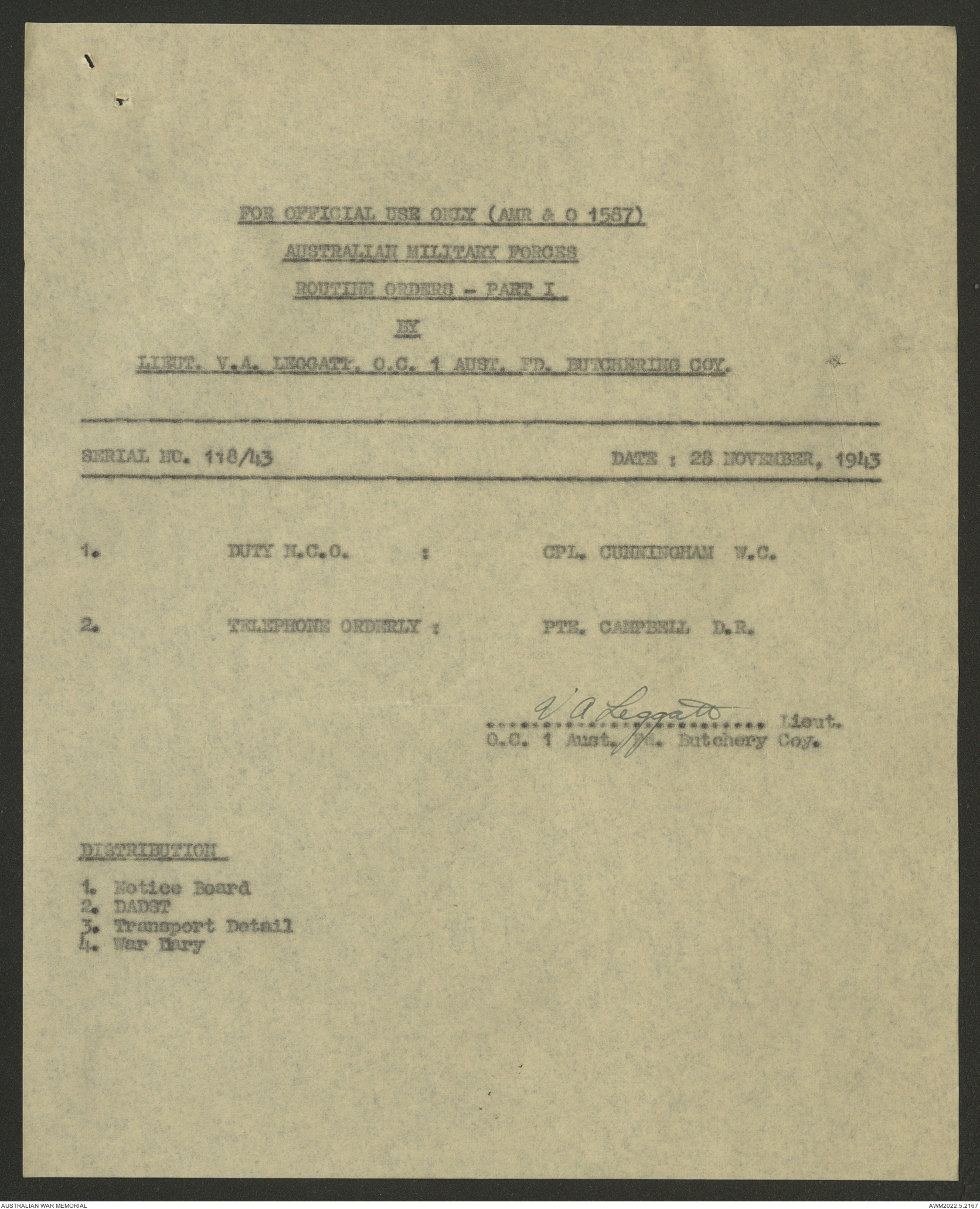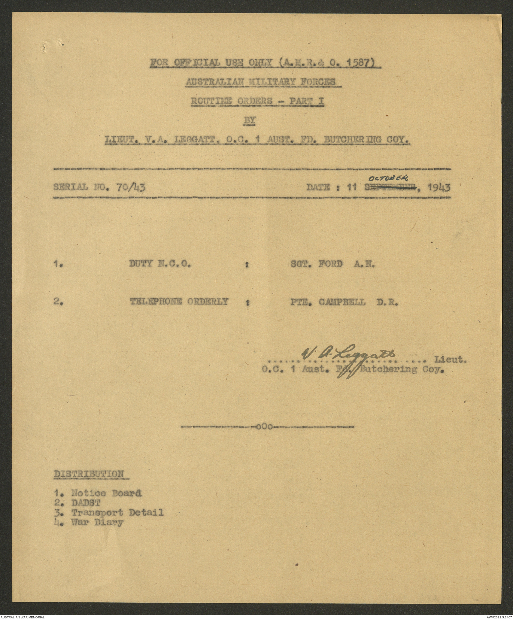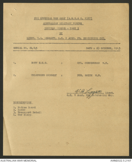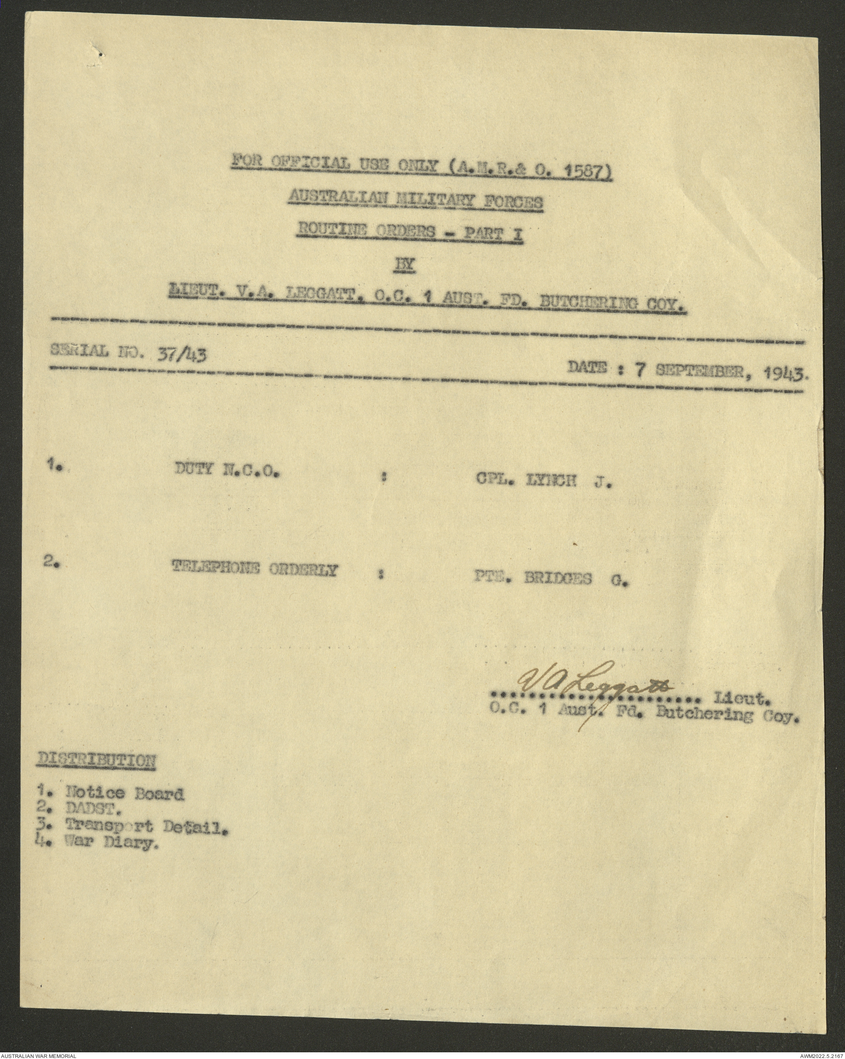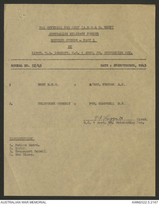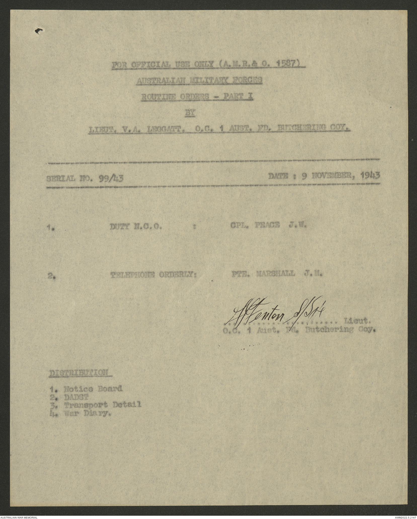 AWM52 10/28/1/2 - [Unit War Diaries, 1939-45 War] 1 Australian Field Butchering Company, September - November 1943