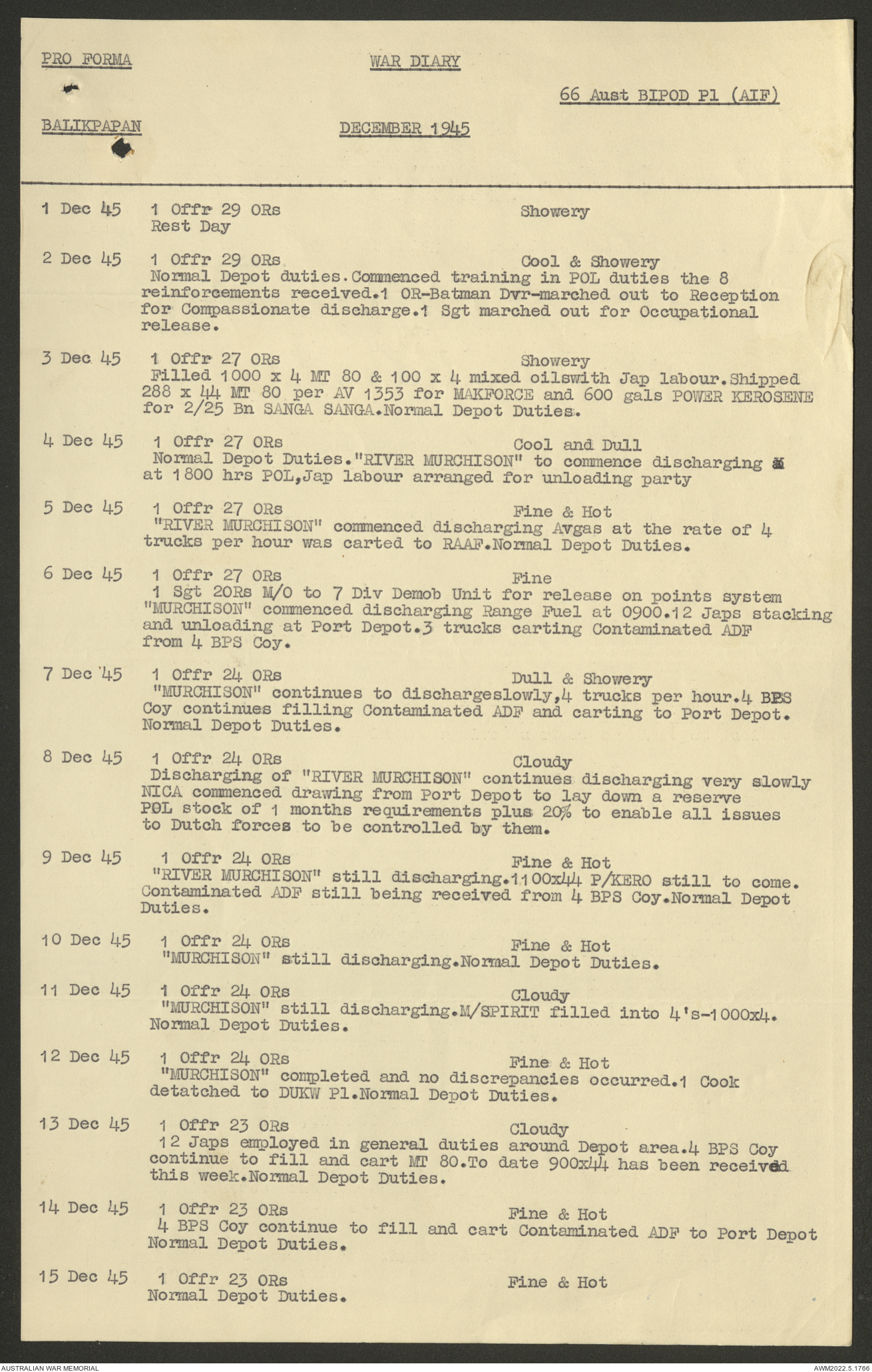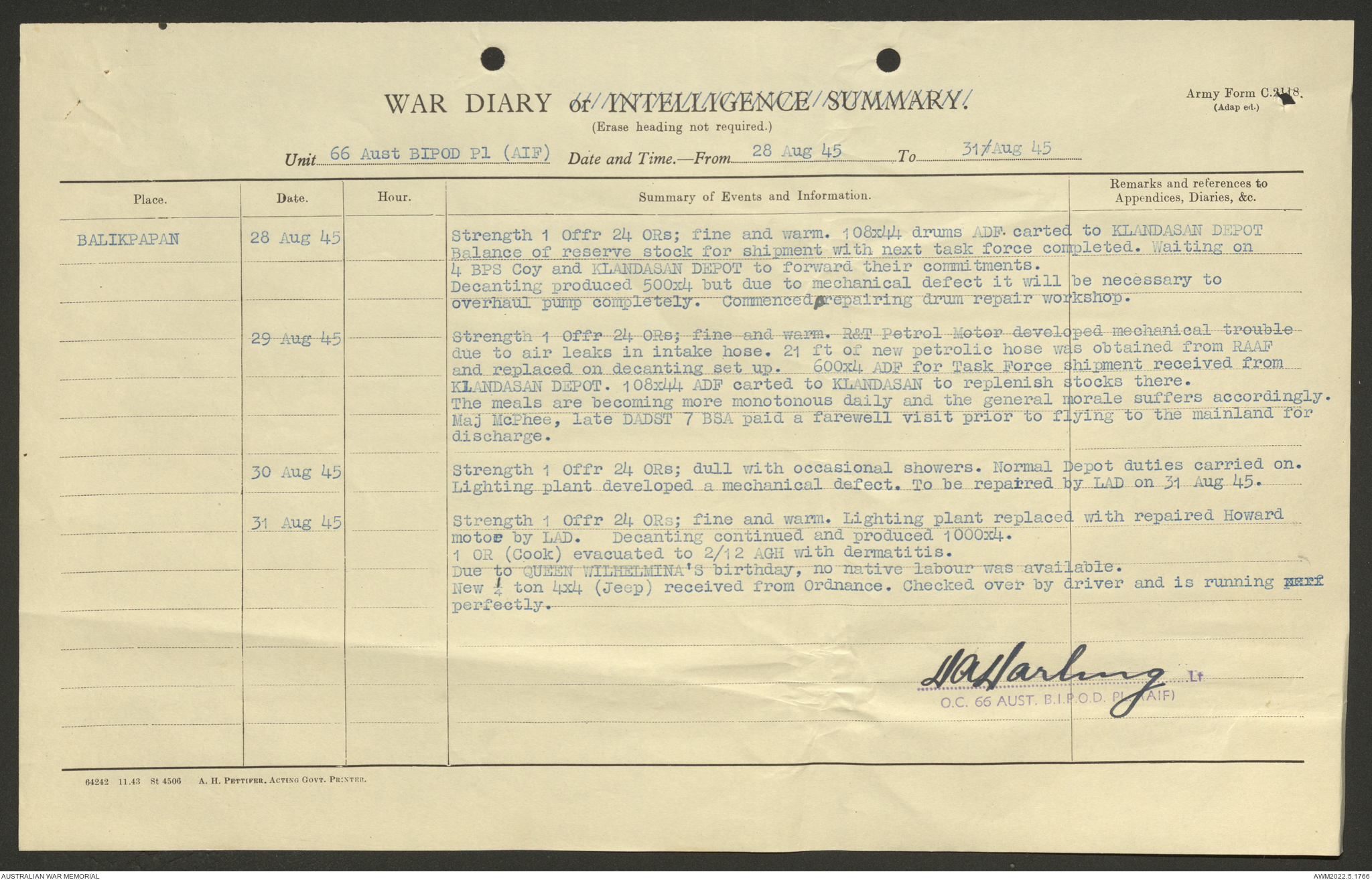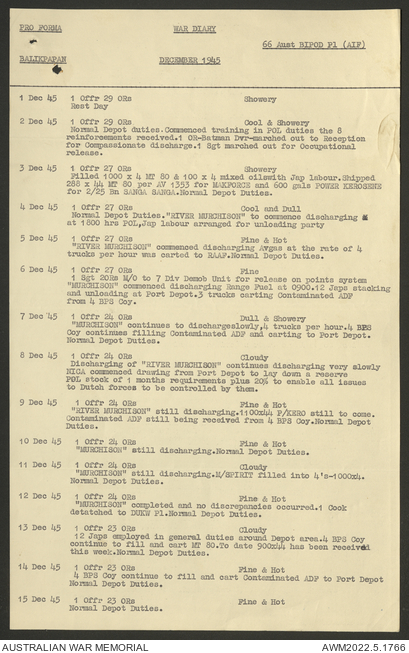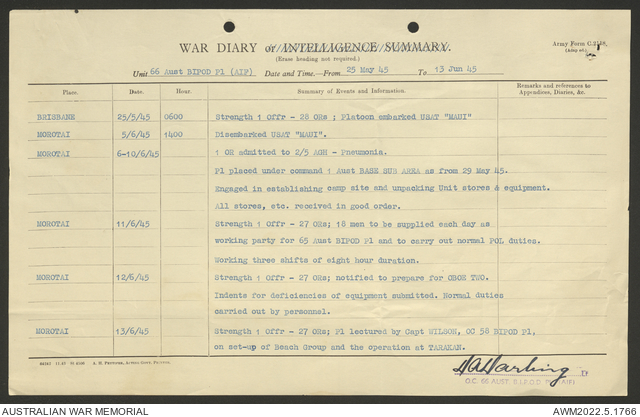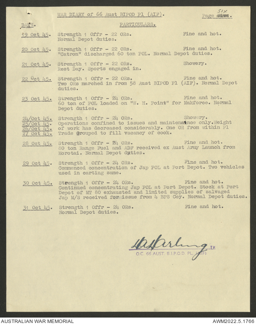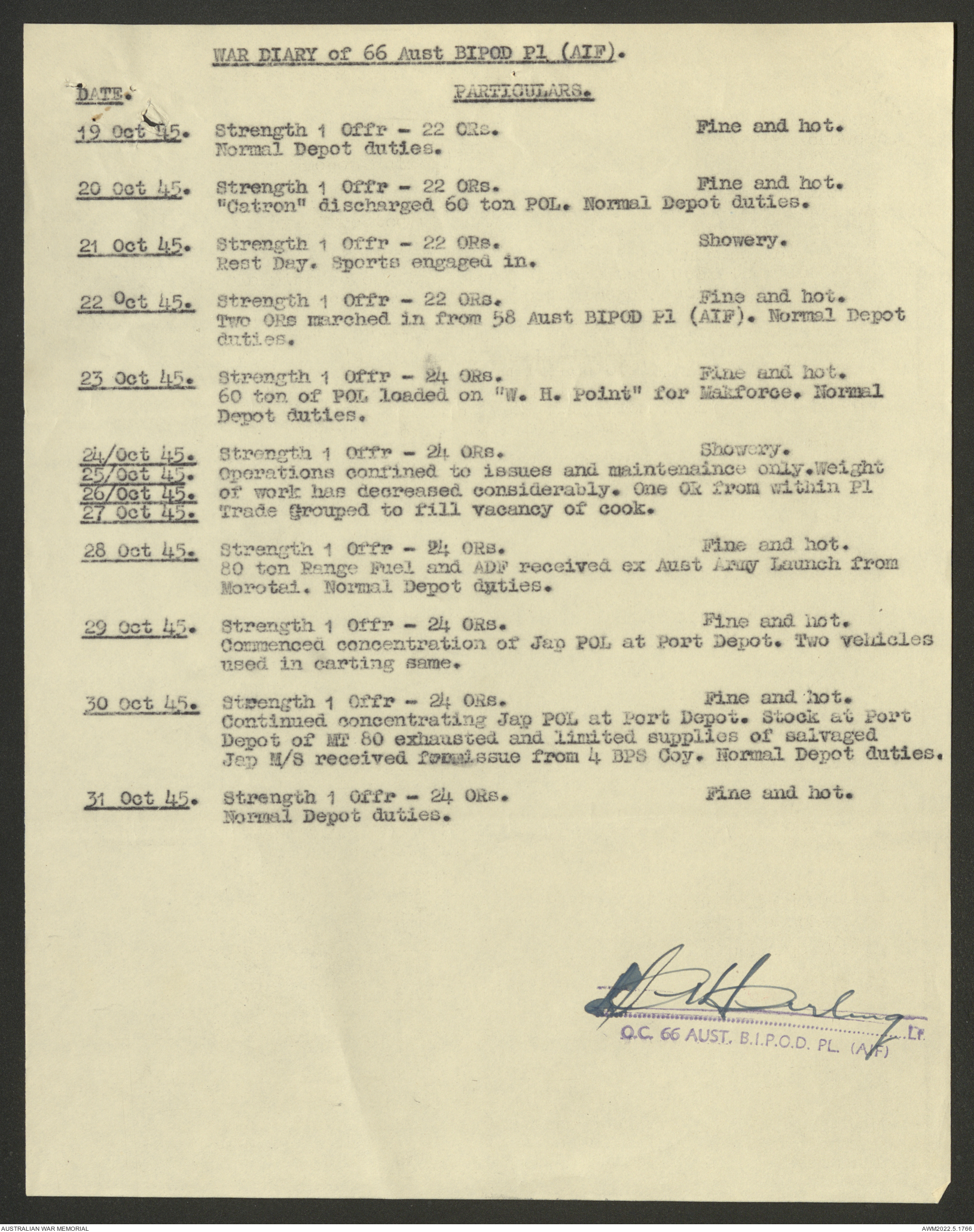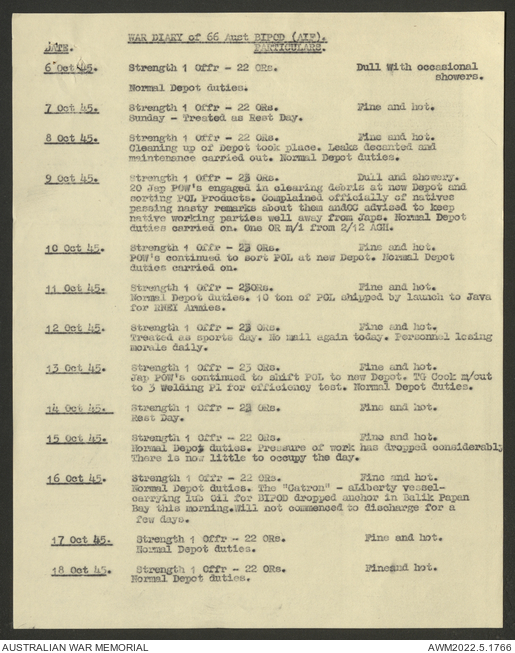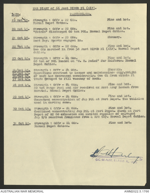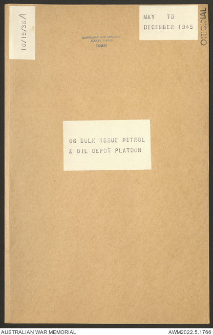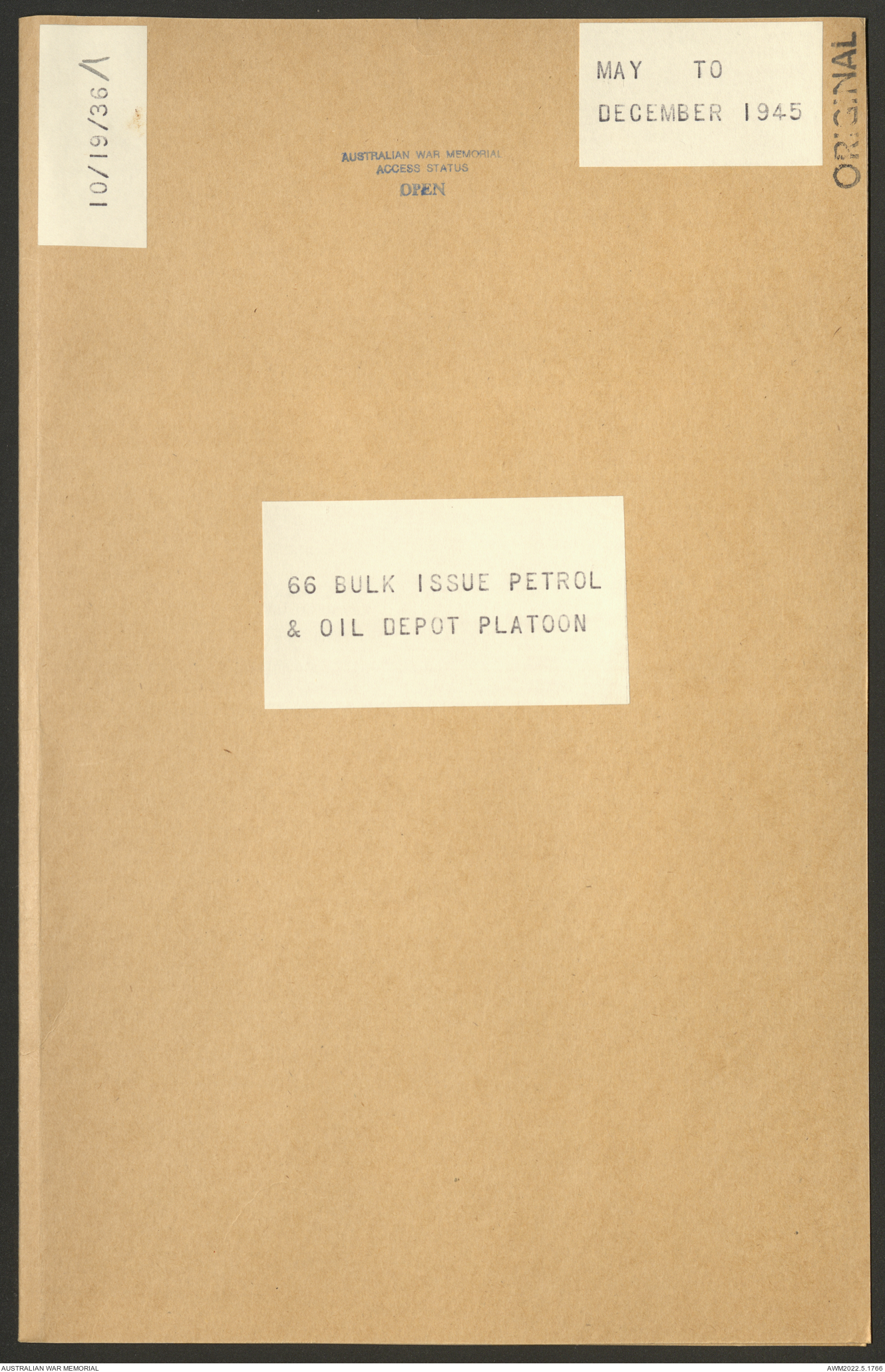 AWM52 10/19/36/1 - [Unit War Diaries, 1939-45 War] 66 Australian BIPOD [Bulk Issue Petrol and Oil Depot] Platoon, May - December 1945