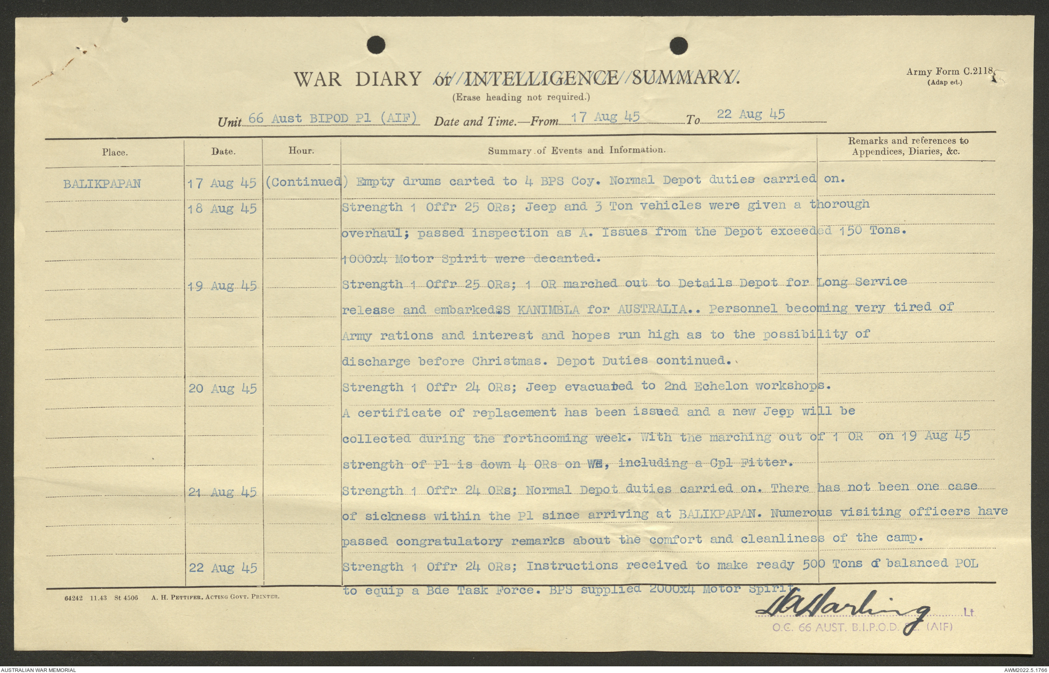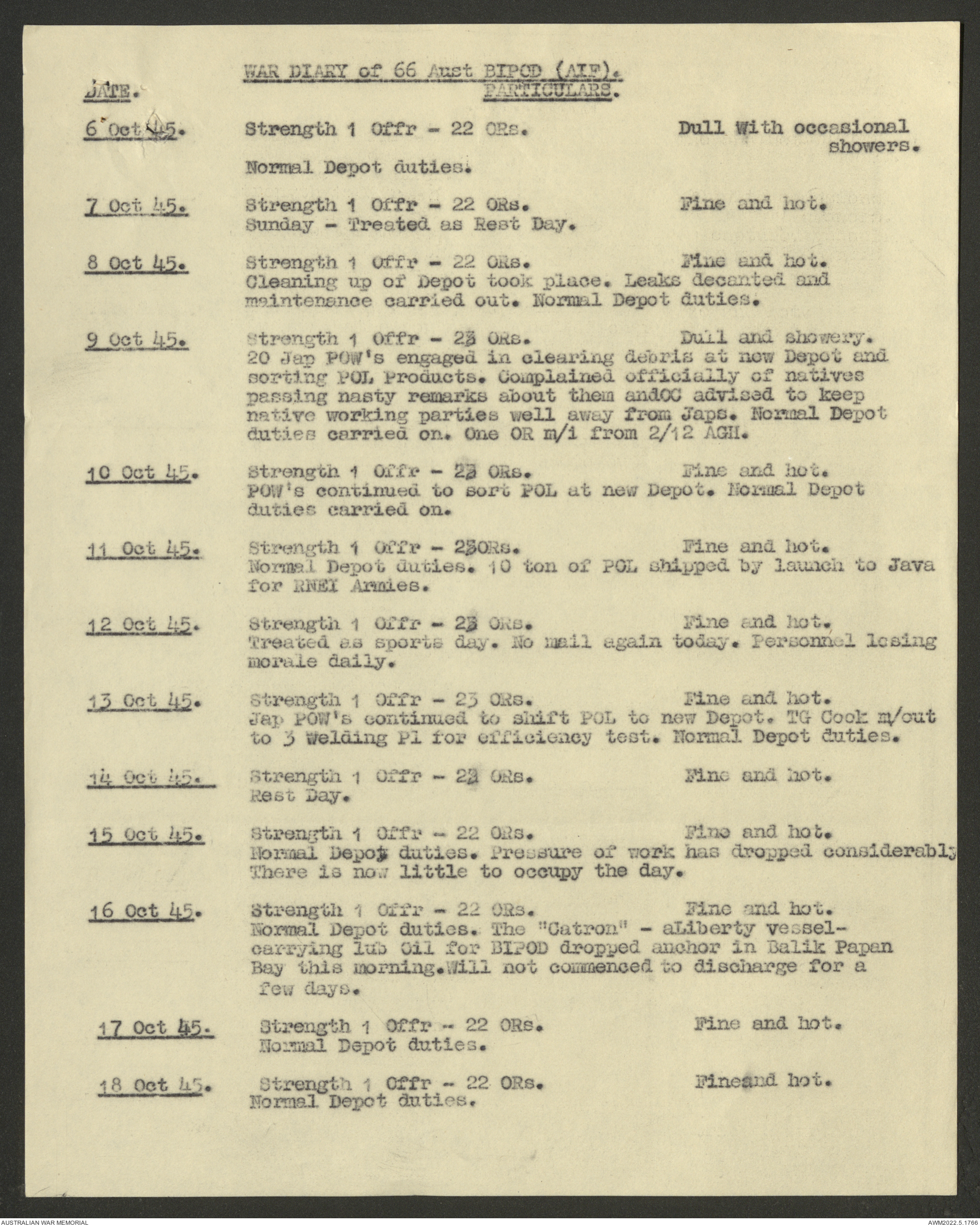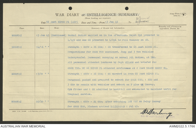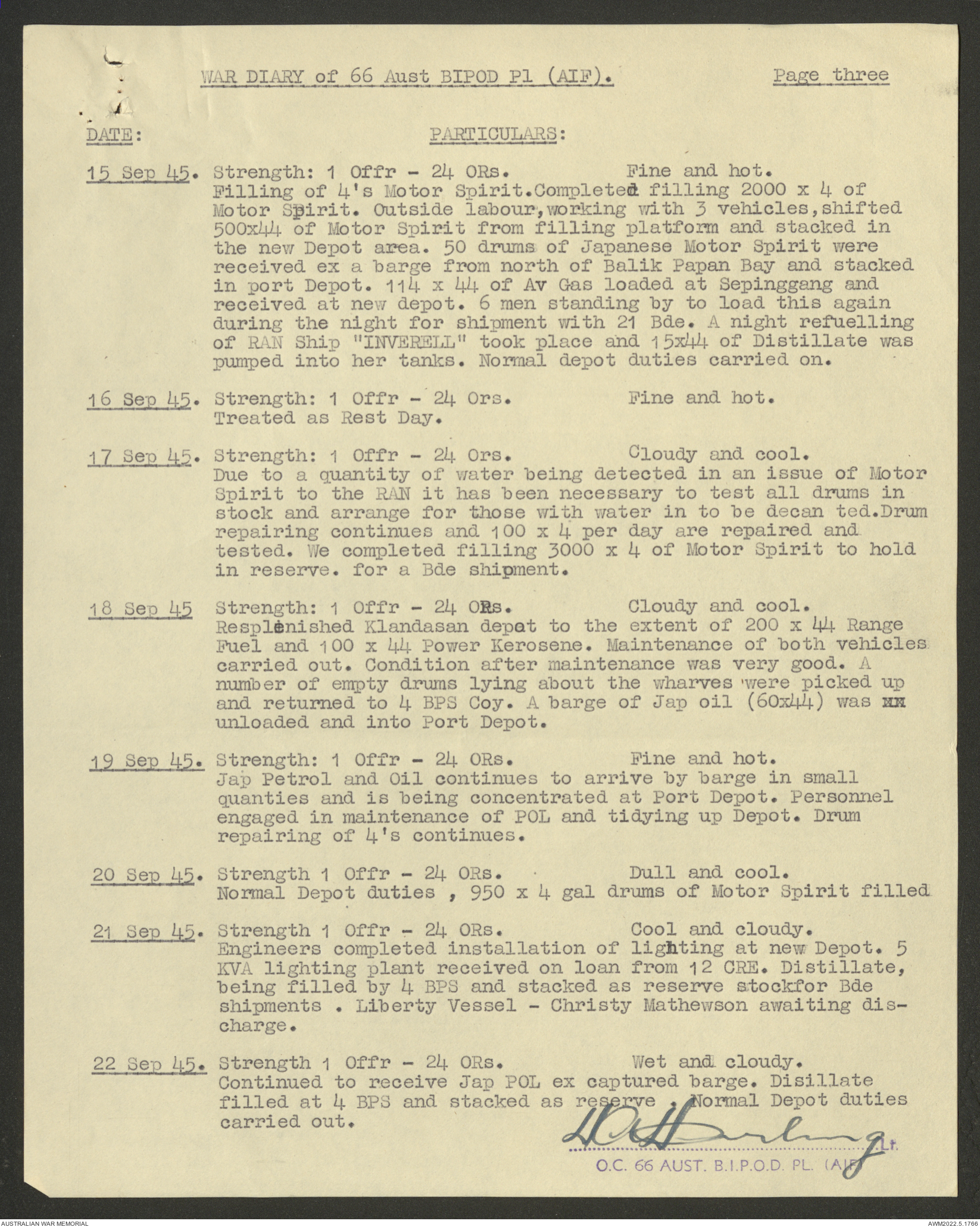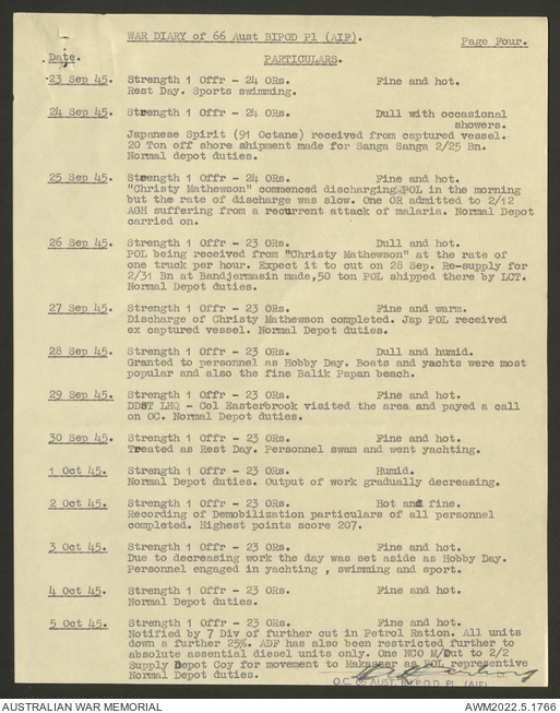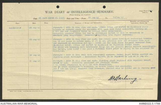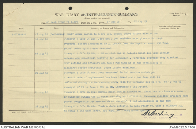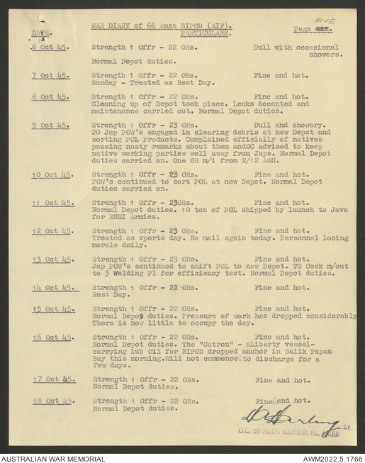 AWM52 10/19/36/1 - [Unit War Diaries, 1939-45 War] 66 Australian BIPOD [Bulk Issue Petrol and Oil Depot] Platoon, May - December 1945
