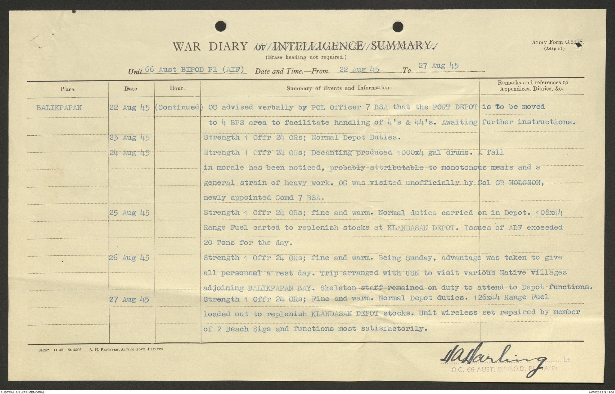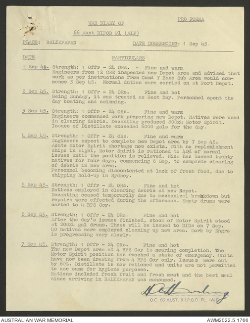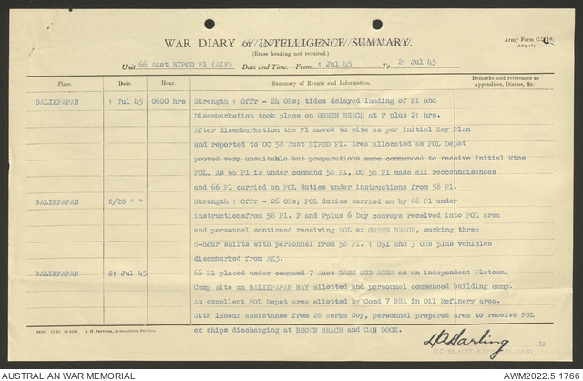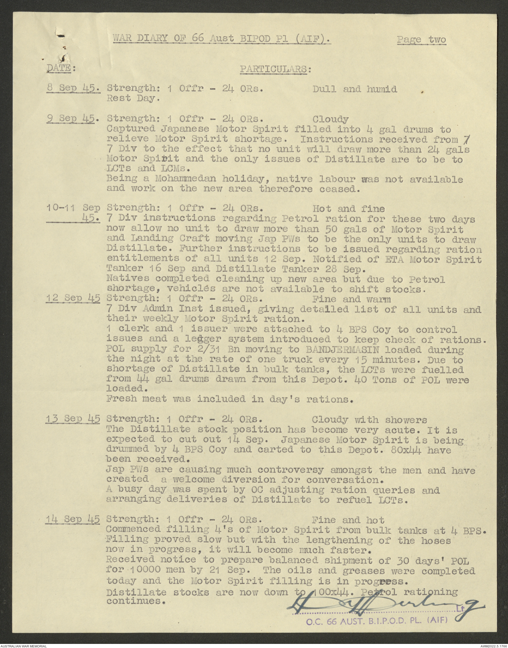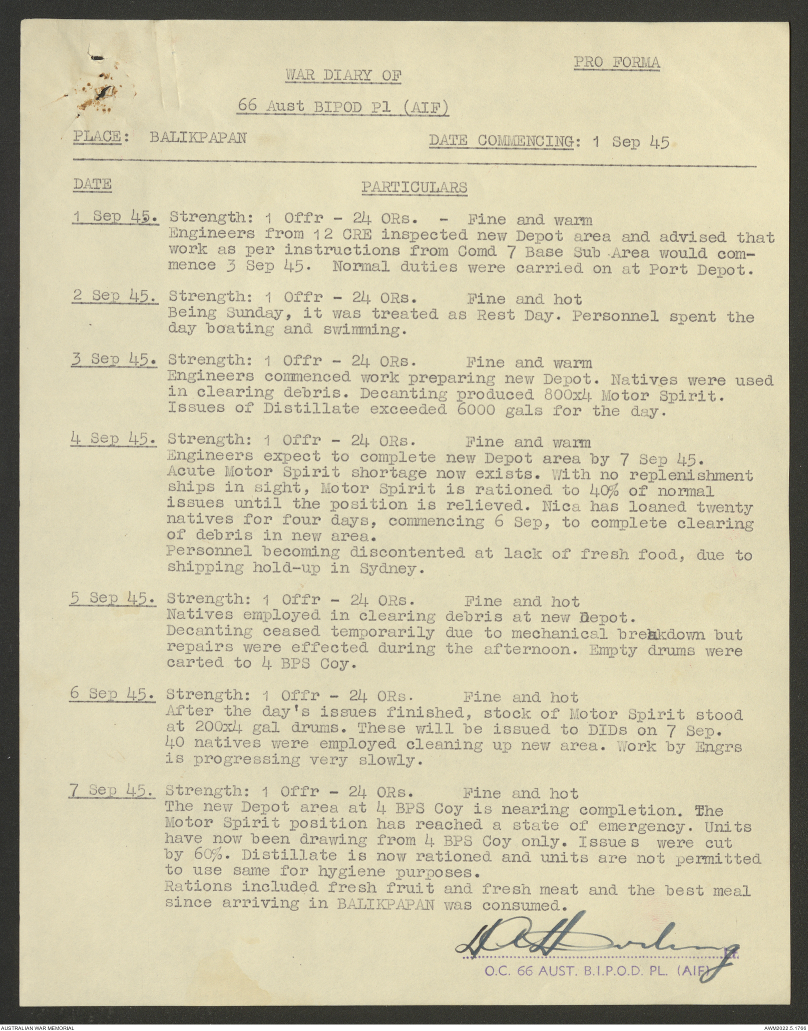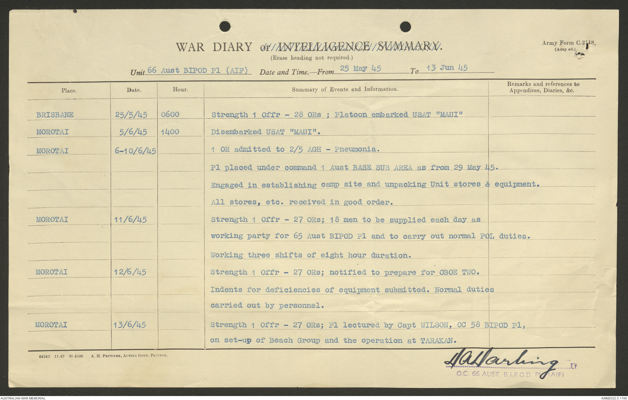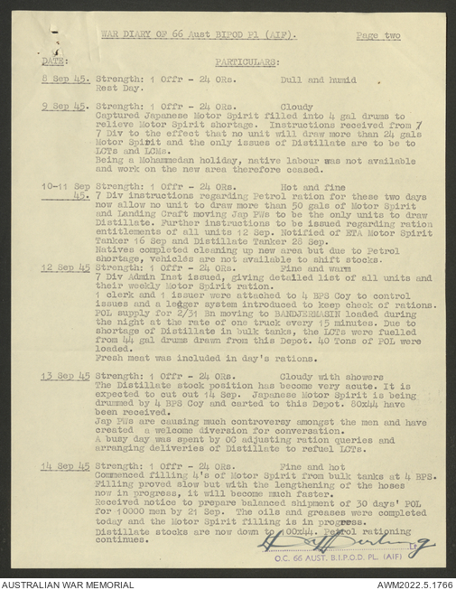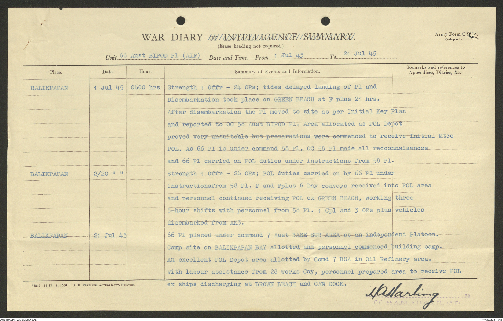 AWM52 10/19/36/1 - [Unit War Diaries, 1939-45 War] 66 Australian BIPOD [Bulk Issue Petrol and Oil Depot] Platoon, May - December 1945