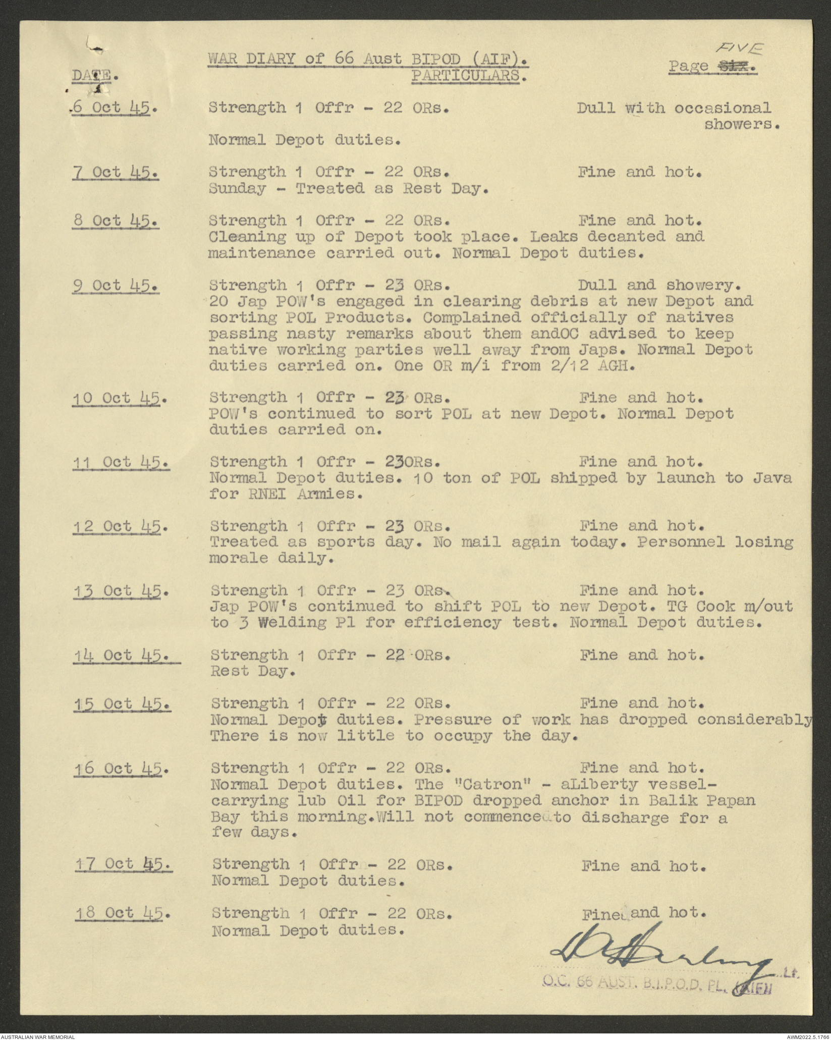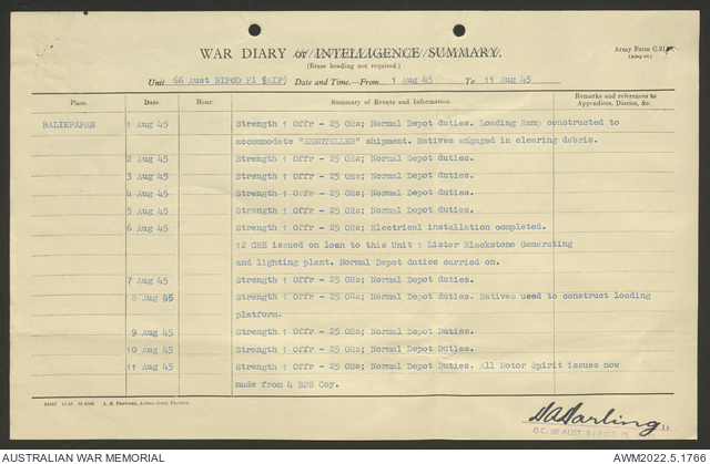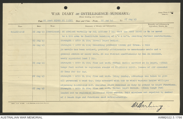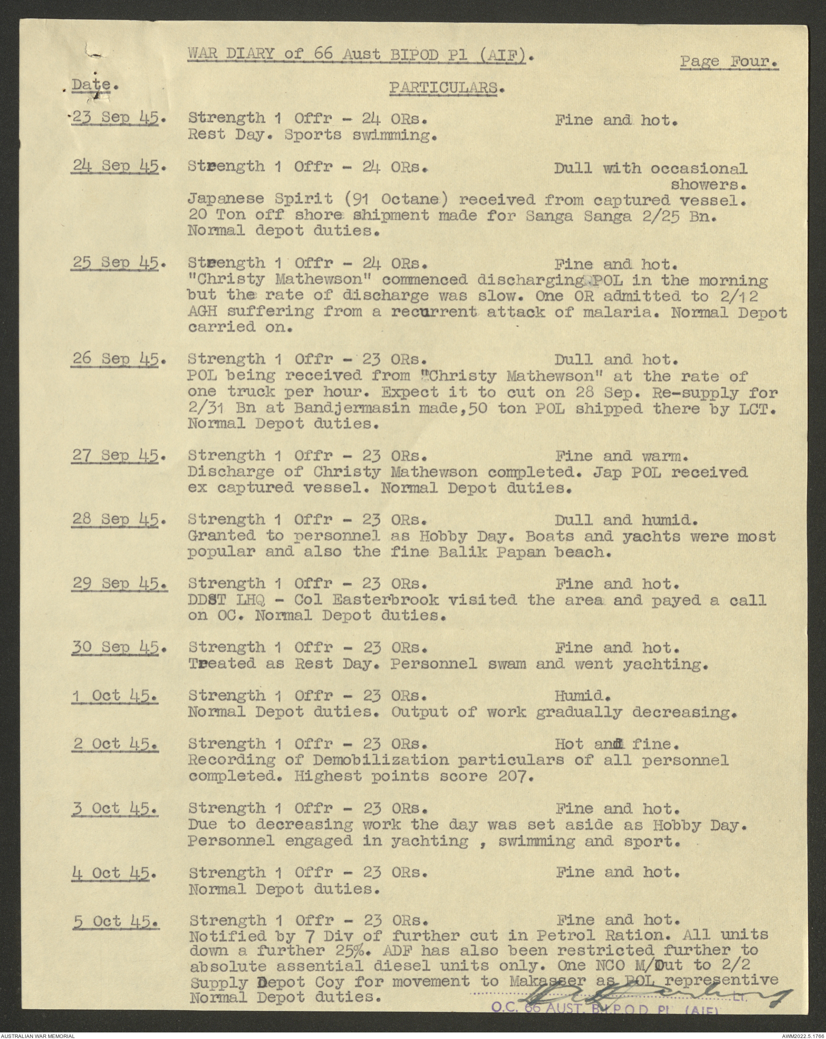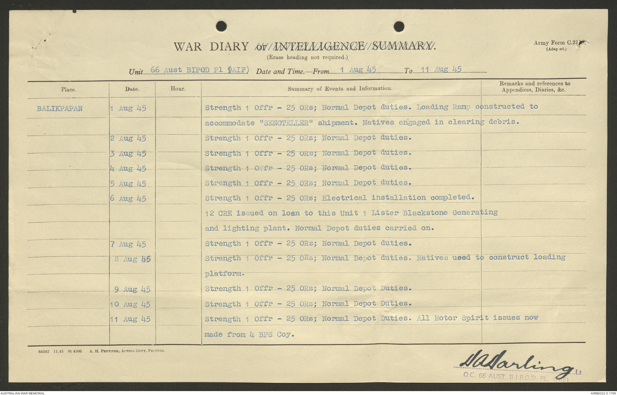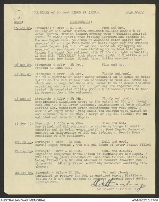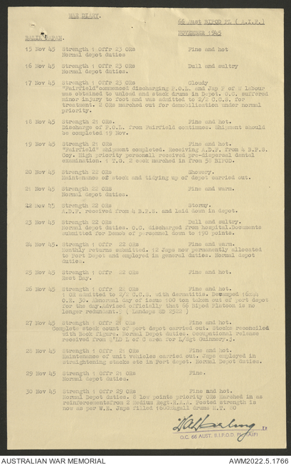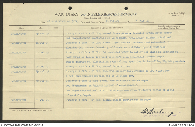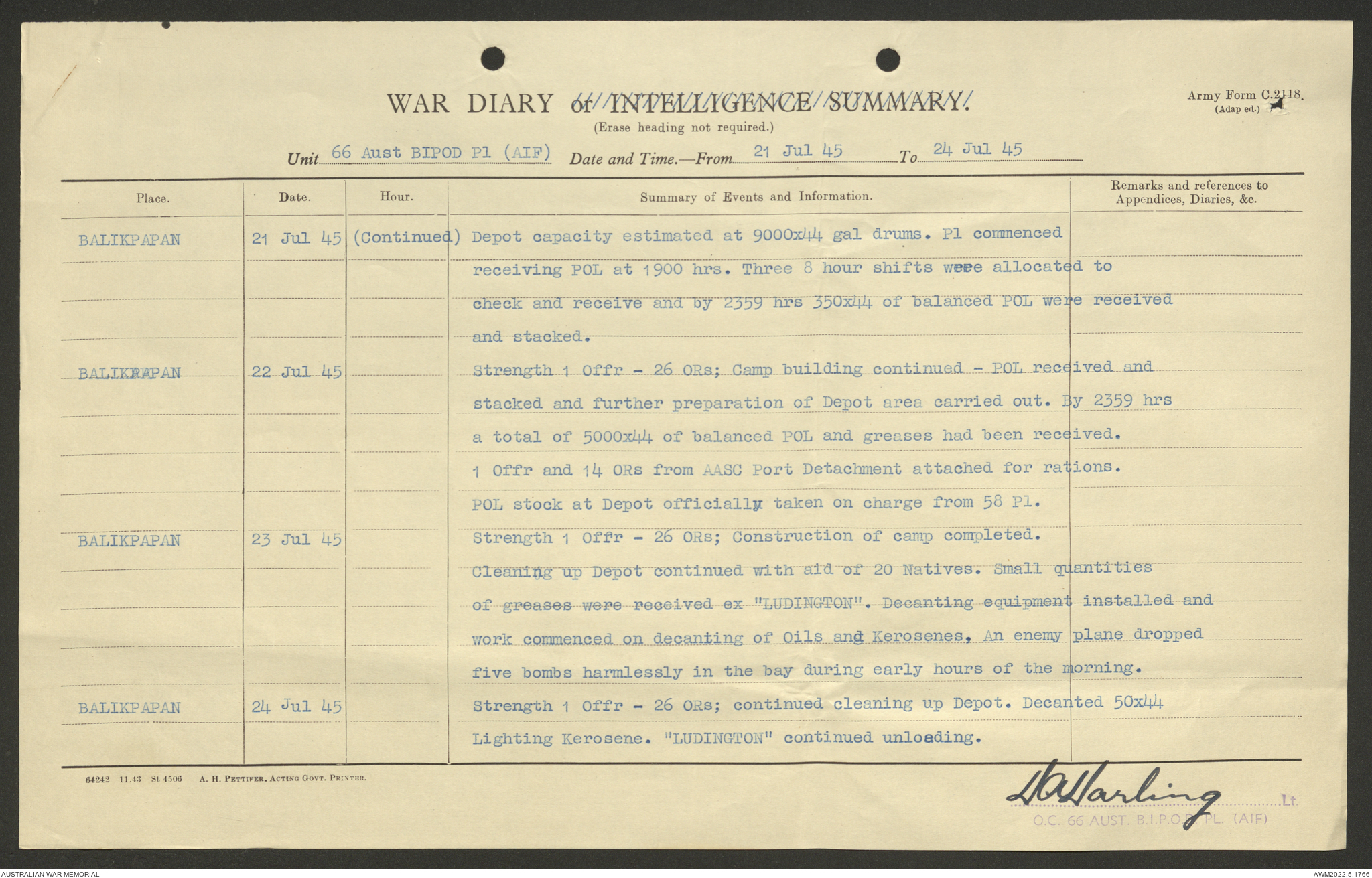 AWM52 10/19/36/1 - [Unit War Diaries, 1939-45 War] 66 Australian BIPOD [Bulk Issue Petrol and Oil Depot] Platoon, May - December 1945