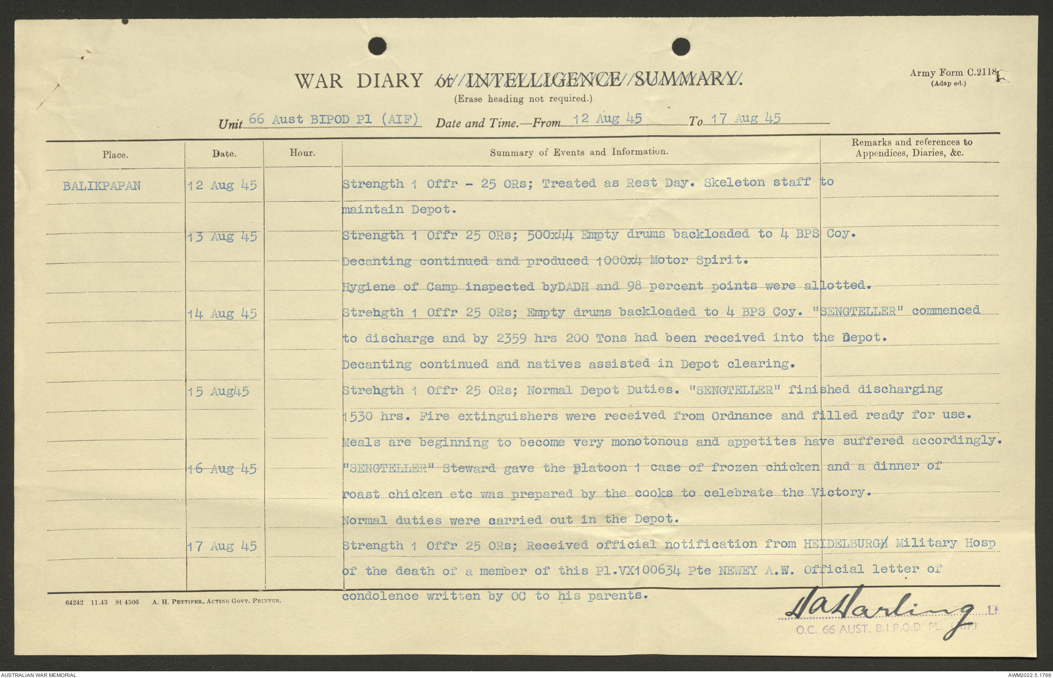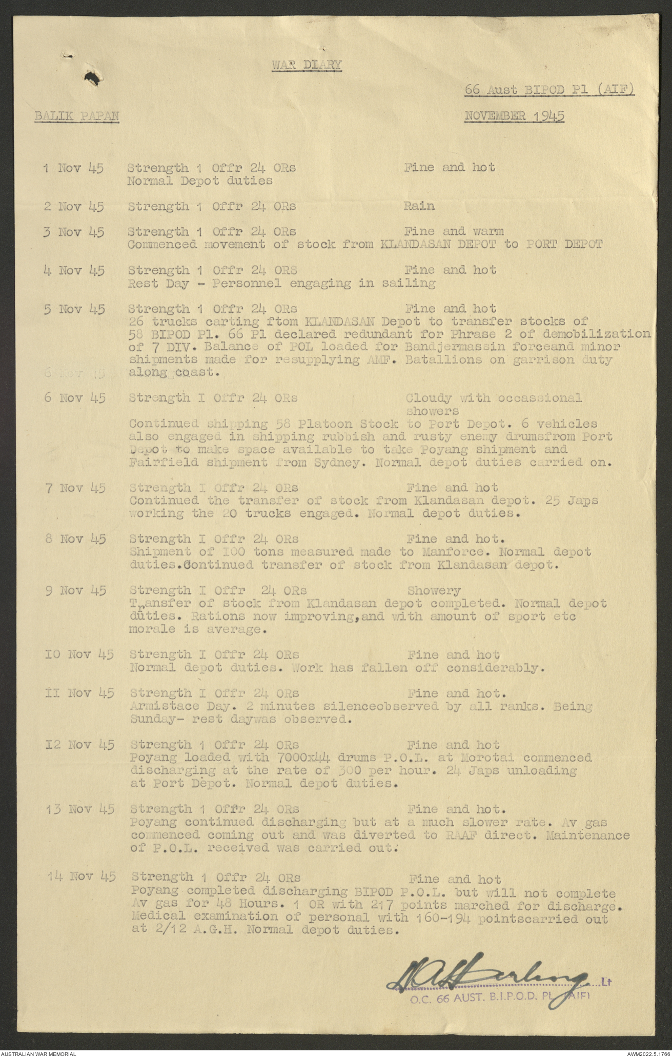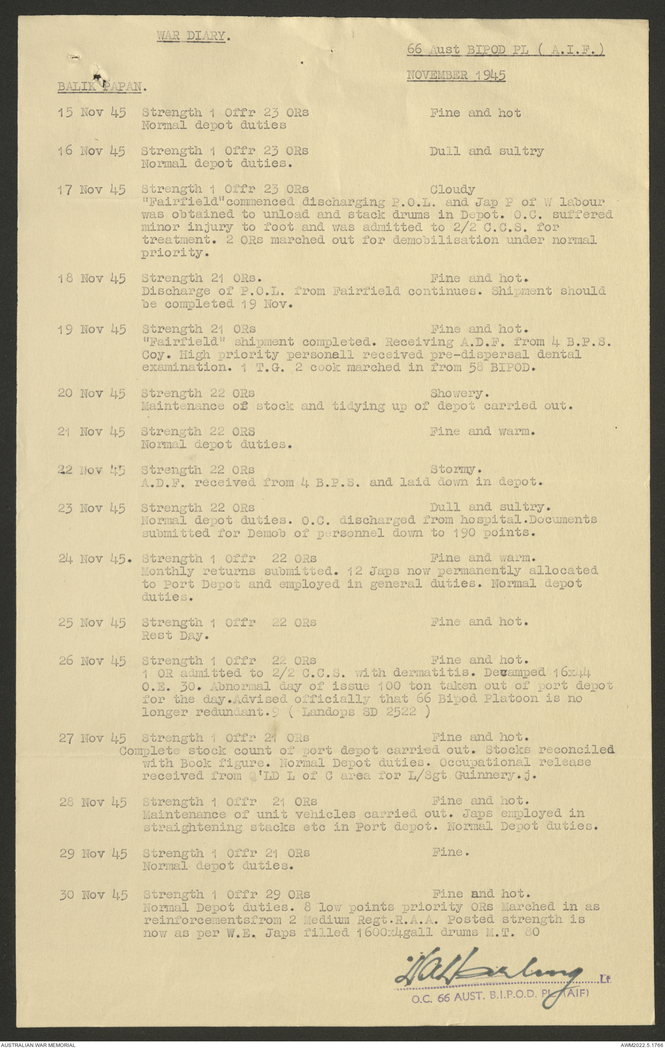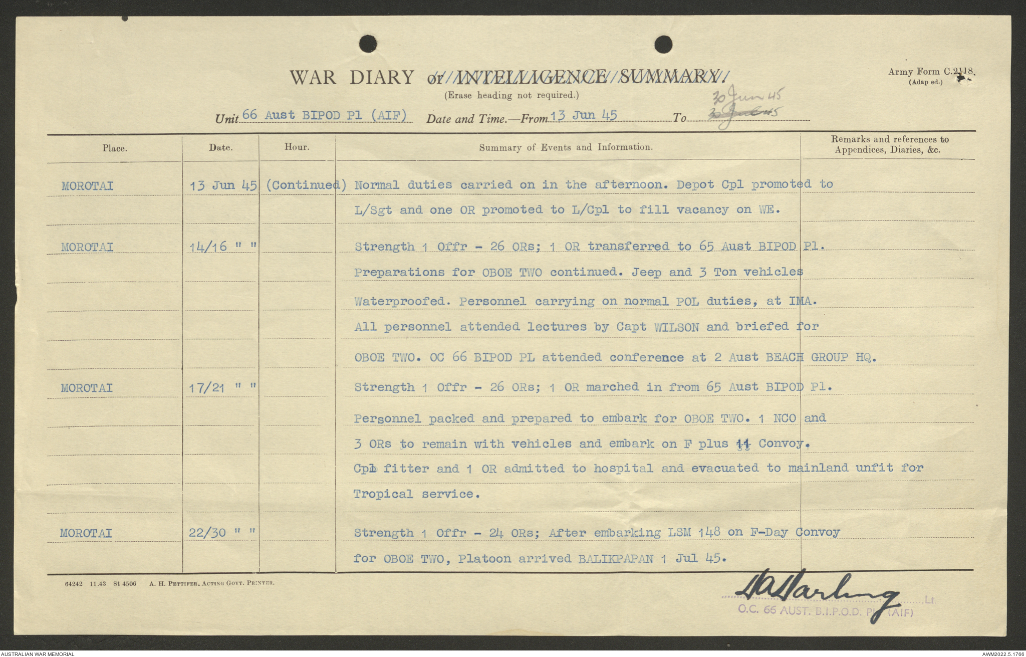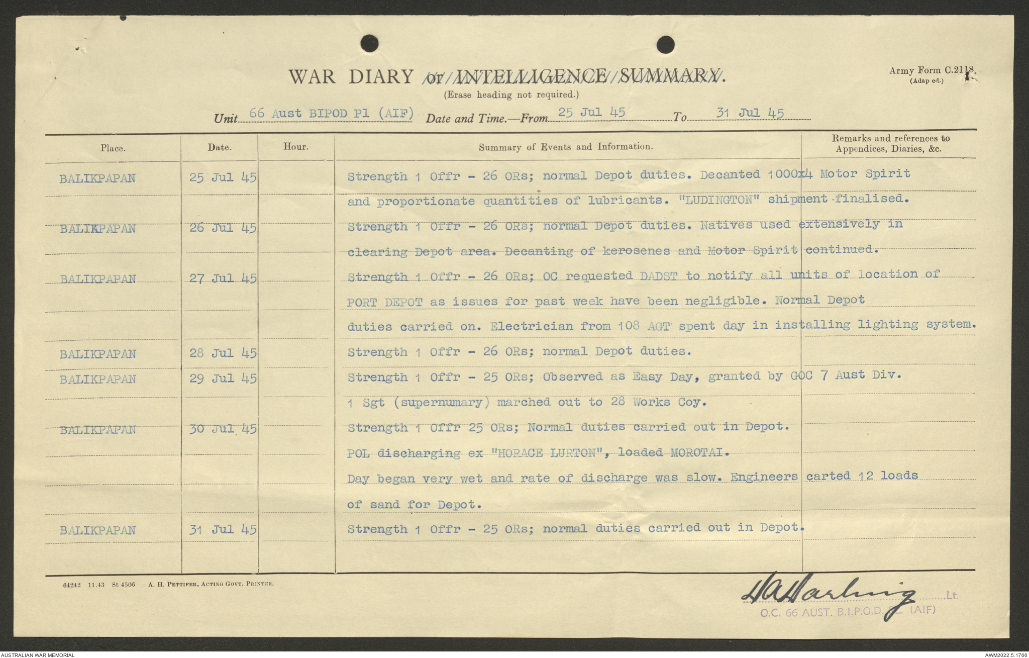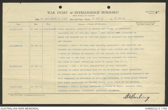 AWM52 10/19/36/1 - [Unit War Diaries, 1939-45 War] 66 Australian BIPOD [Bulk Issue Petrol and Oil Depot] Platoon, May - December 1945