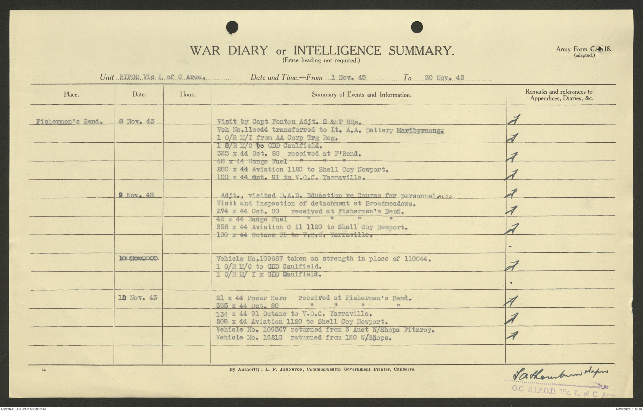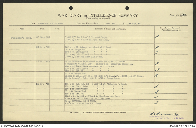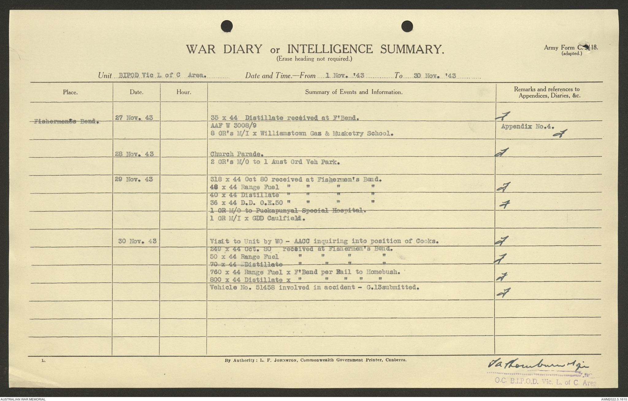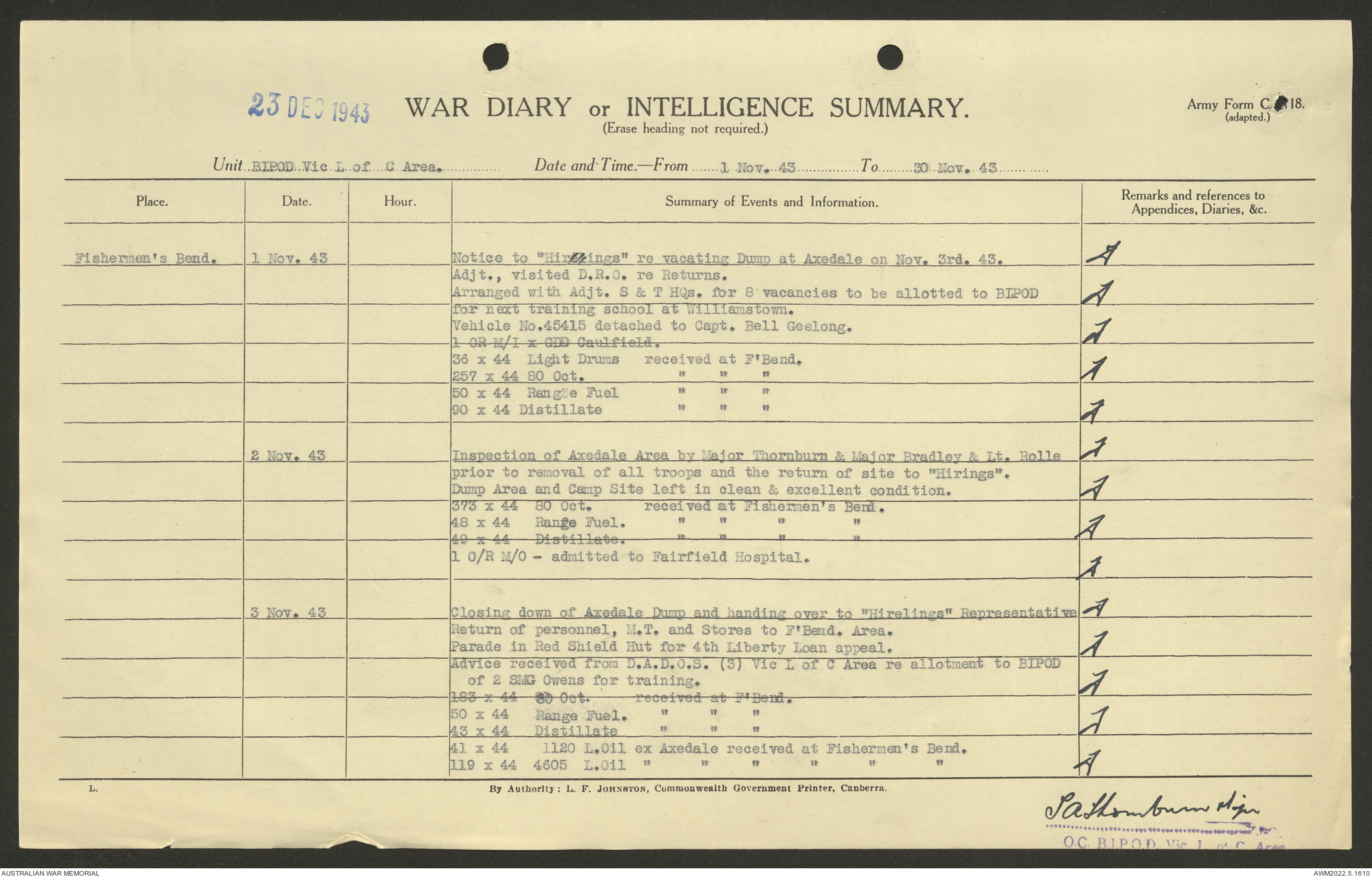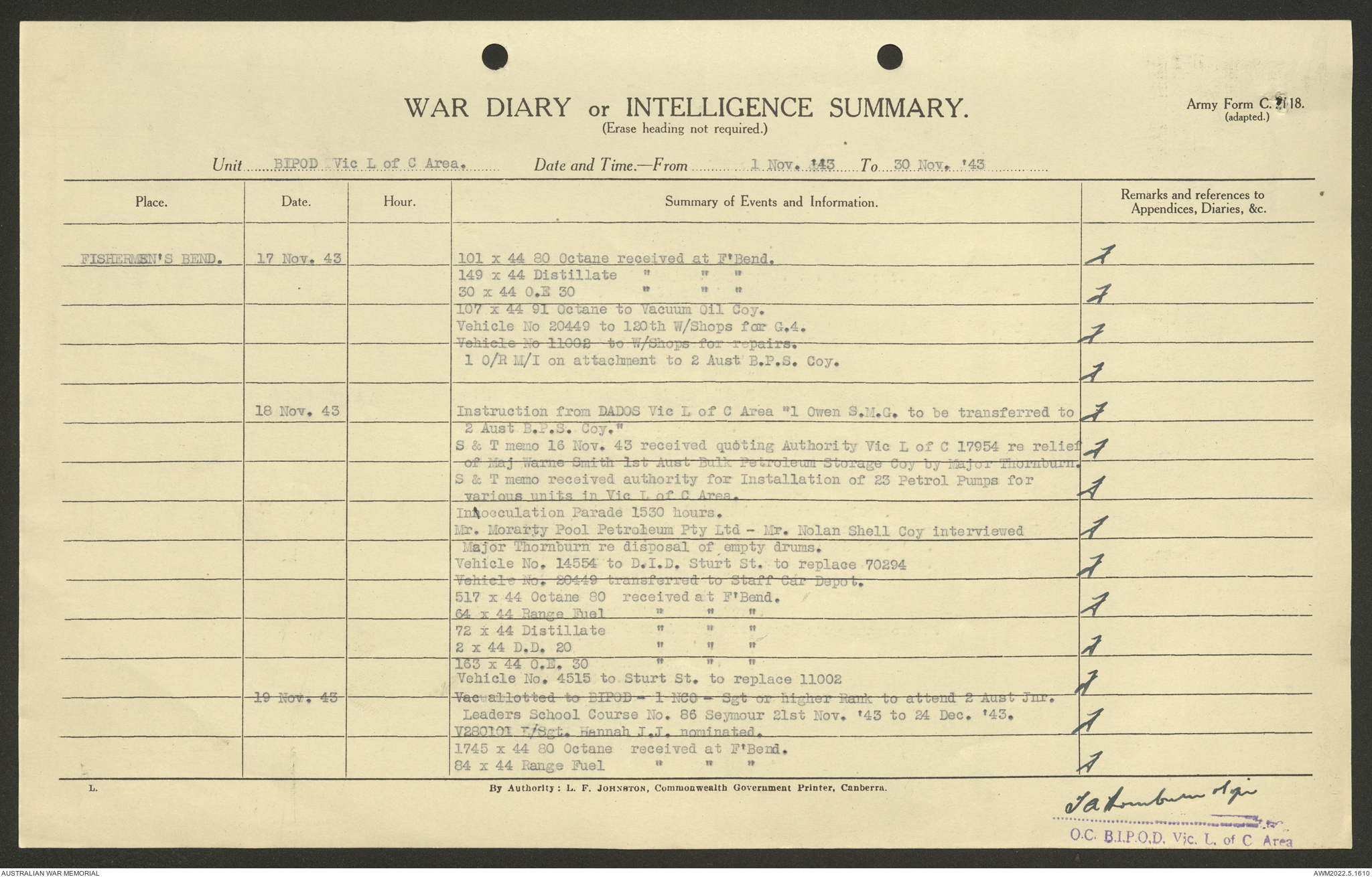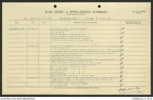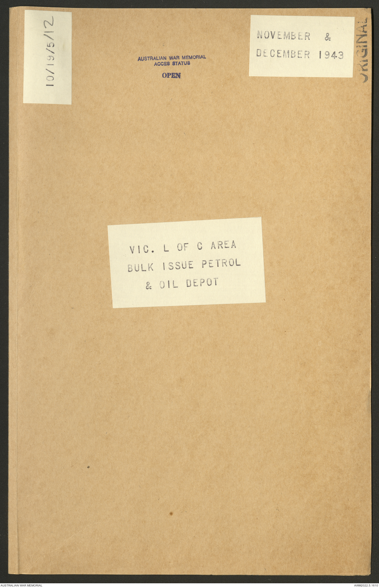 AWM52 10/19/5/12 - [Unit War Diaries, 1939-45 War] Victoria L of C [Lines of Communication] BIPOD [Bulk Issue Petrol and Oil Depot] November - December 1943