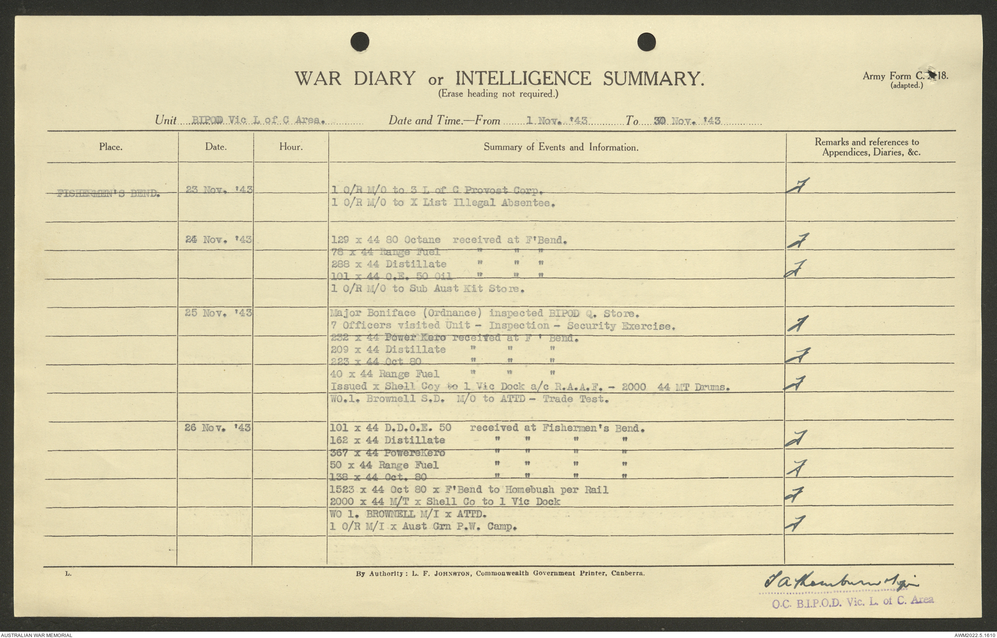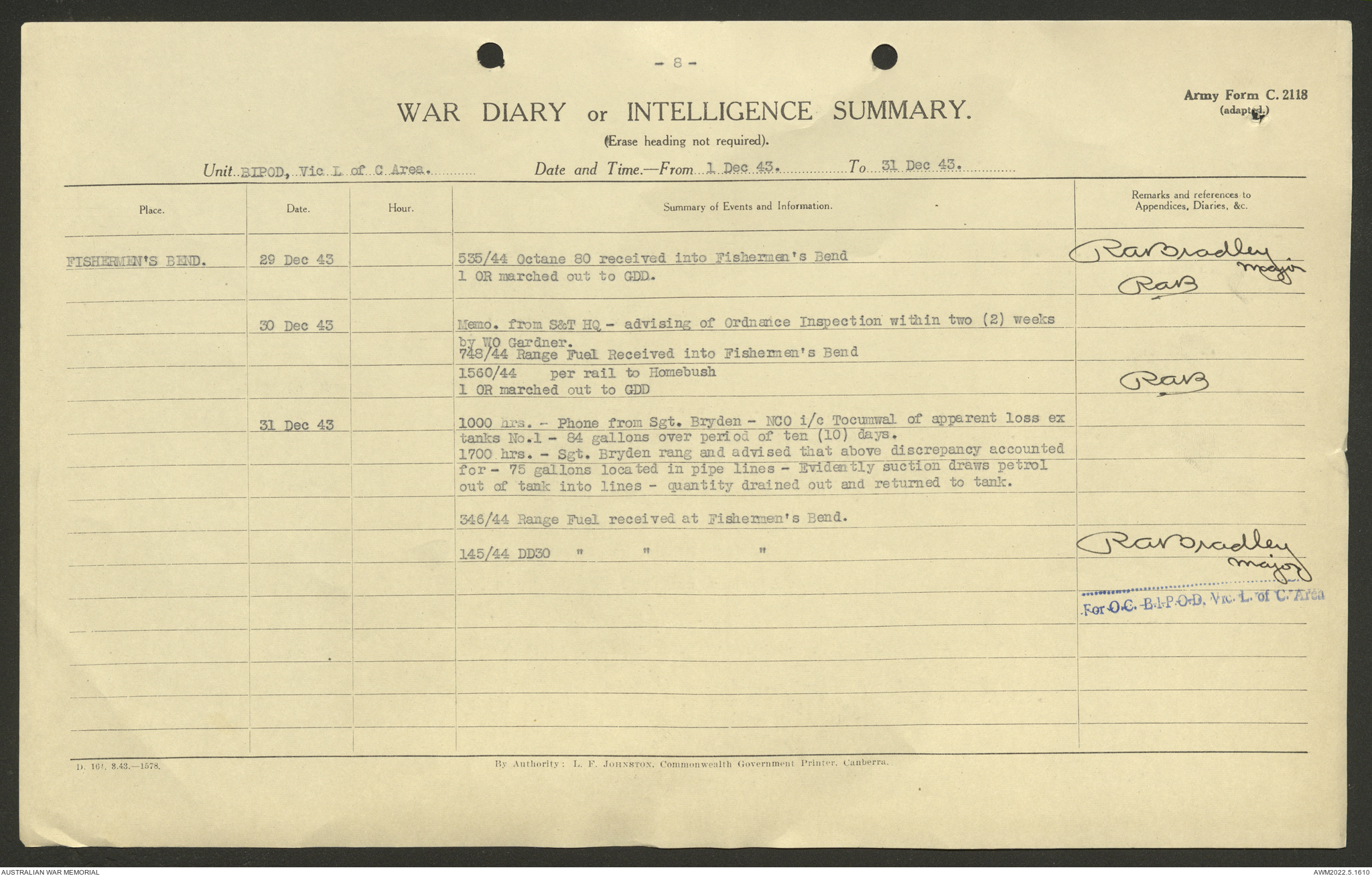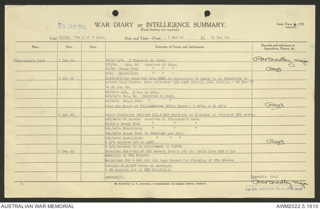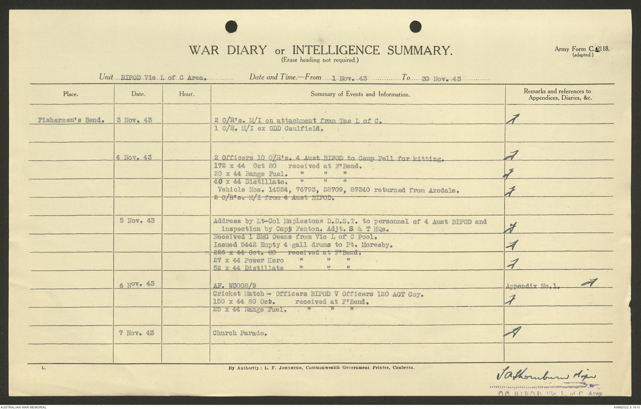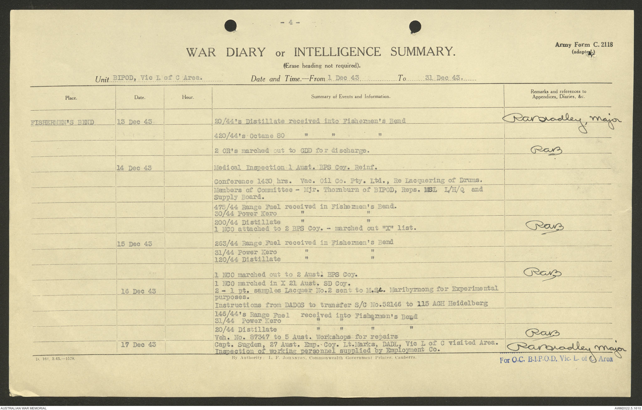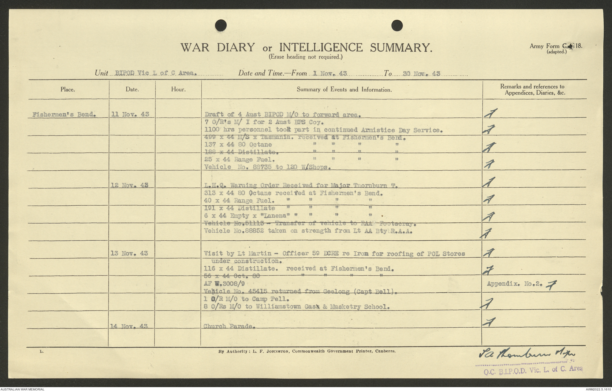 AWM52 10/19/5/12 - [Unit War Diaries, 1939-45 War] Victoria L of C [Lines of Communication] BIPOD [Bulk Issue Petrol and Oil Depot] November - December 1943