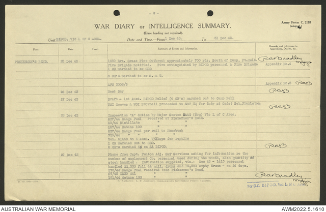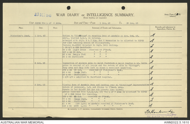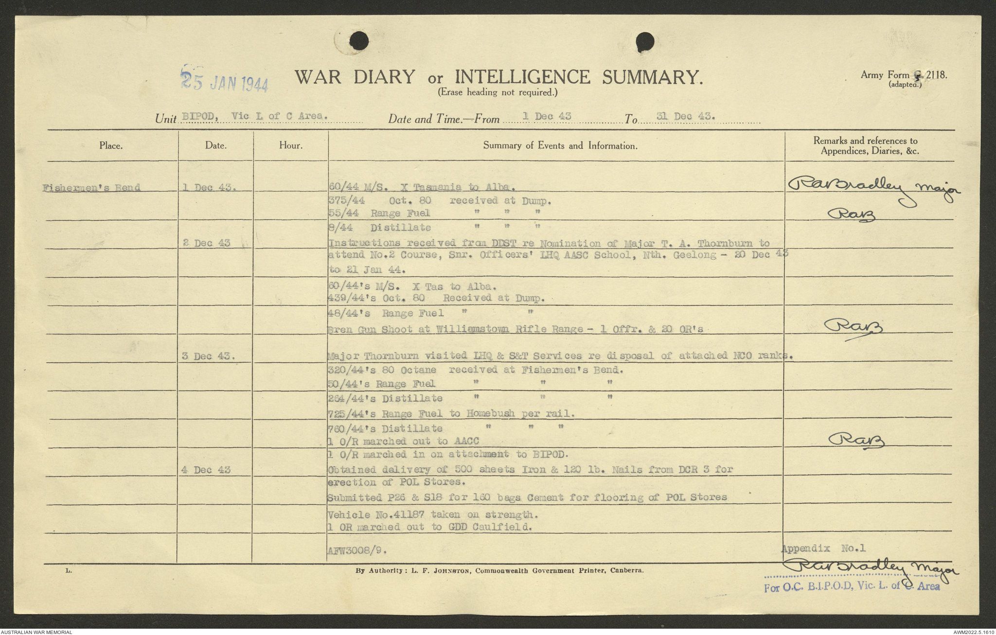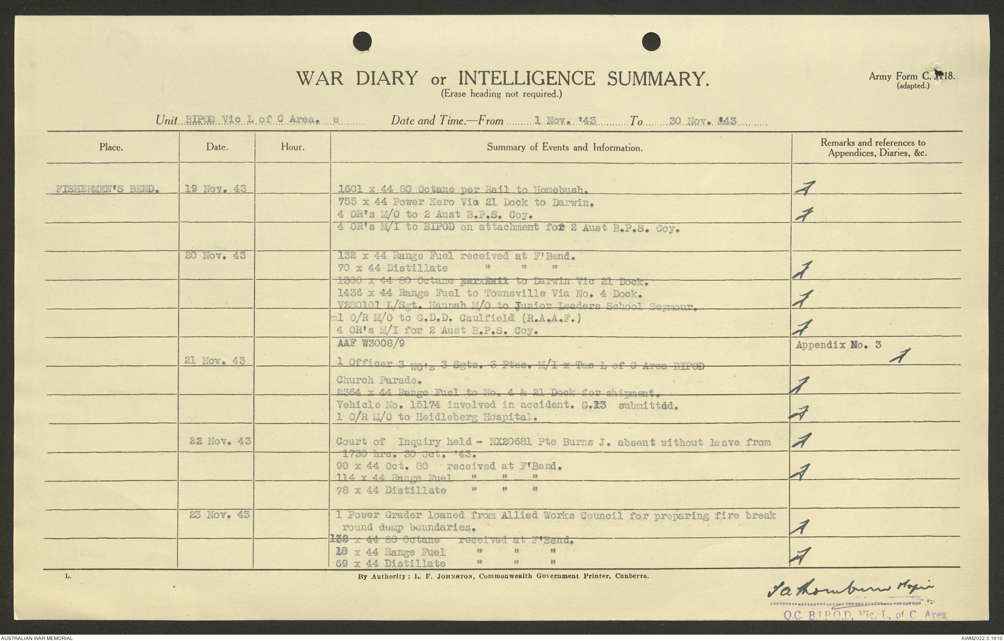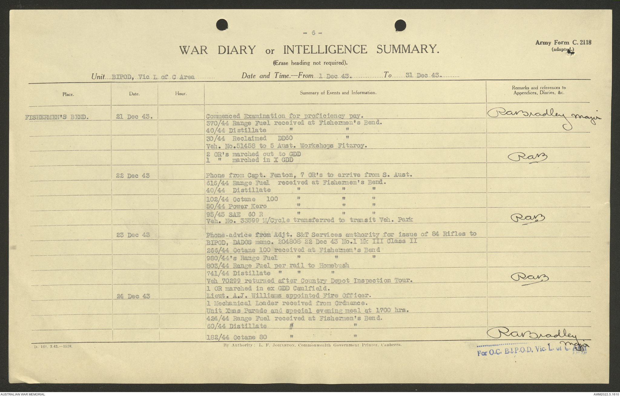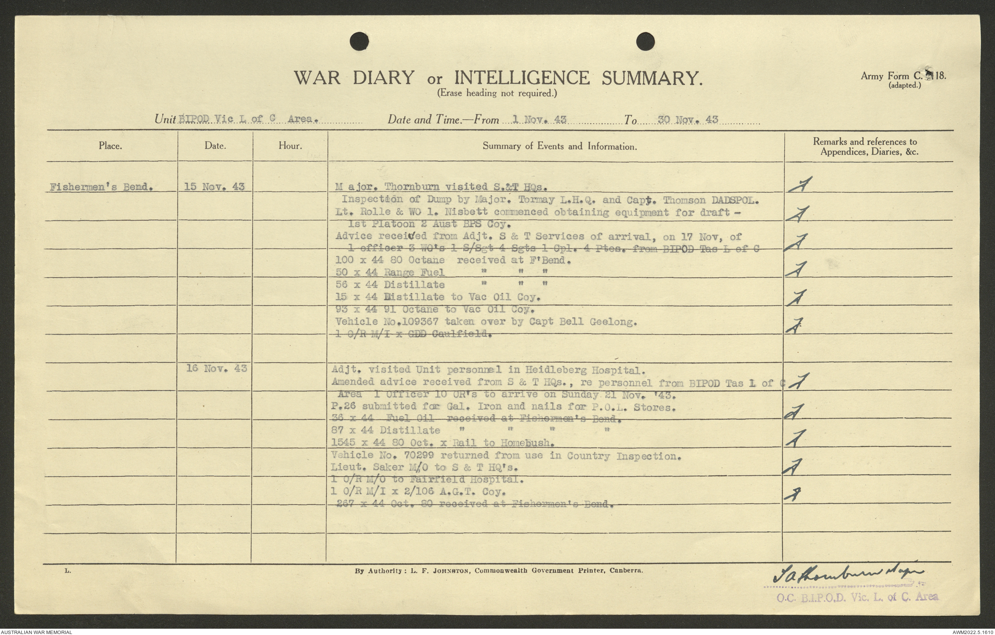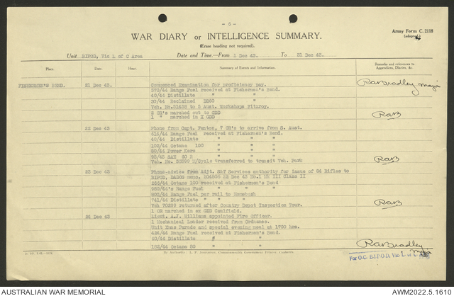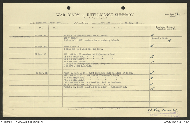 AWM52 10/19/5/12 - [Unit War Diaries, 1939-45 War] Victoria L of C [Lines of Communication] BIPOD [Bulk Issue Petrol and Oil Depot] November - December 1943