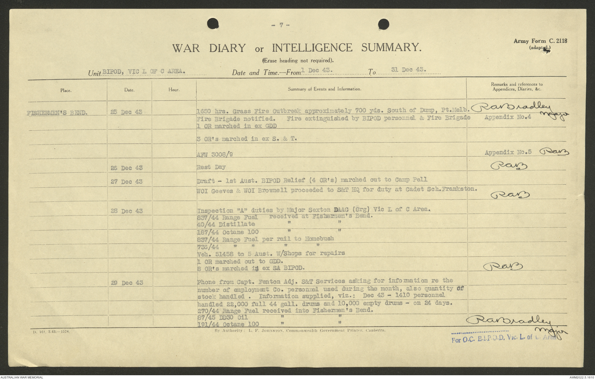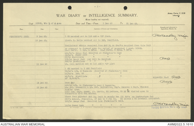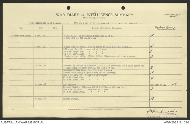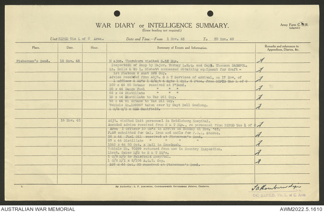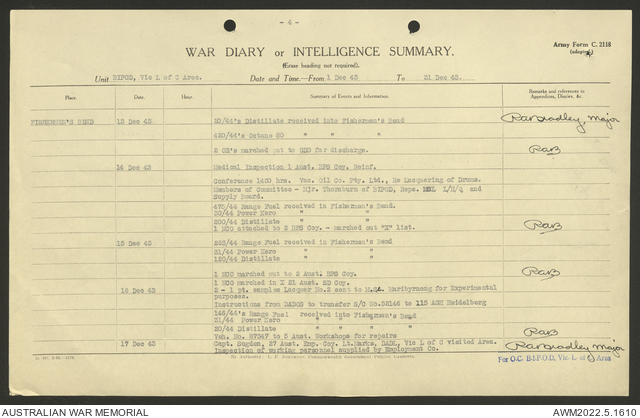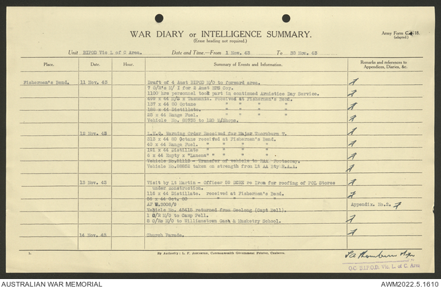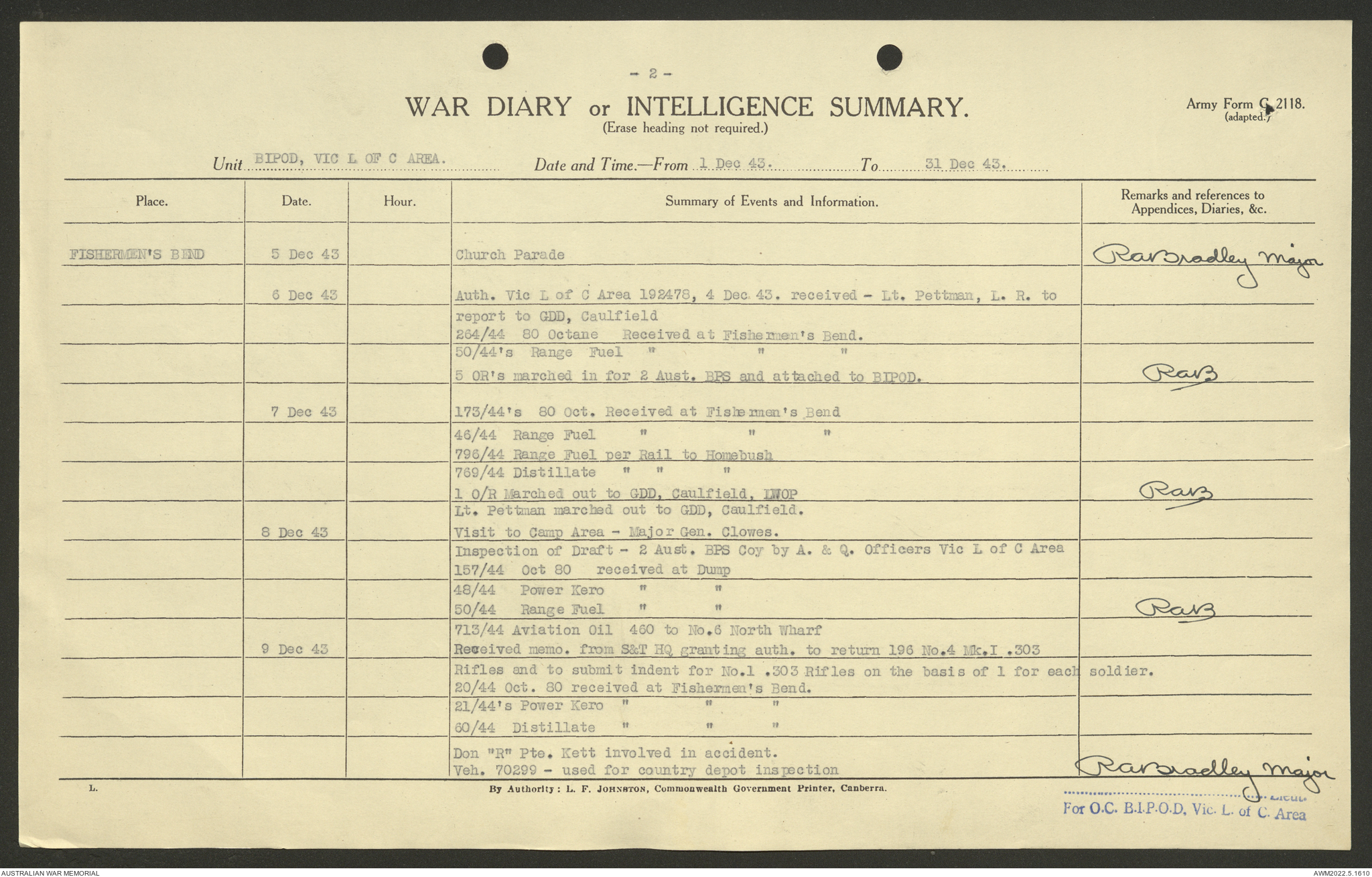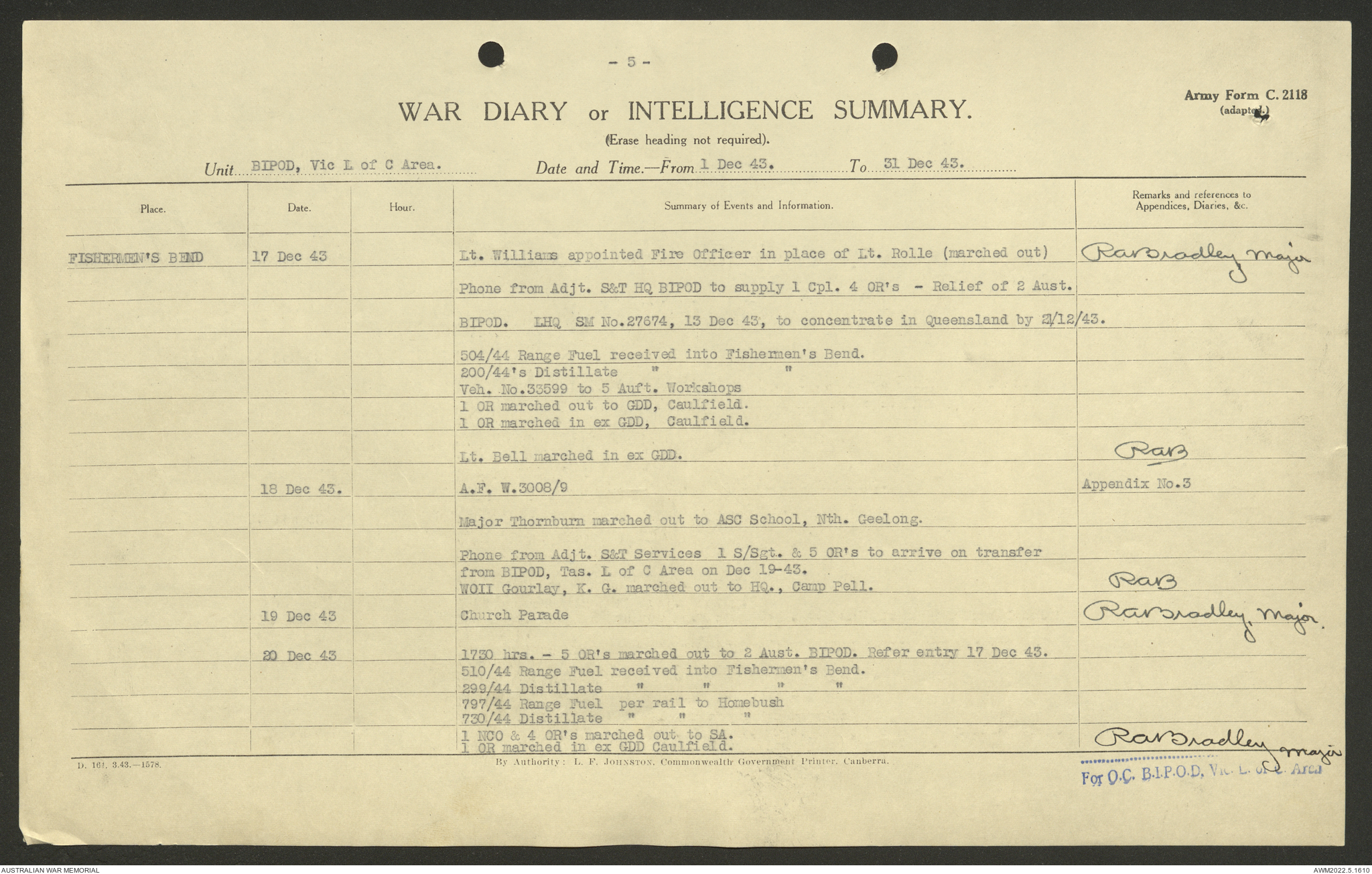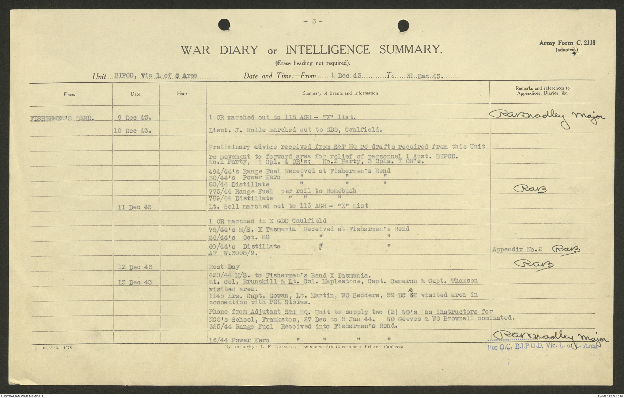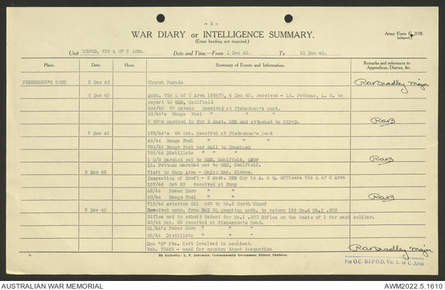 AWM52 10/19/5/12 - [Unit War Diaries, 1939-45 War] Victoria L of C [Lines of Communication] BIPOD [Bulk Issue Petrol and Oil Depot] November - December 1943