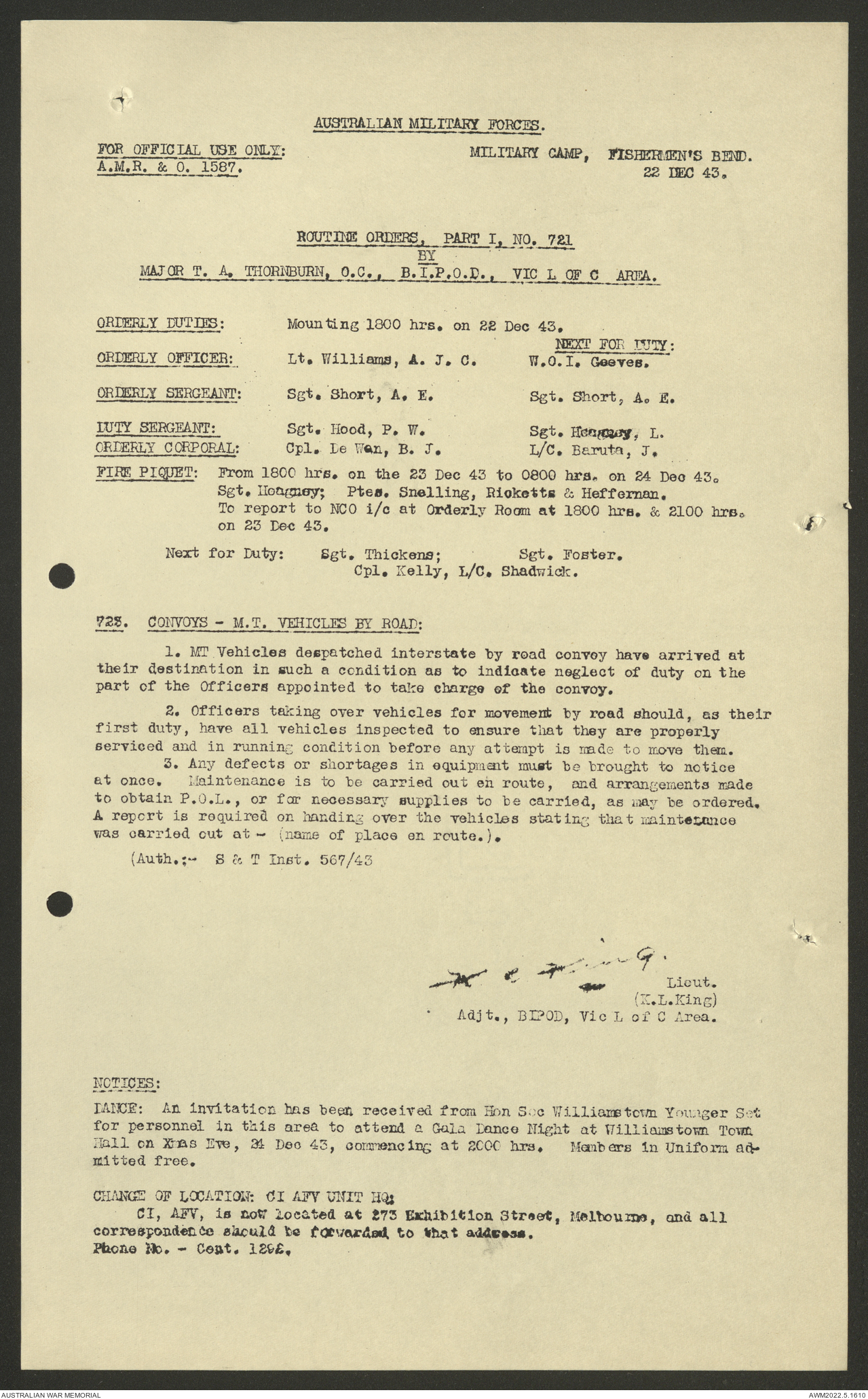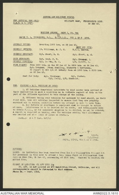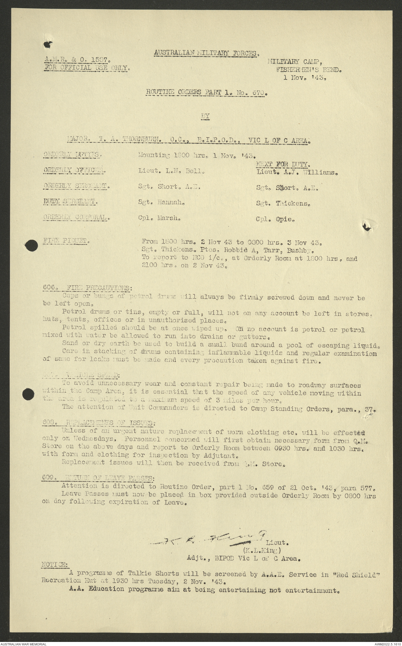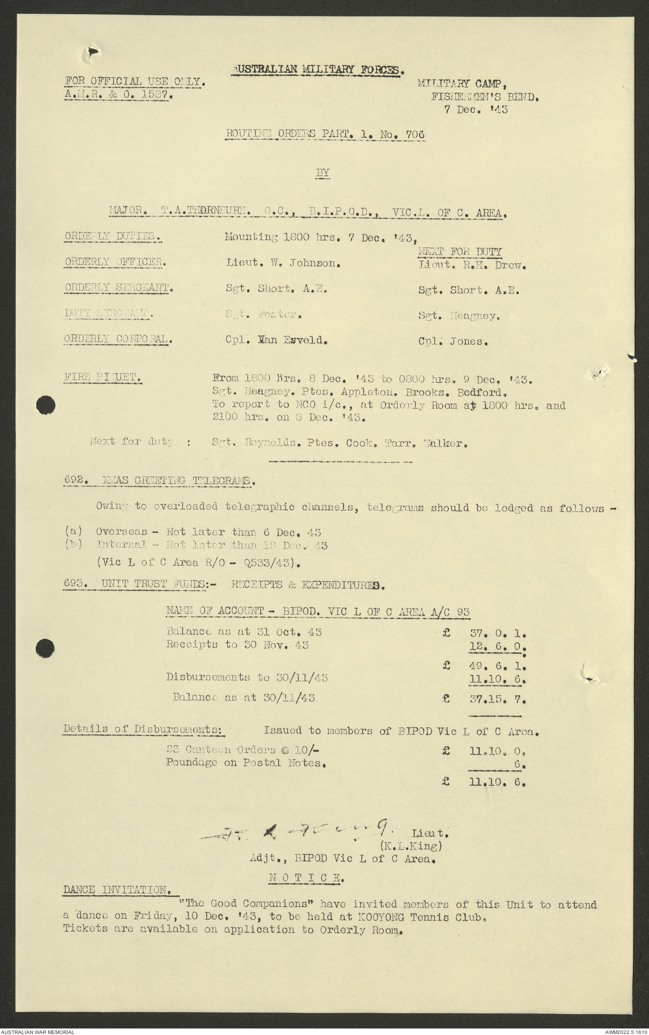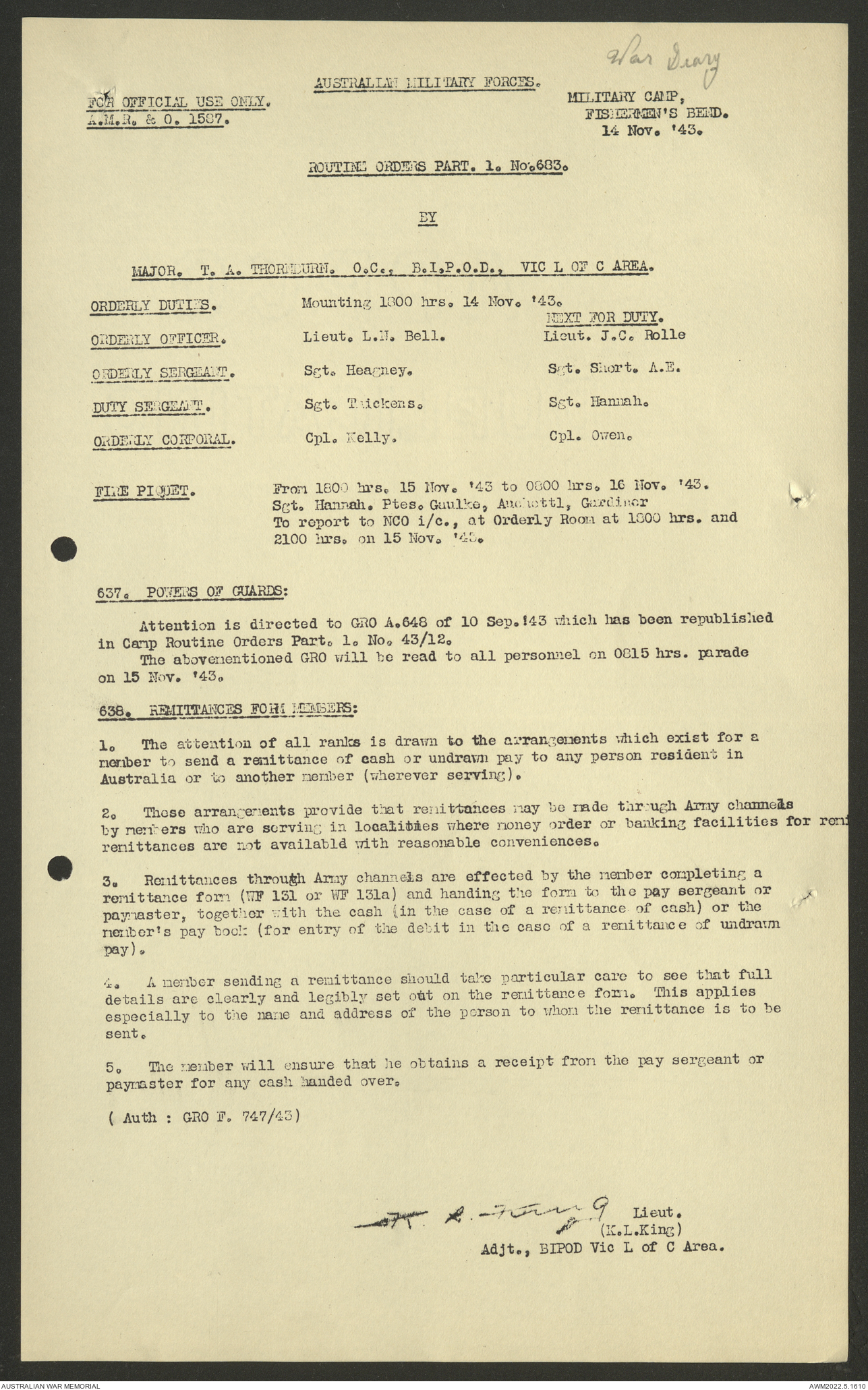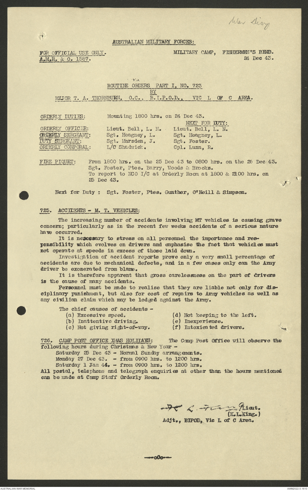 AWM52 10/19/5/12 - [Unit War Diaries, 1939-45 War] Victoria L of C [Lines of Communication] BIPOD [Bulk Issue Petrol and Oil Depot] November - December 1943