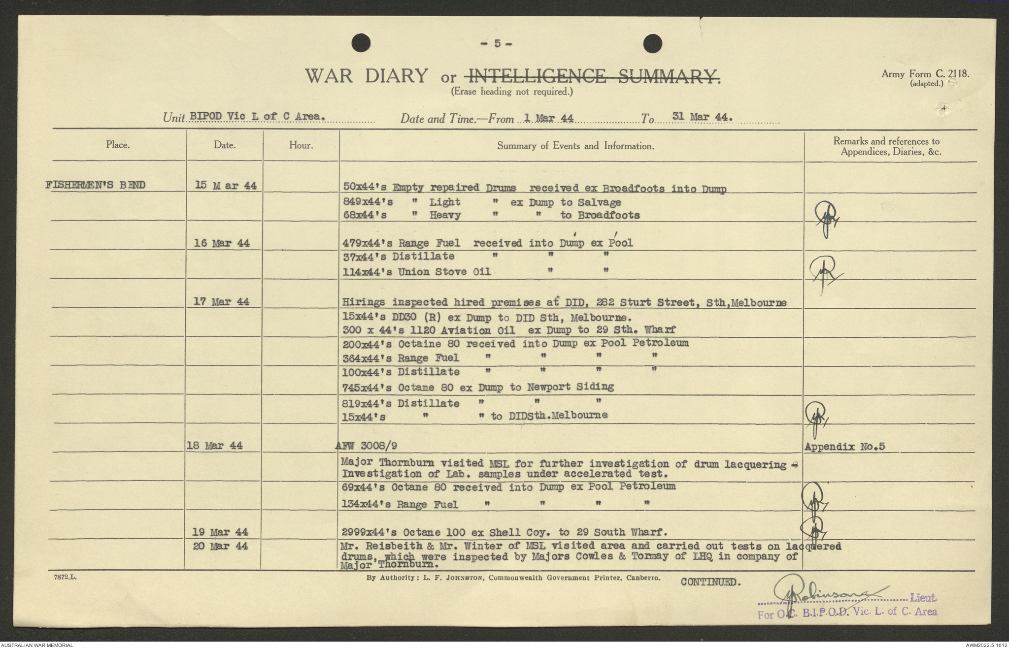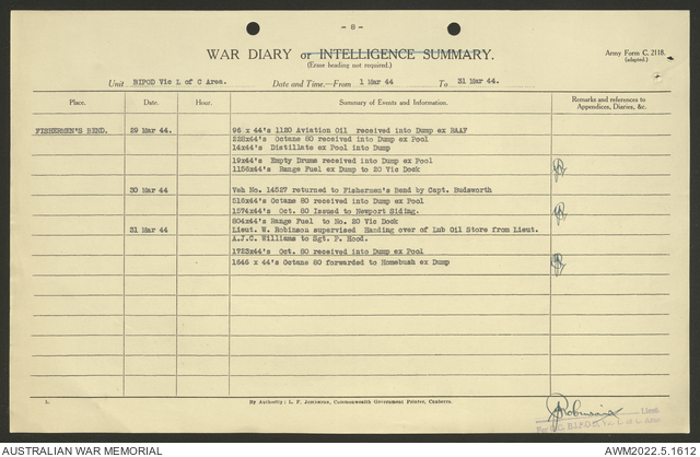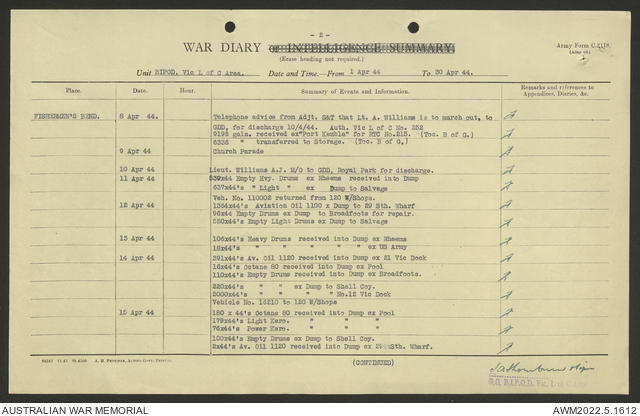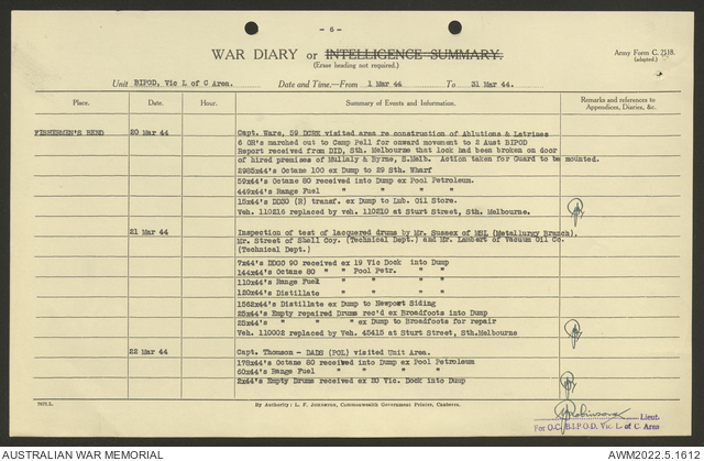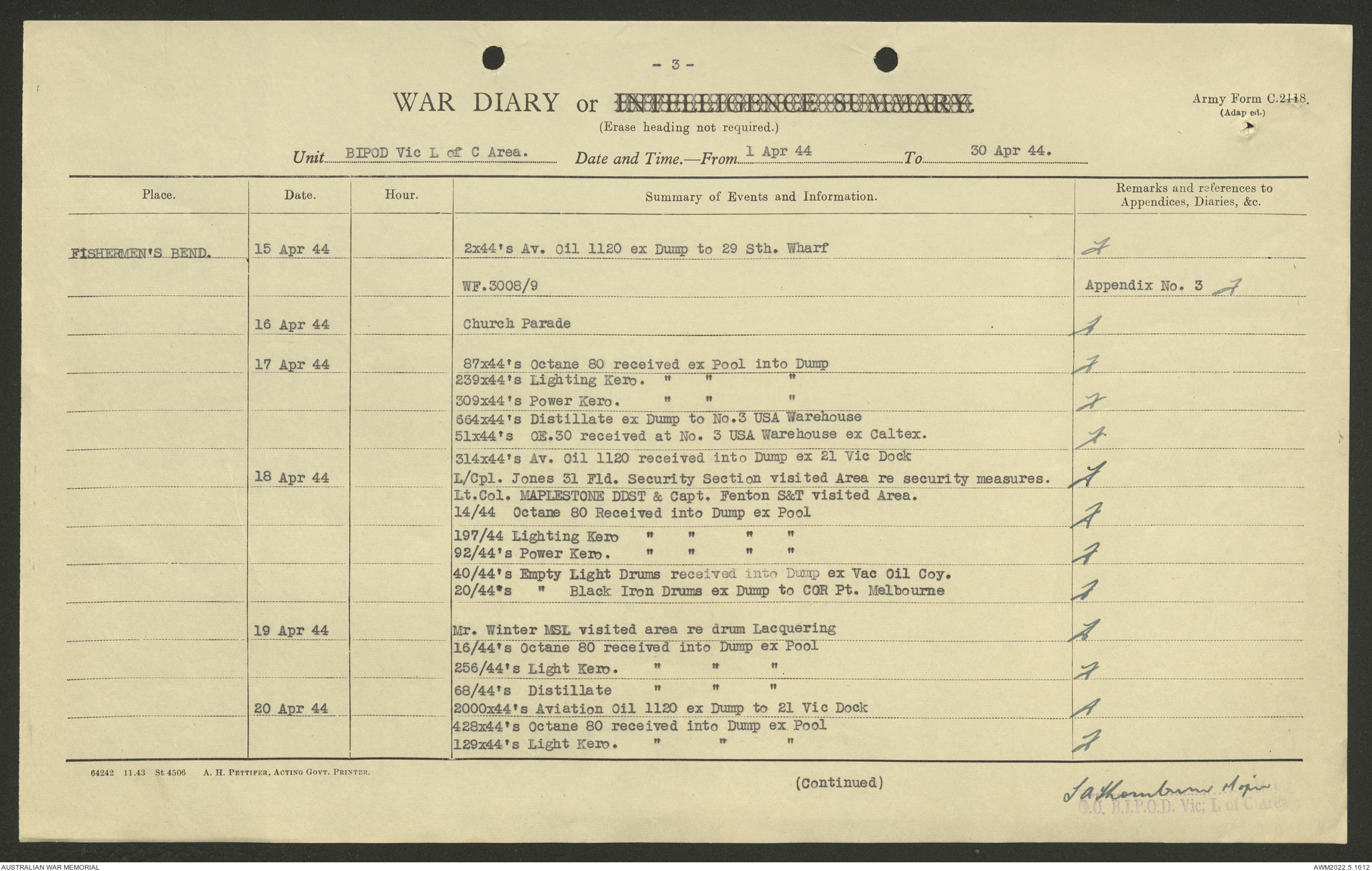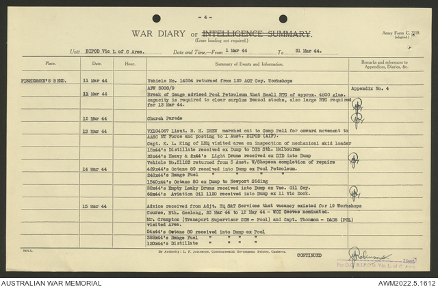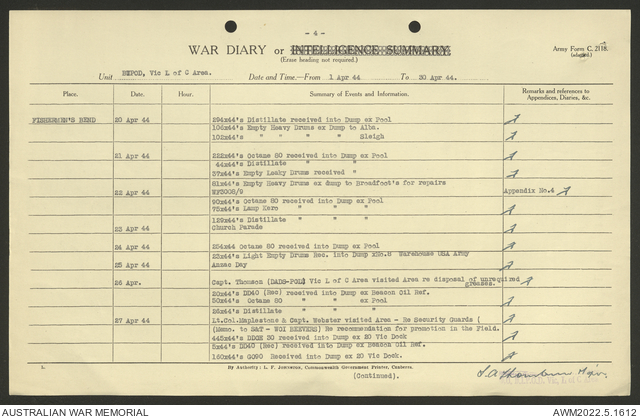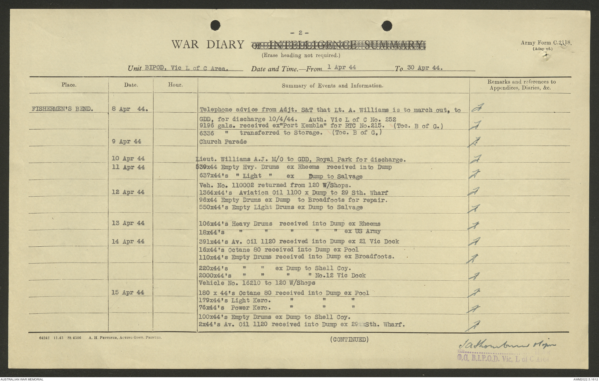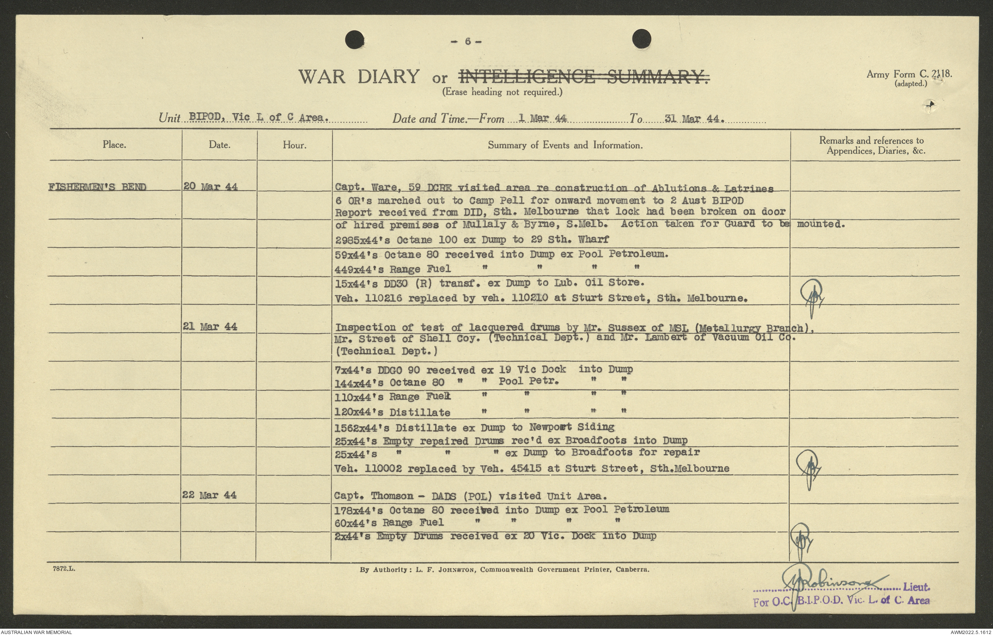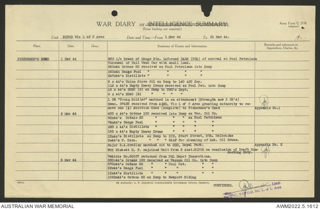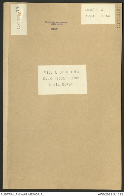 AWM52 10/19/5/14 - [Unit War Diaries, 1939-45 War] Victoria L of C [Lines of Communication] BIPOD [Bulk Issue Petrol and Oil Depot] March - April 1944