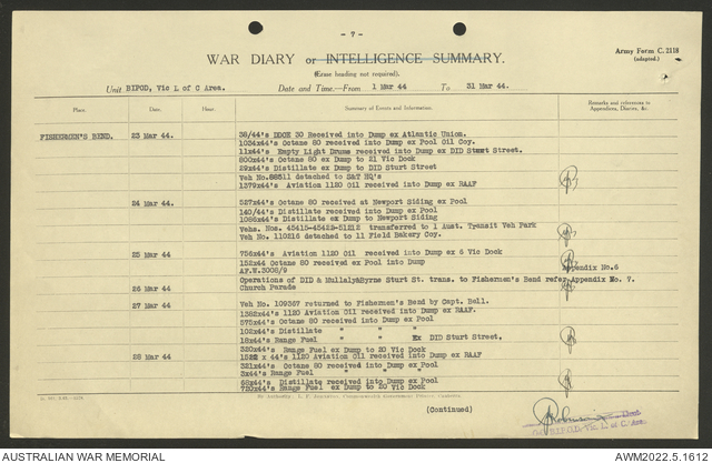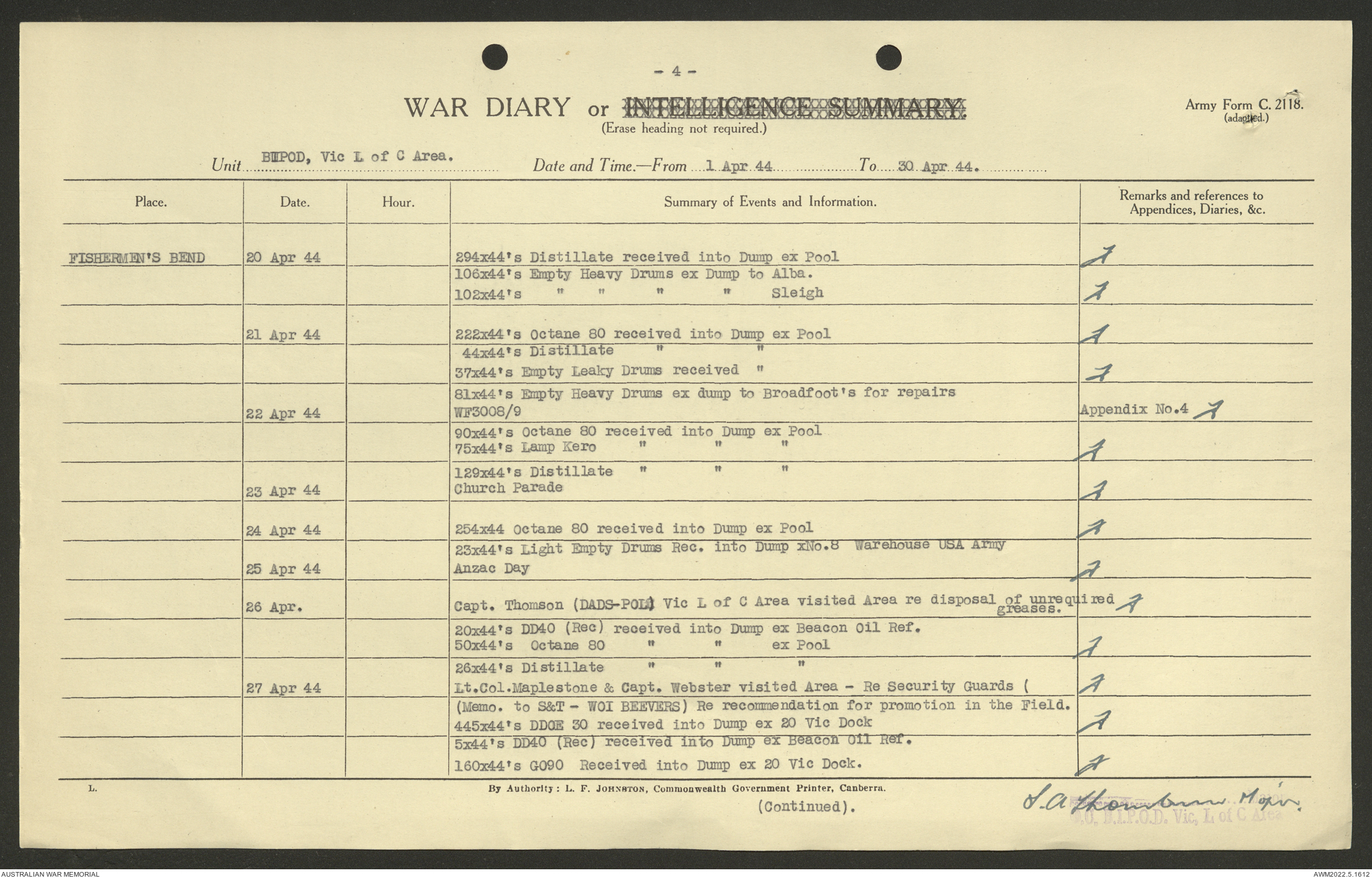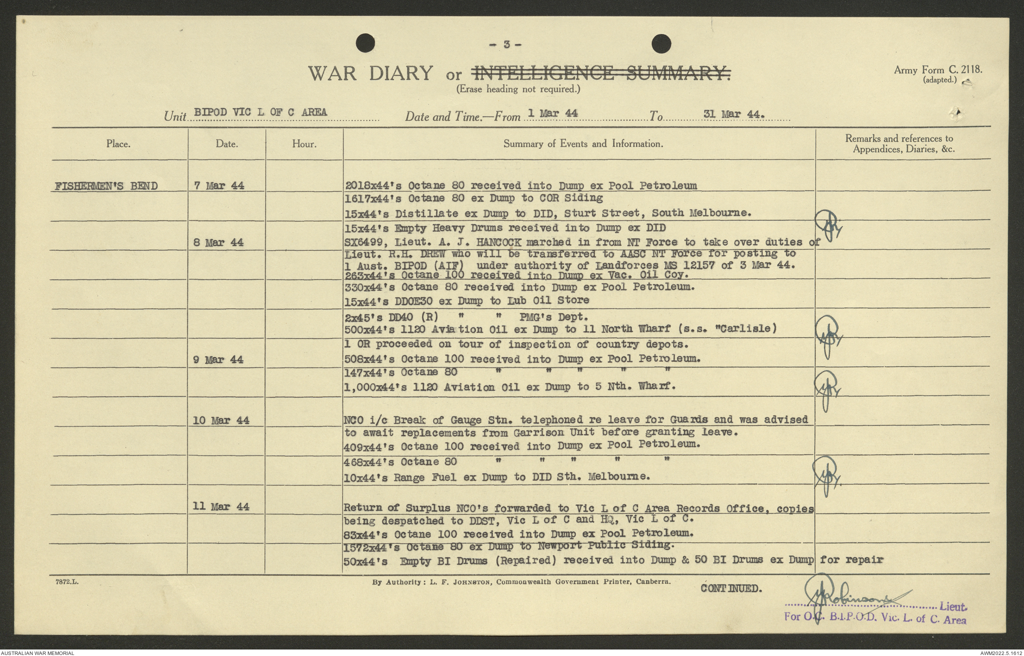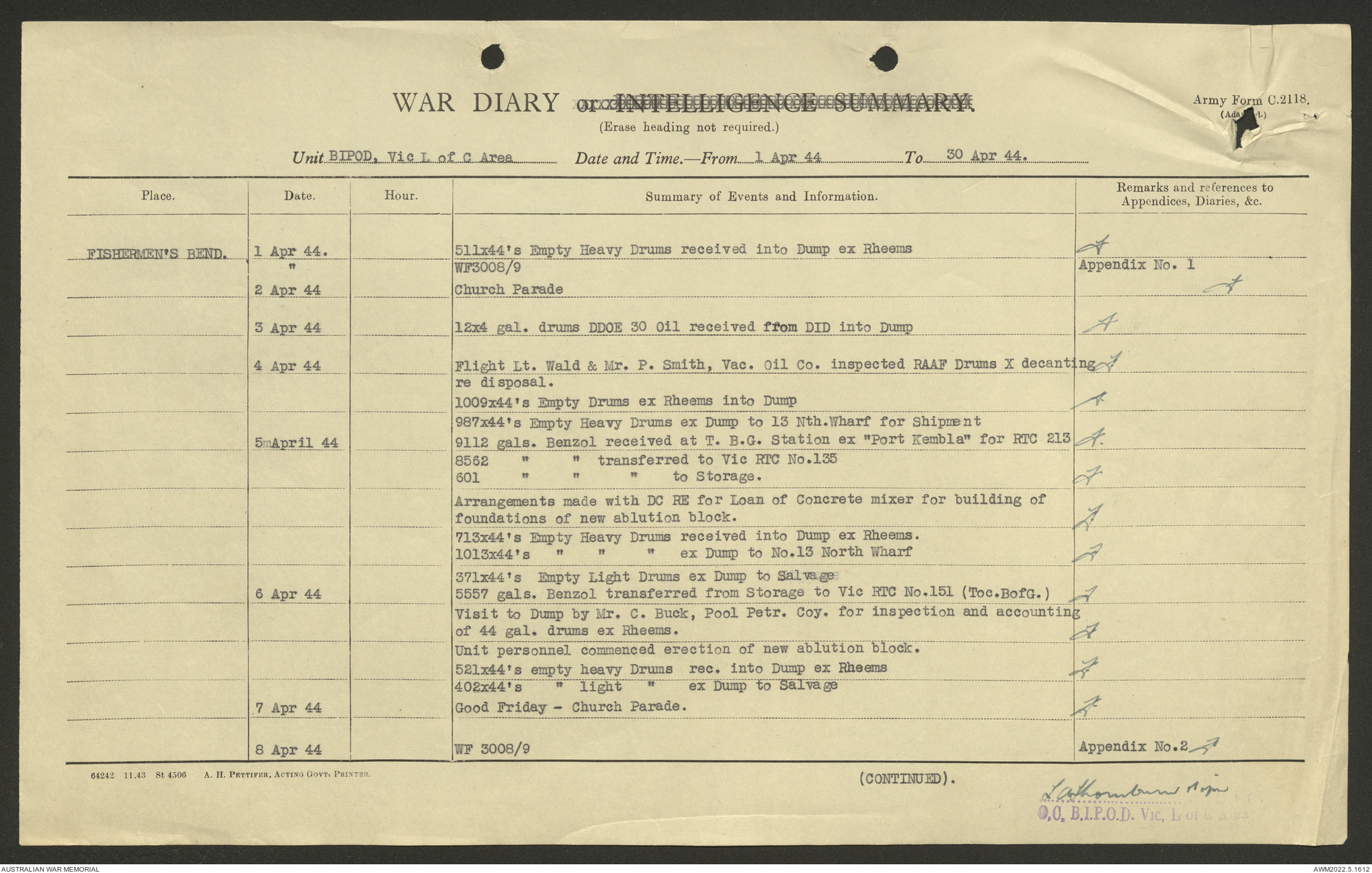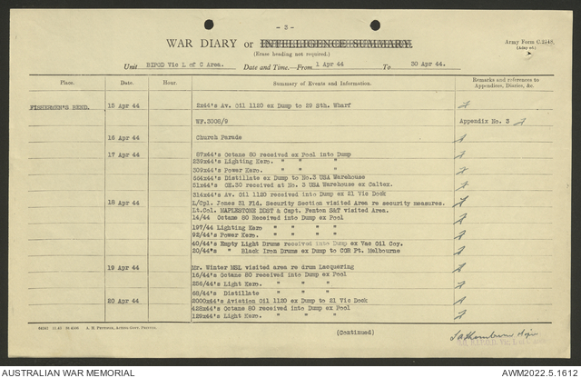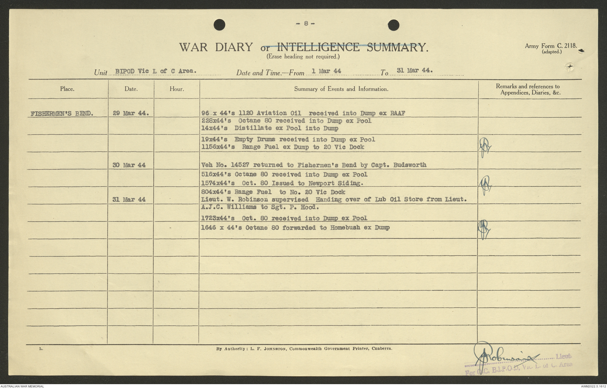 AWM52 10/19/5/14 - [Unit War Diaries, 1939-45 War] Victoria L of C [Lines of Communication] BIPOD [Bulk Issue Petrol and Oil Depot] March - April 1944