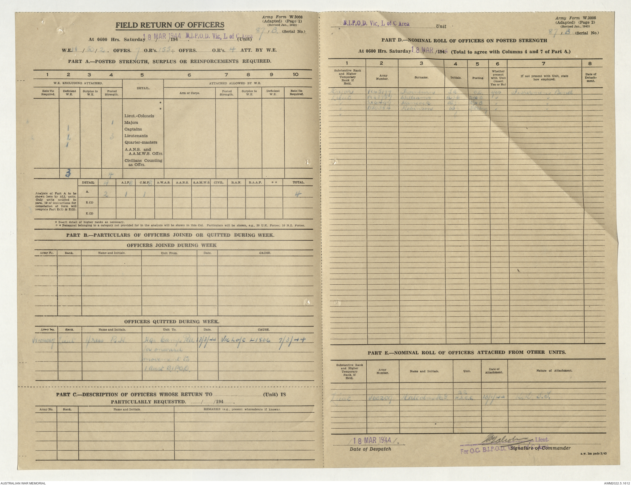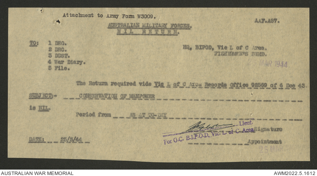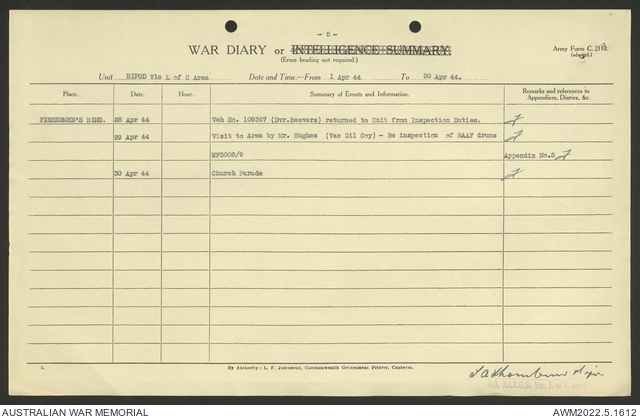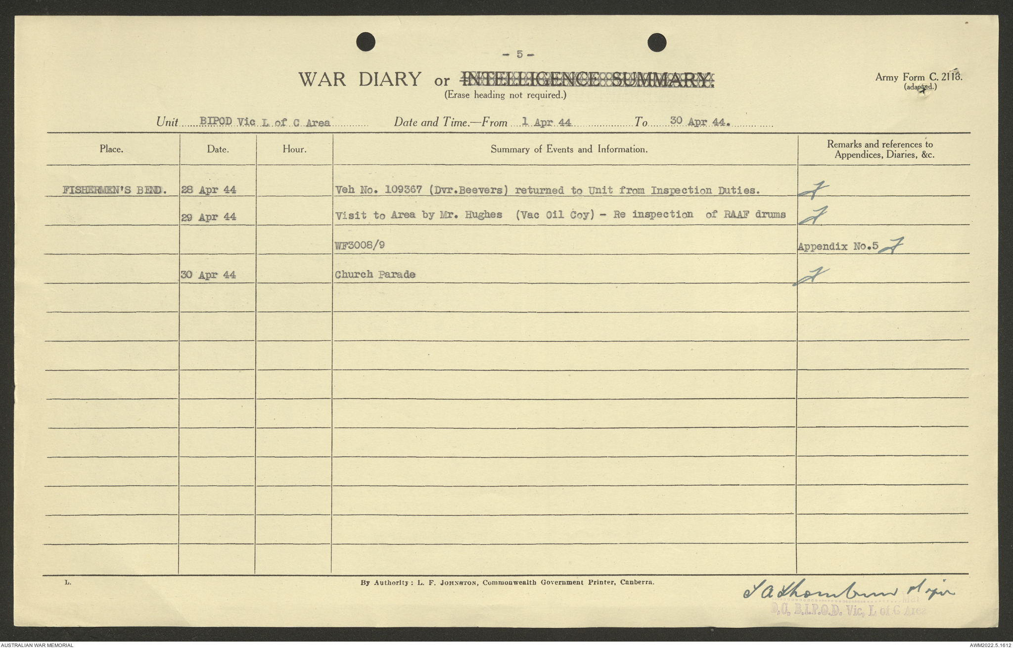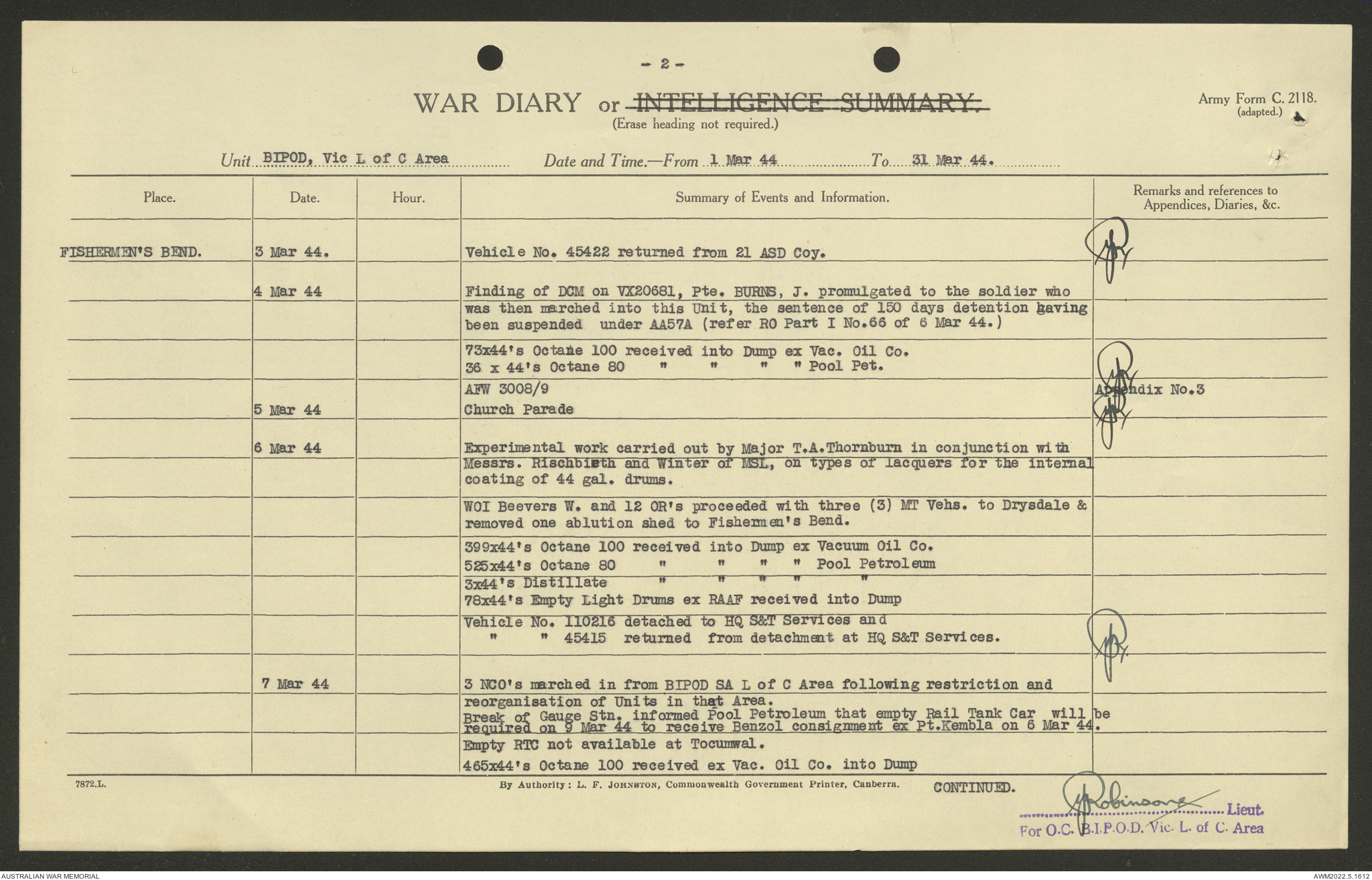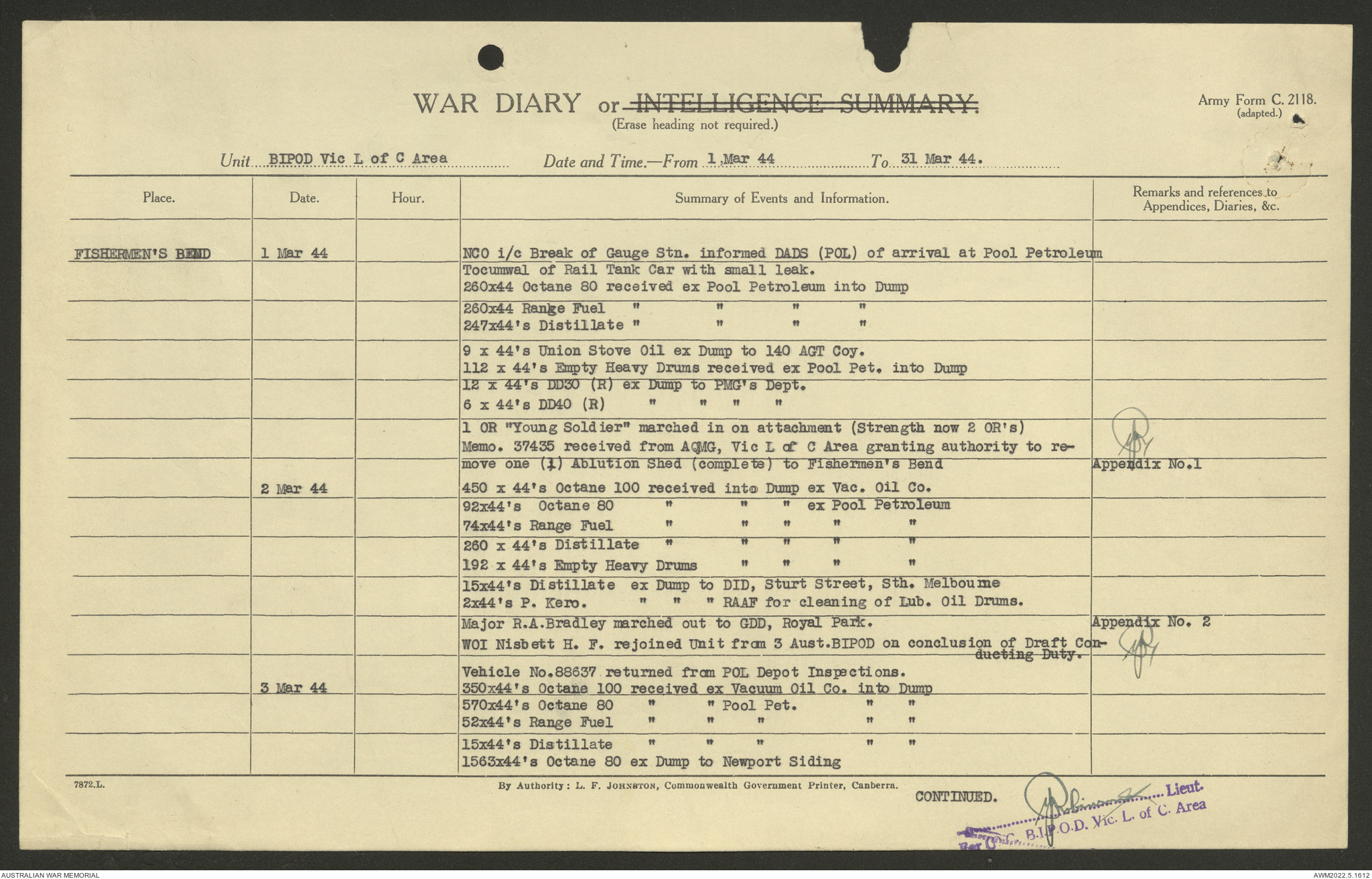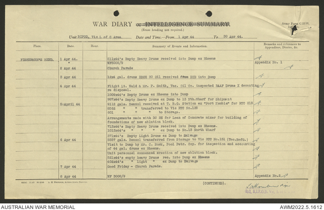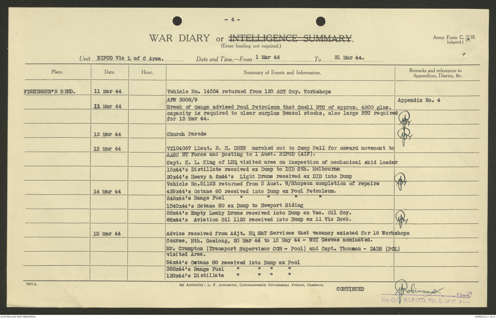 AWM52 10/19/5/14 - [Unit War Diaries, 1939-45 War] Victoria L of C [Lines of Communication] BIPOD [Bulk Issue Petrol and Oil Depot] March - April 1944