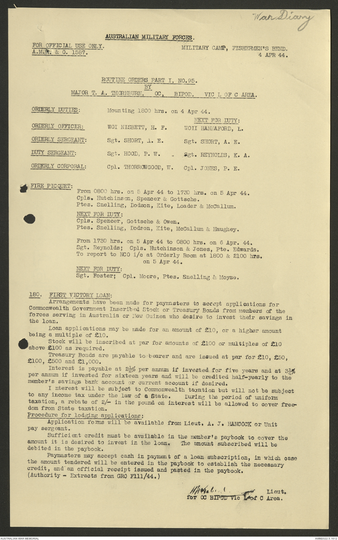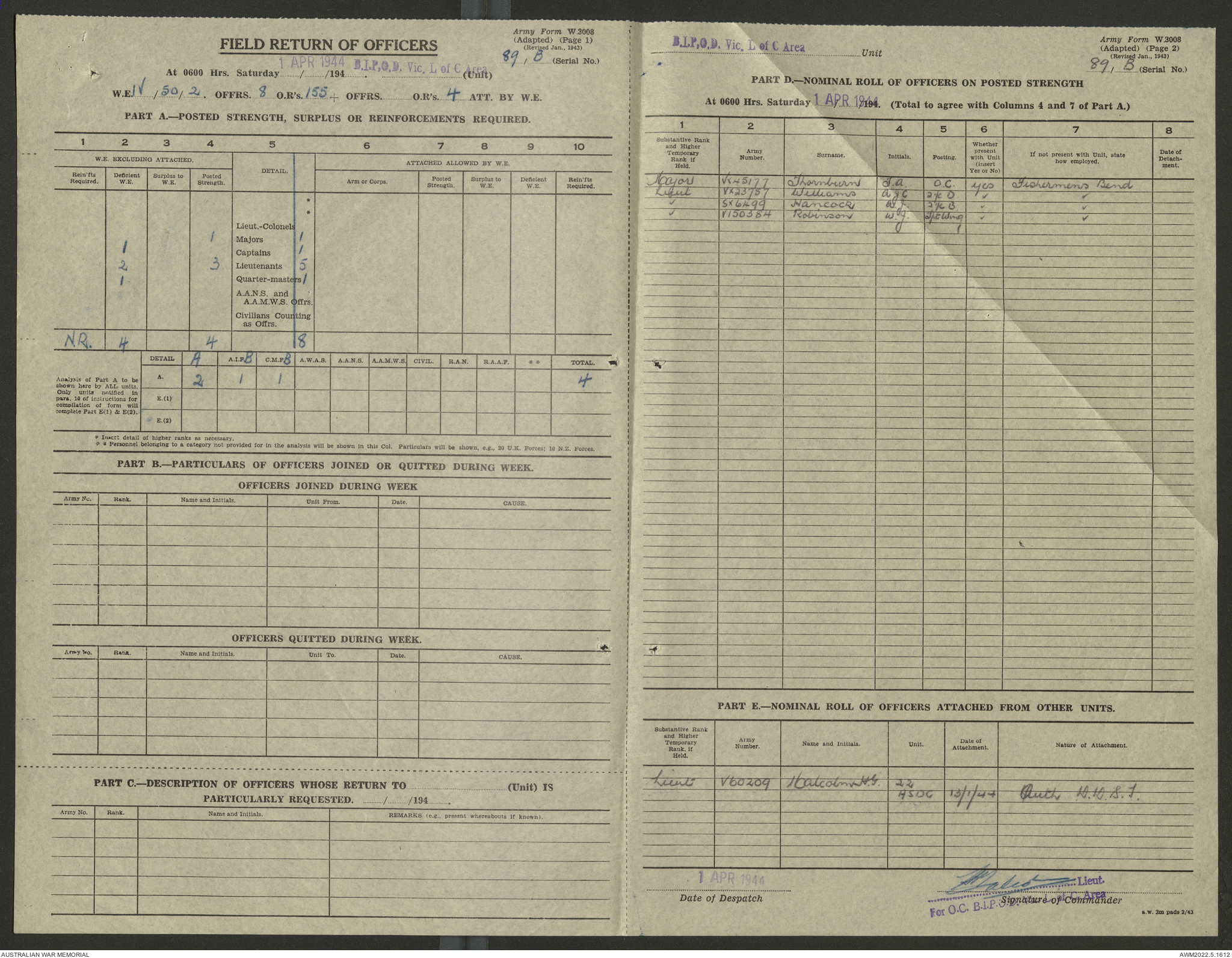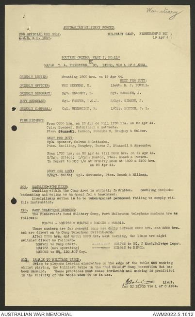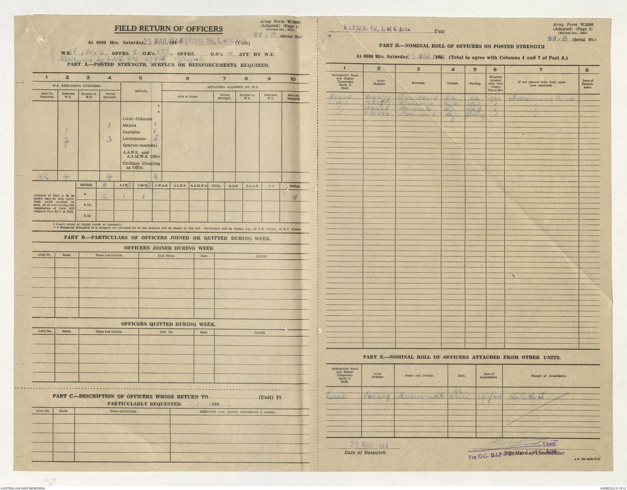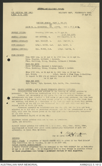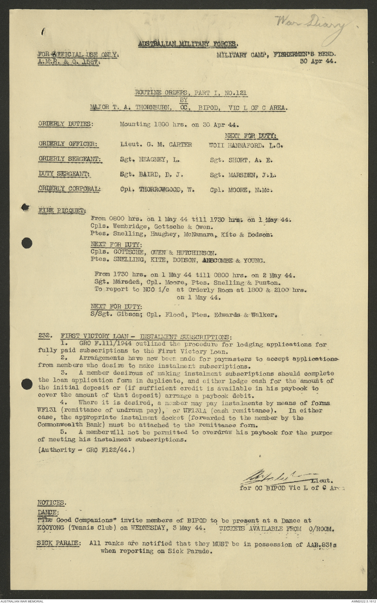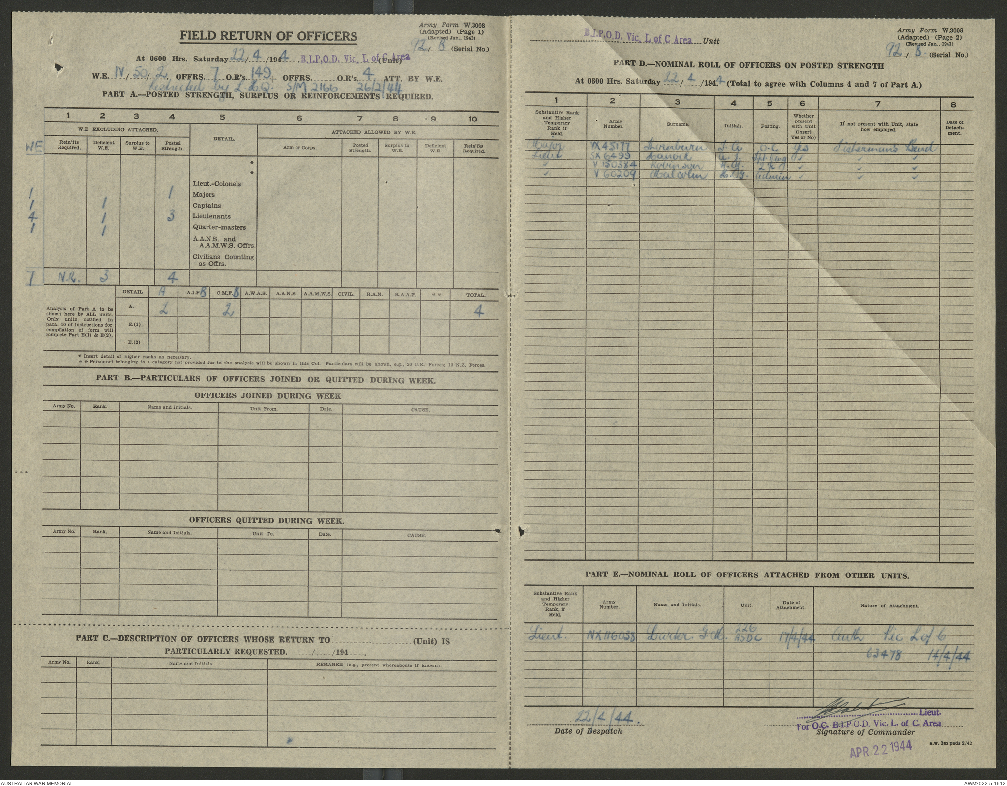 AWM52 10/19/5/14 - [Unit War Diaries, 1939-45 War] Victoria L of C [Lines of Communication] BIPOD [Bulk Issue Petrol and Oil Depot] March - April 1944