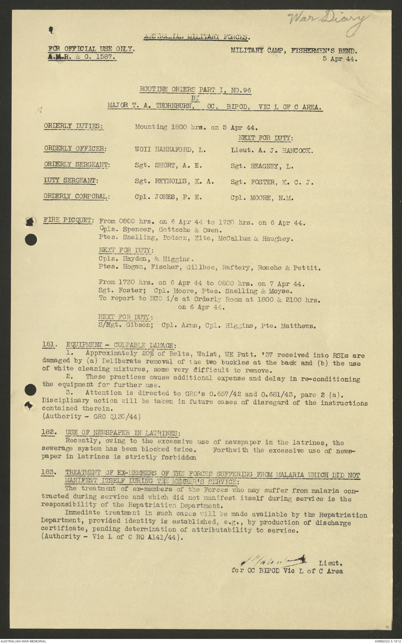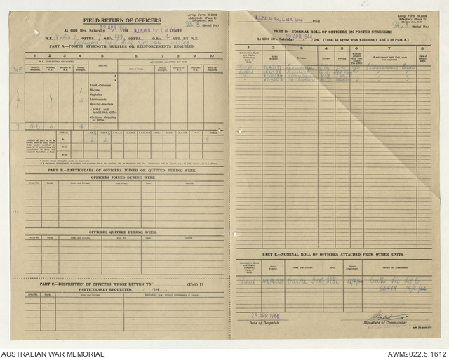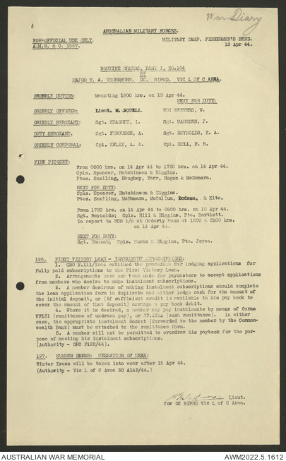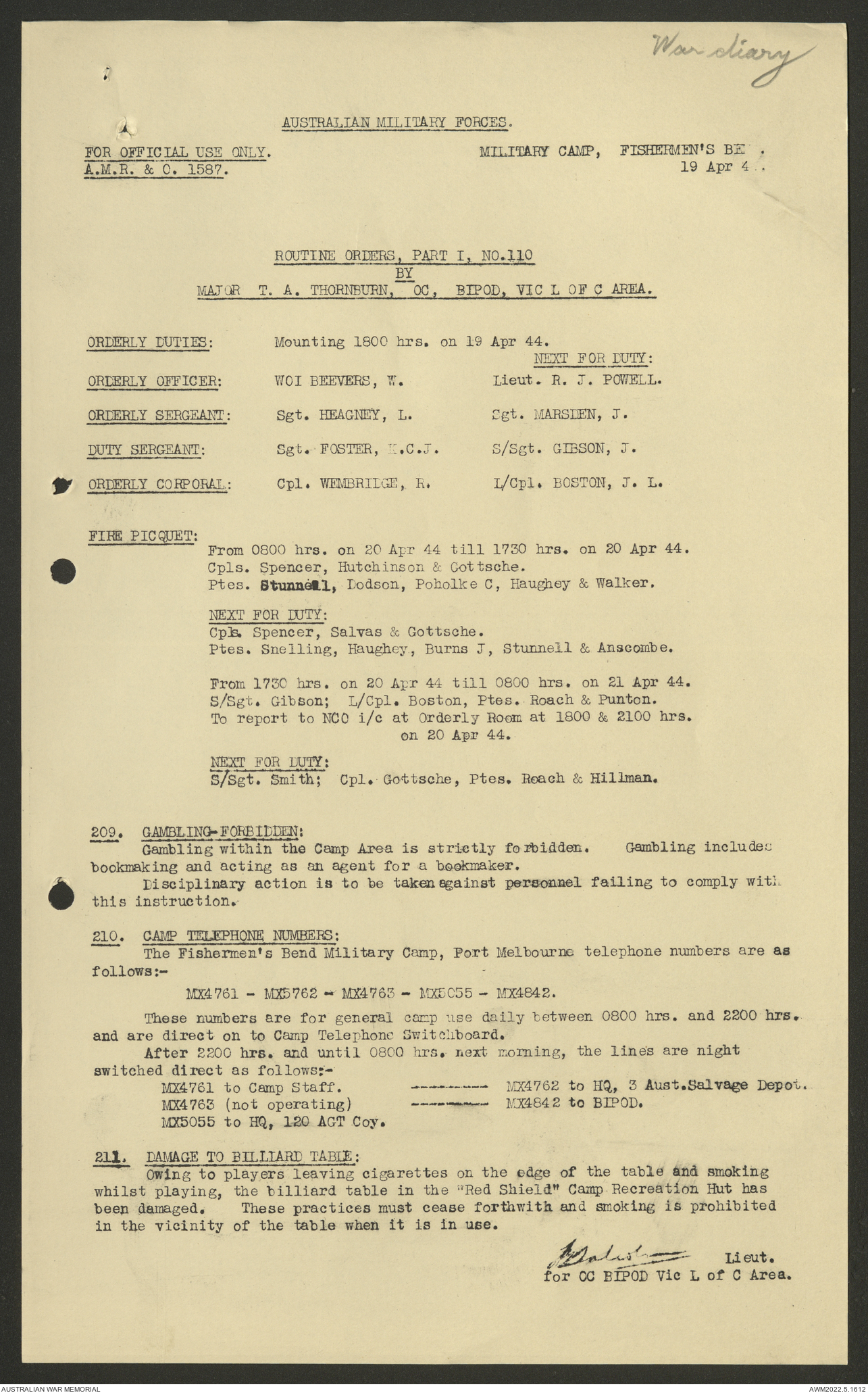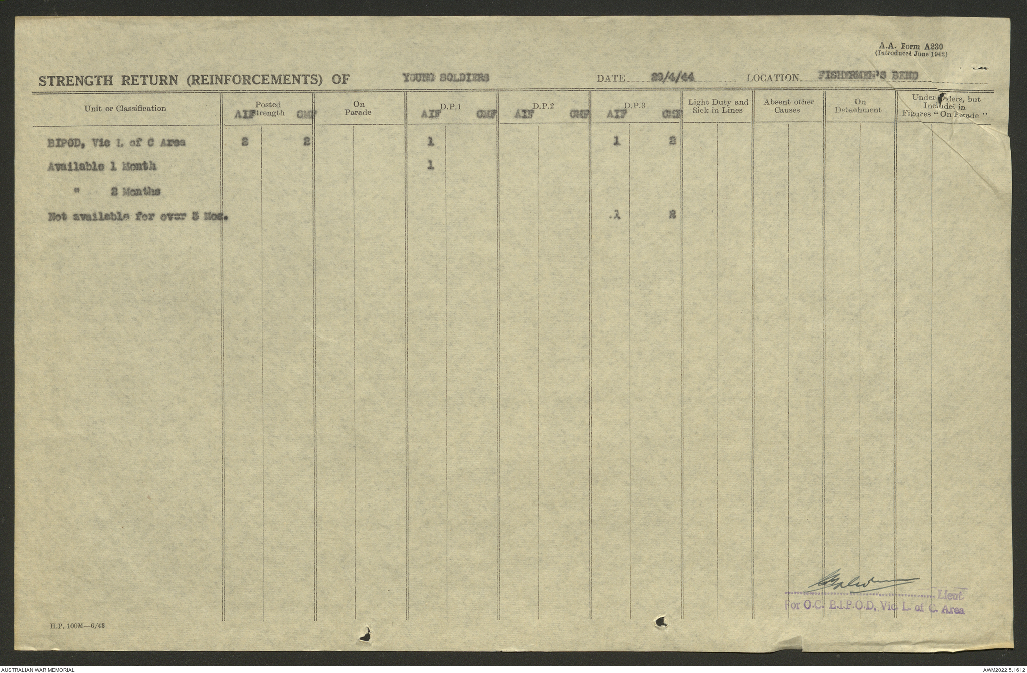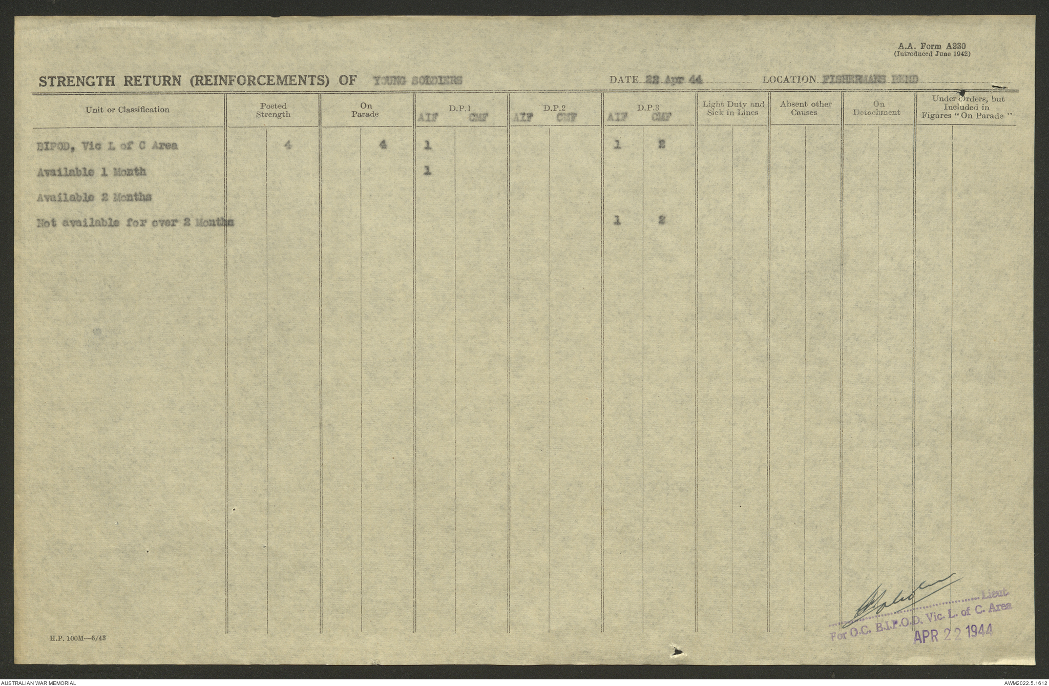 AWM52 10/19/5/14 - [Unit War Diaries, 1939-45 War] Victoria L of C [Lines of Communication] BIPOD [Bulk Issue Petrol and Oil Depot] March - April 1944