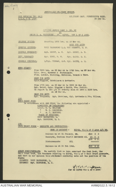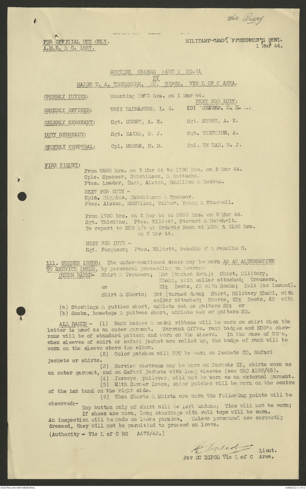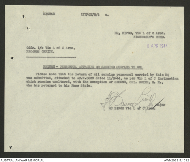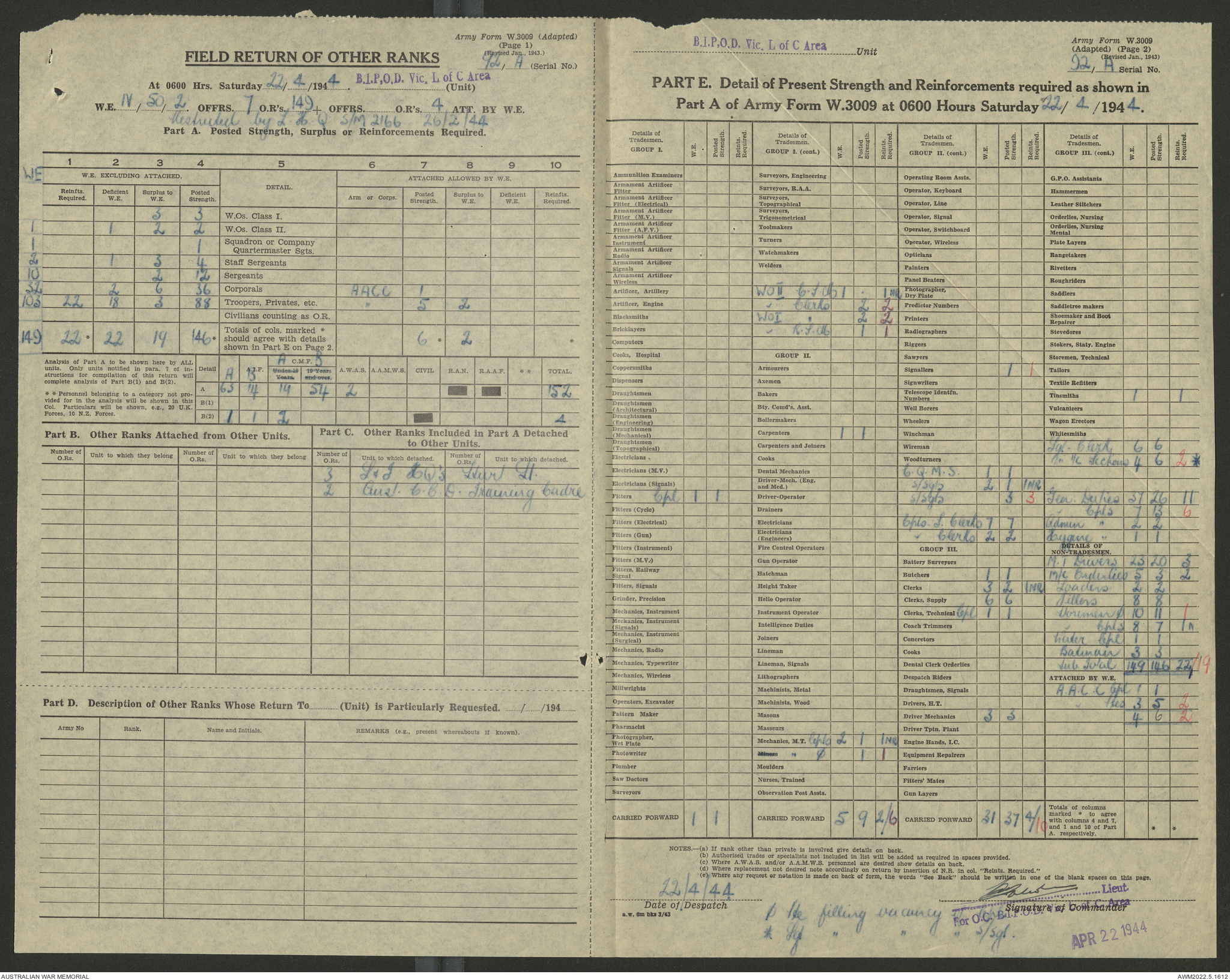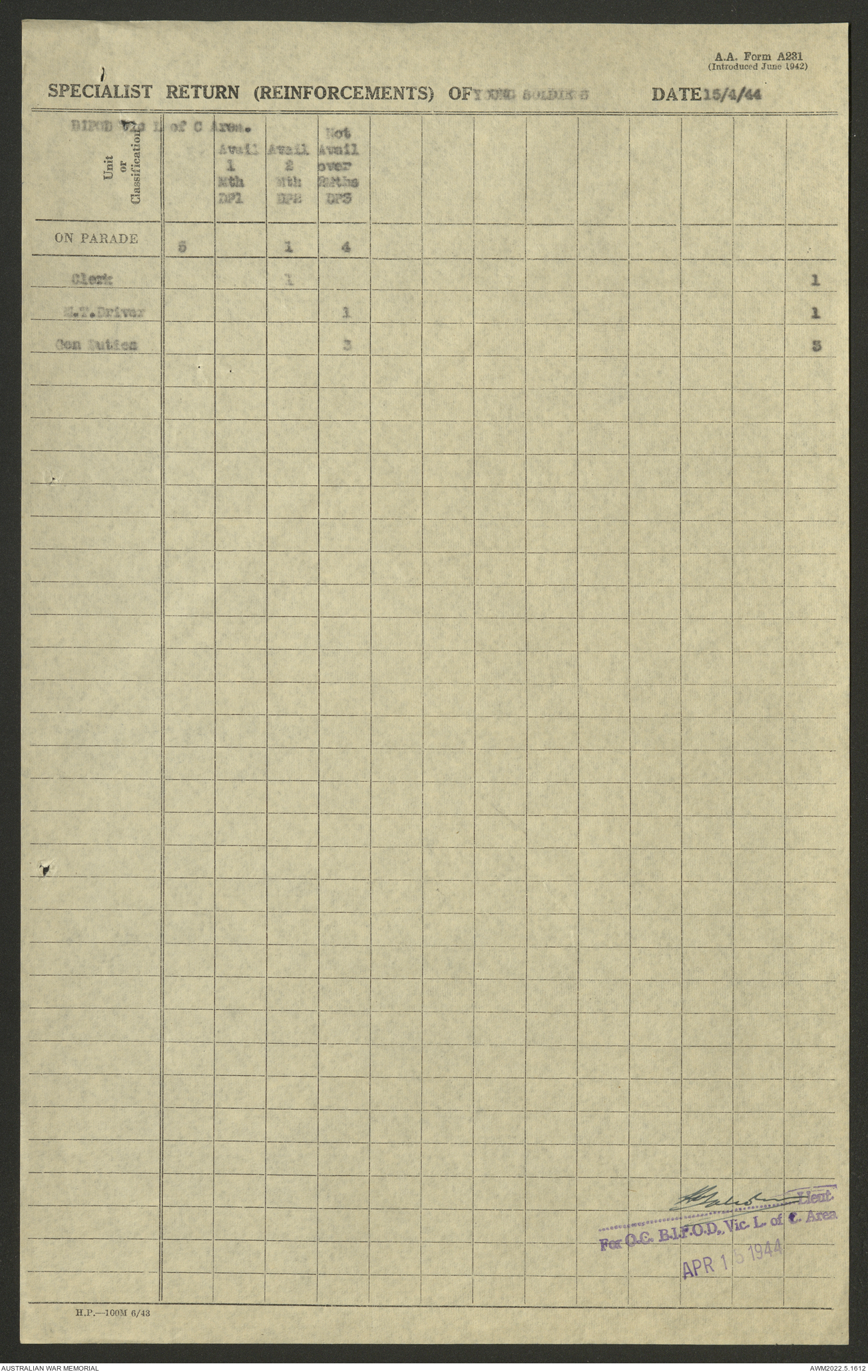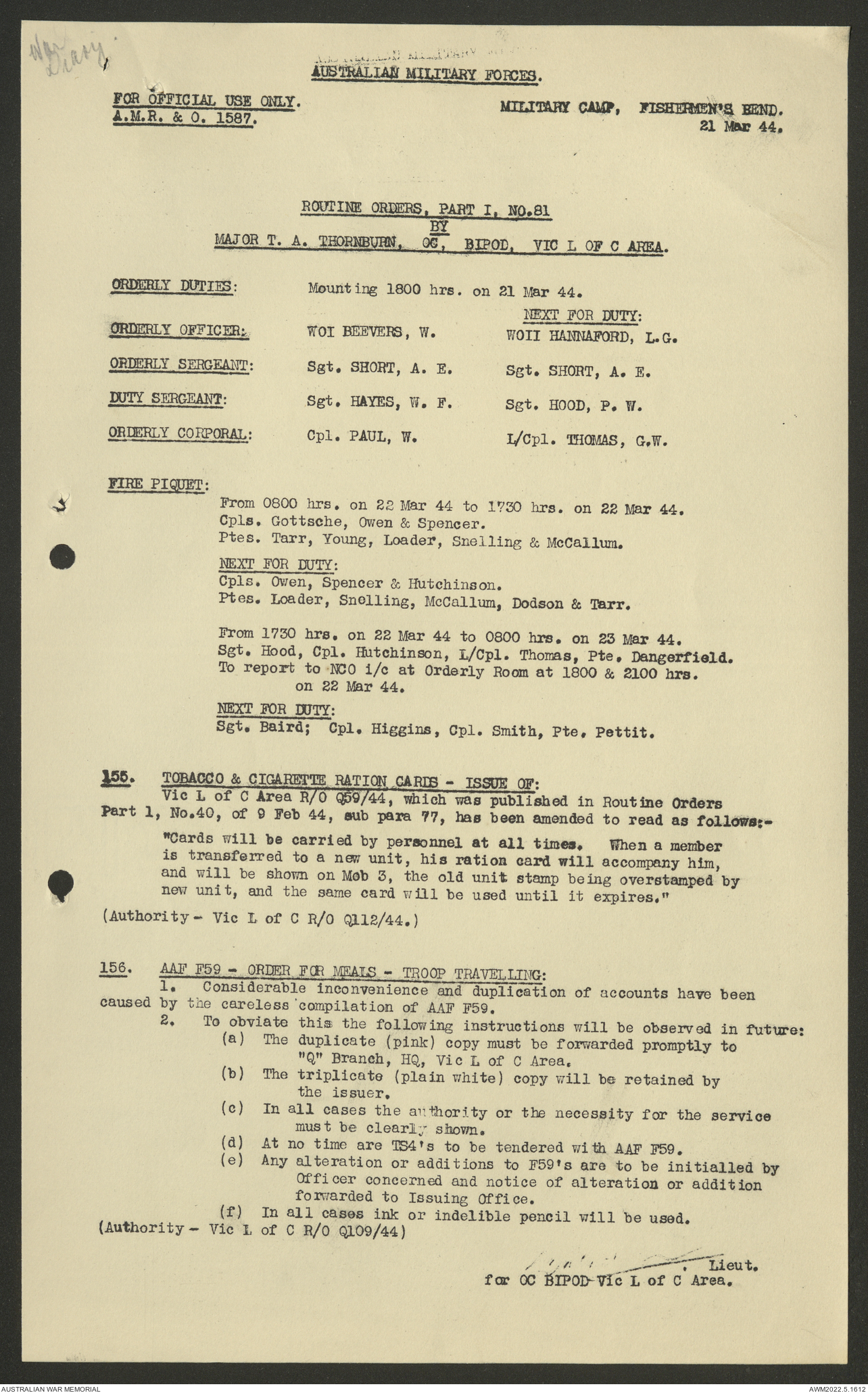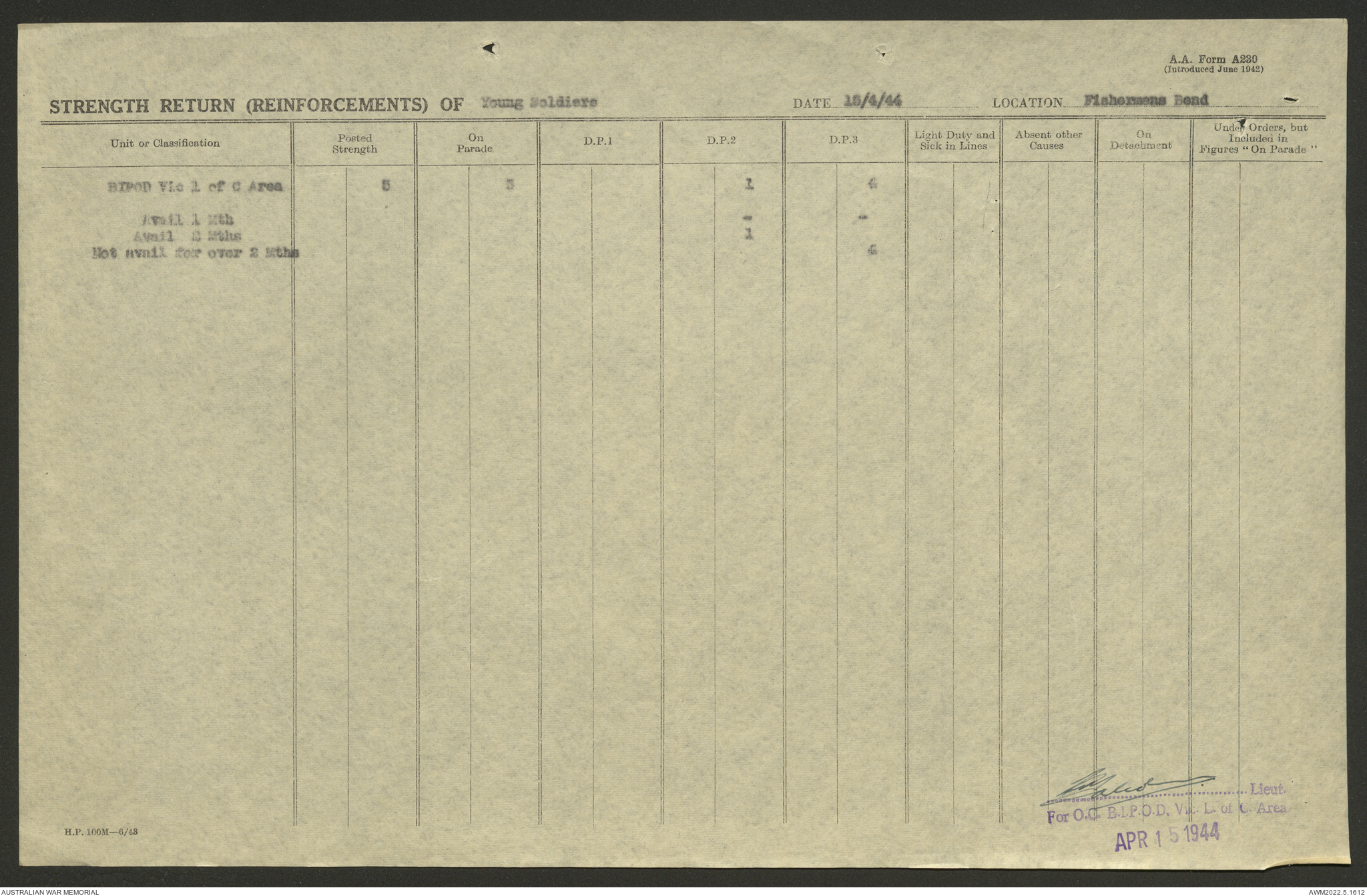 AWM52 10/19/5/14 - [Unit War Diaries, 1939-45 War] Victoria L of C [Lines of Communication] BIPOD [Bulk Issue Petrol and Oil Depot] March - April 1944