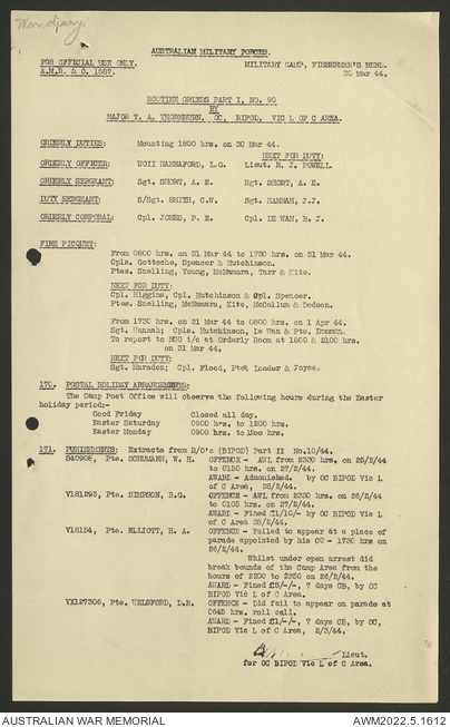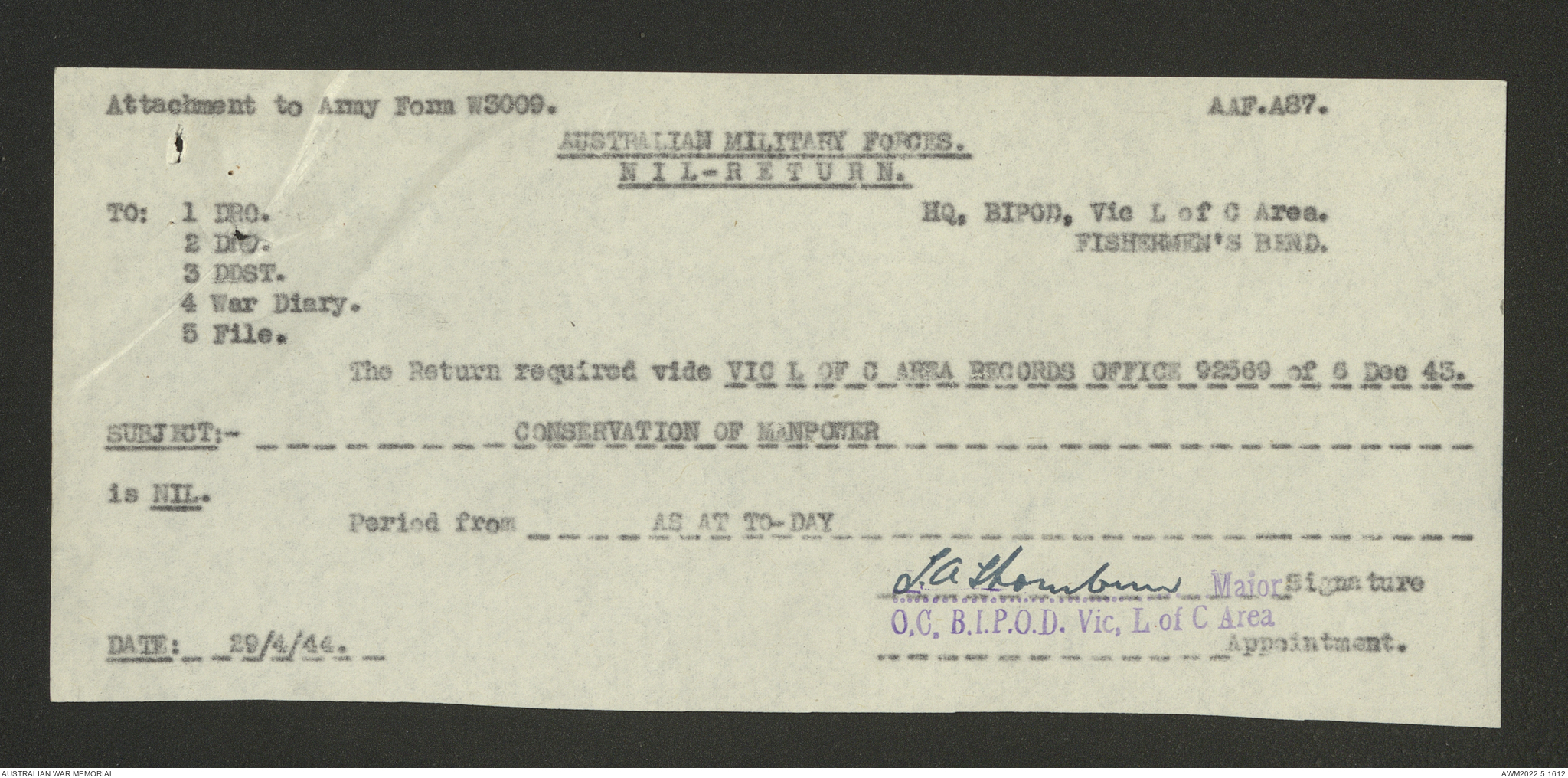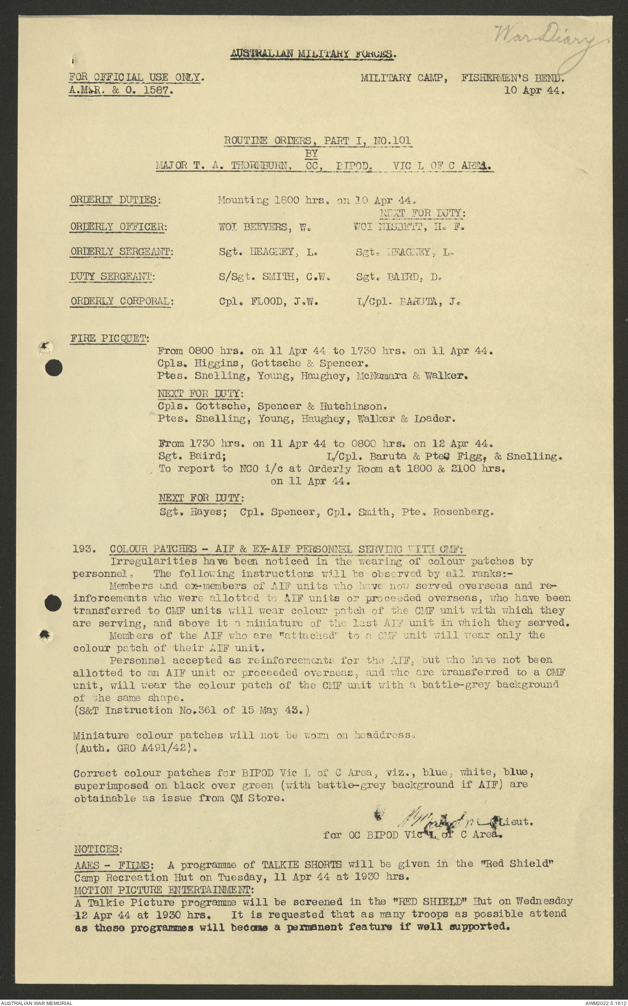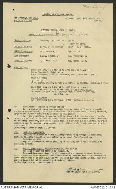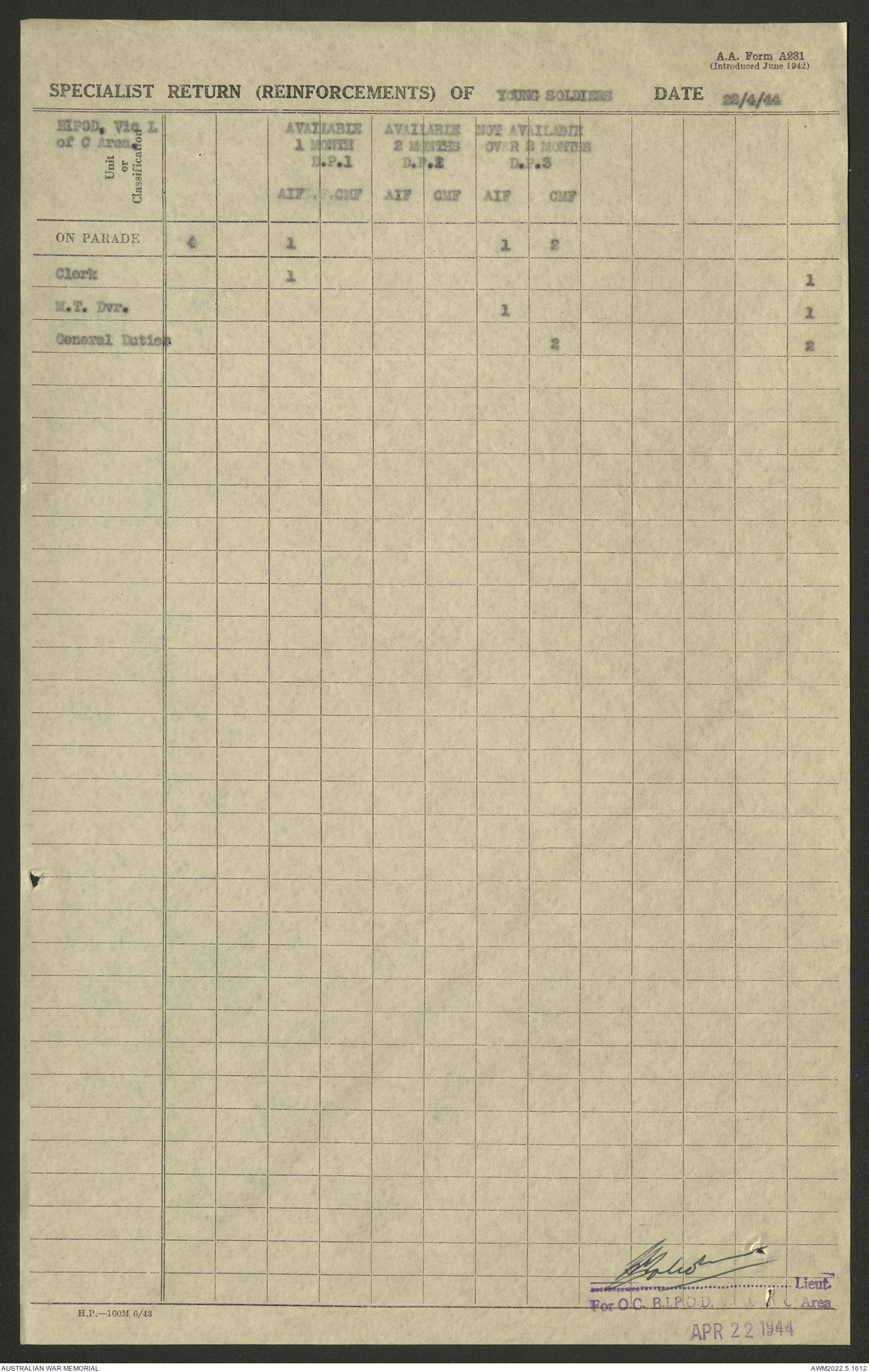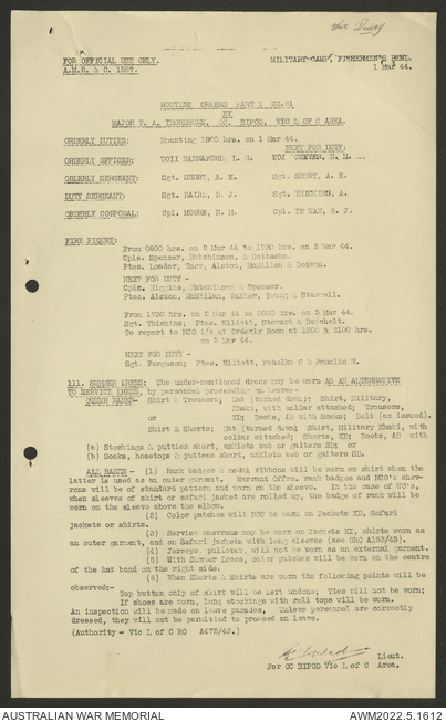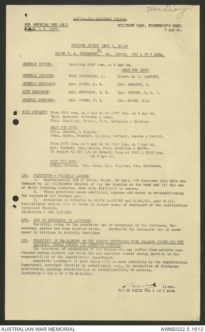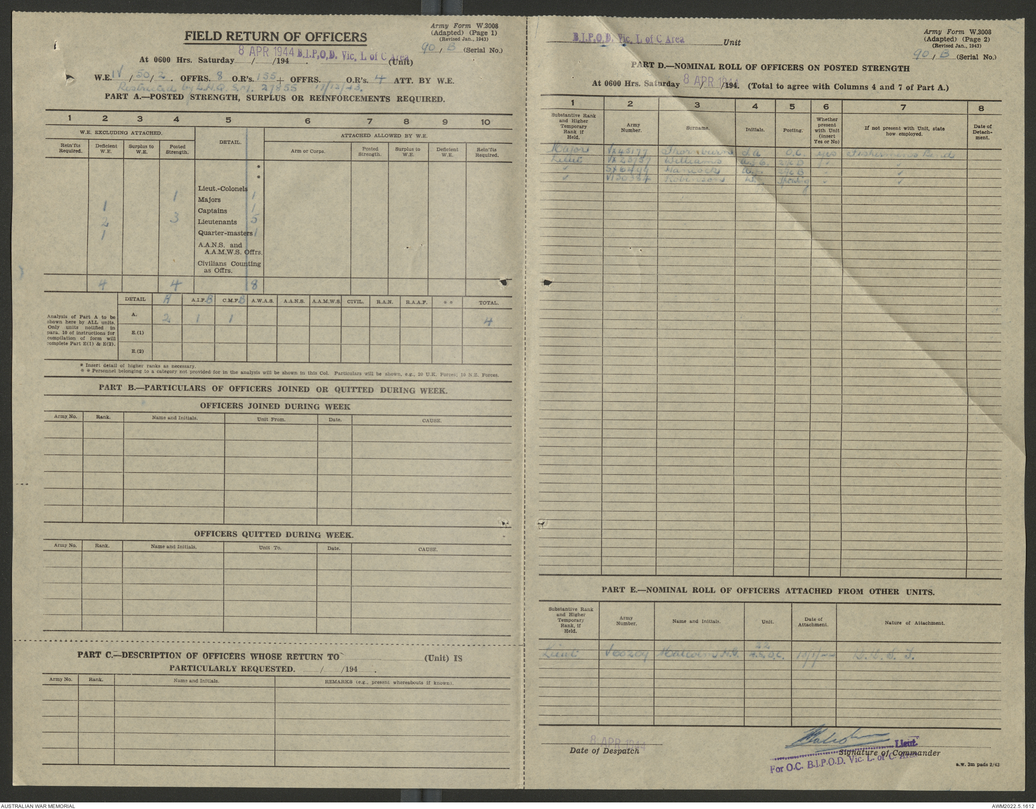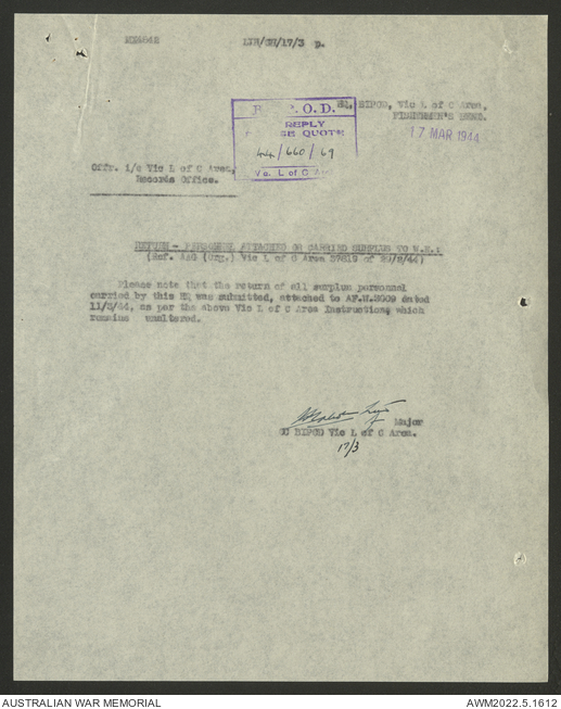 AWM52 10/19/5/14 - [Unit War Diaries, 1939-45 War] Victoria L of C [Lines of Communication] BIPOD [Bulk Issue Petrol and Oil Depot] March - April 1944