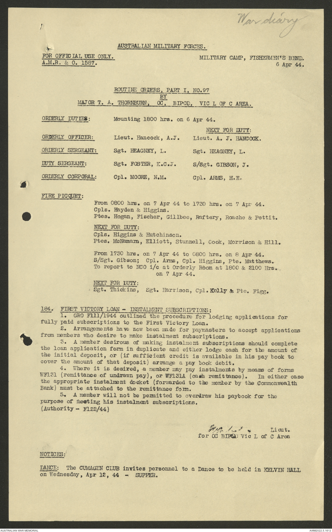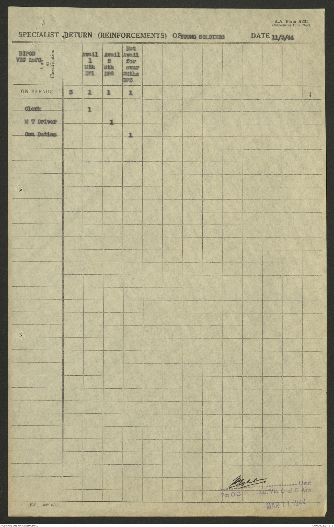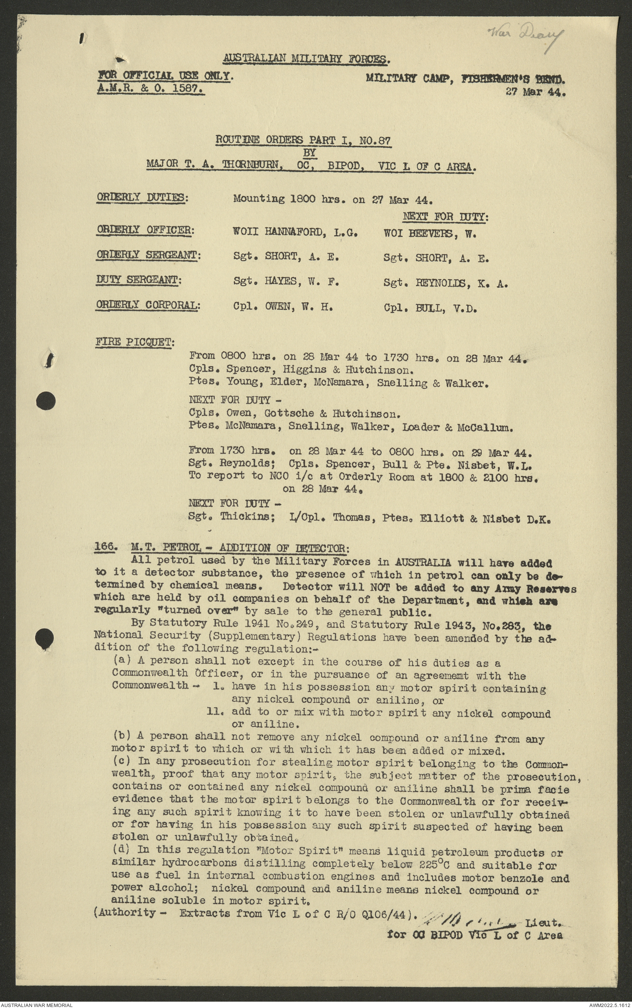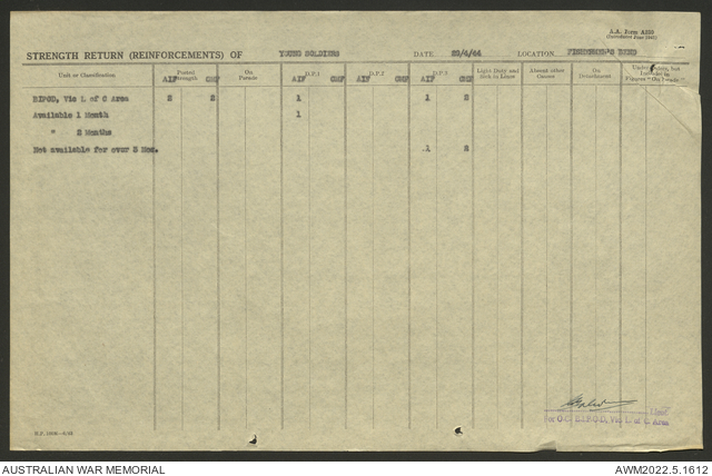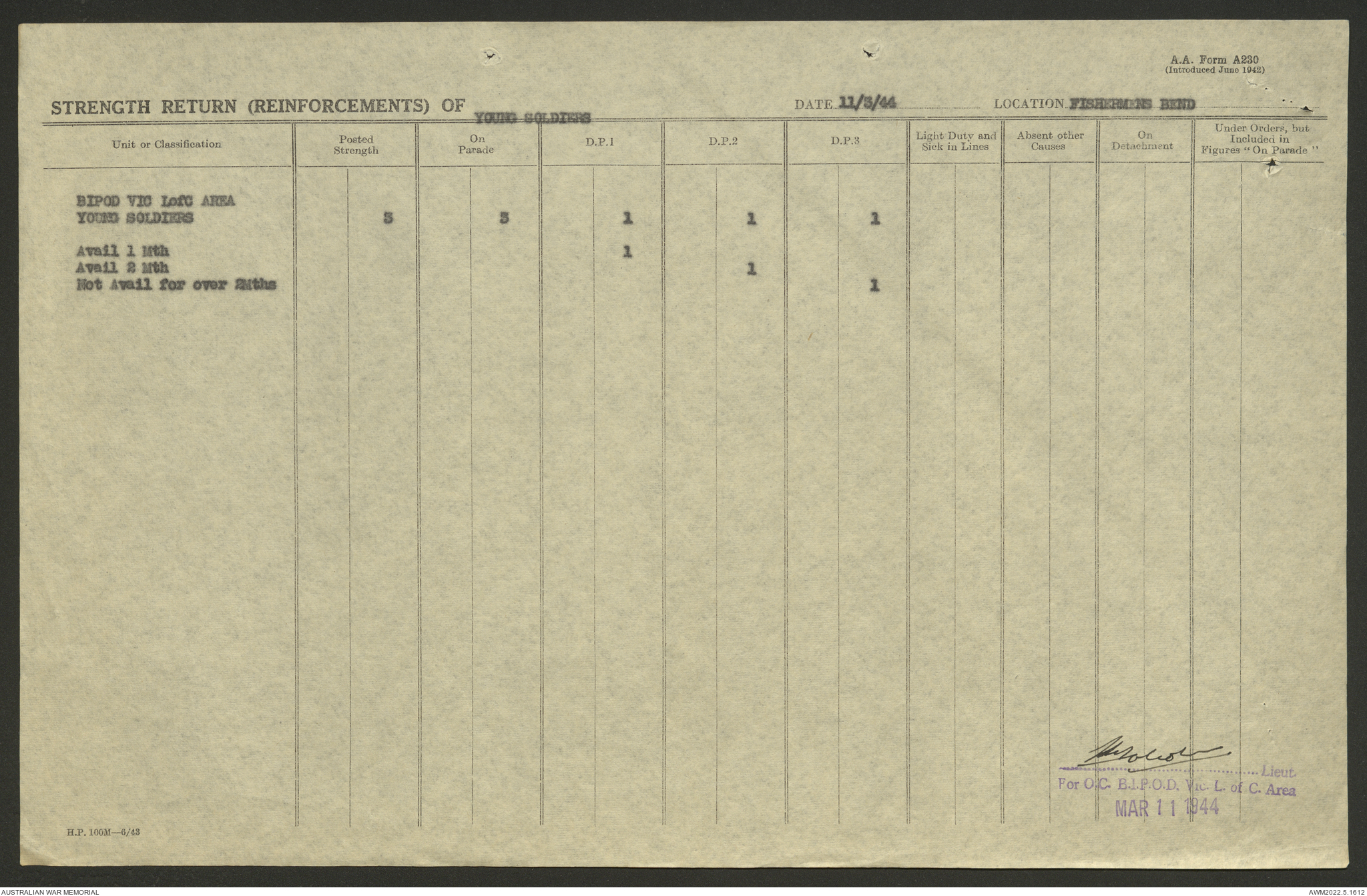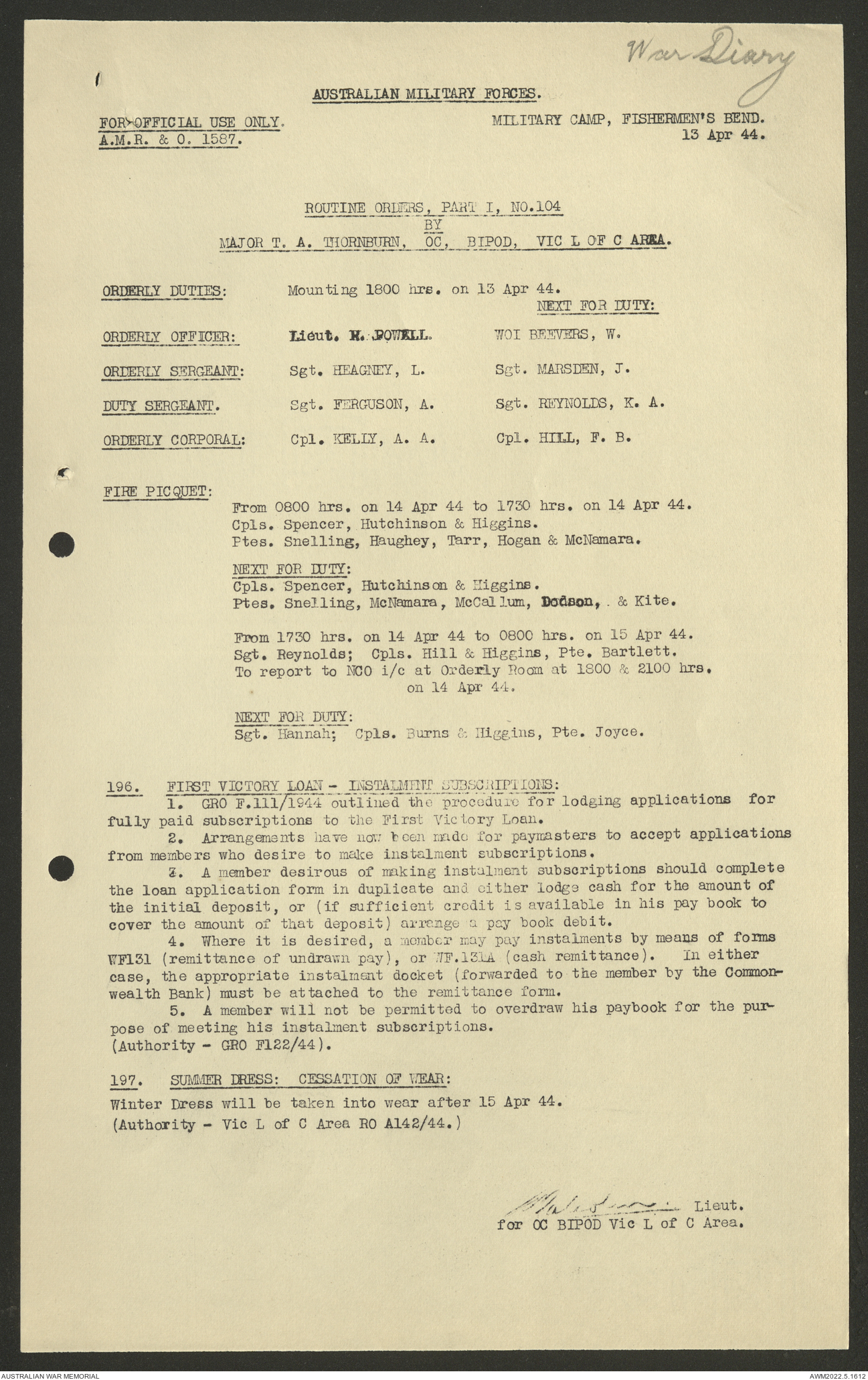 AWM52 10/19/5/14 - [Unit War Diaries, 1939-45 War] Victoria L of C [Lines of Communication] BIPOD [Bulk Issue Petrol and Oil Depot] March - April 1944
