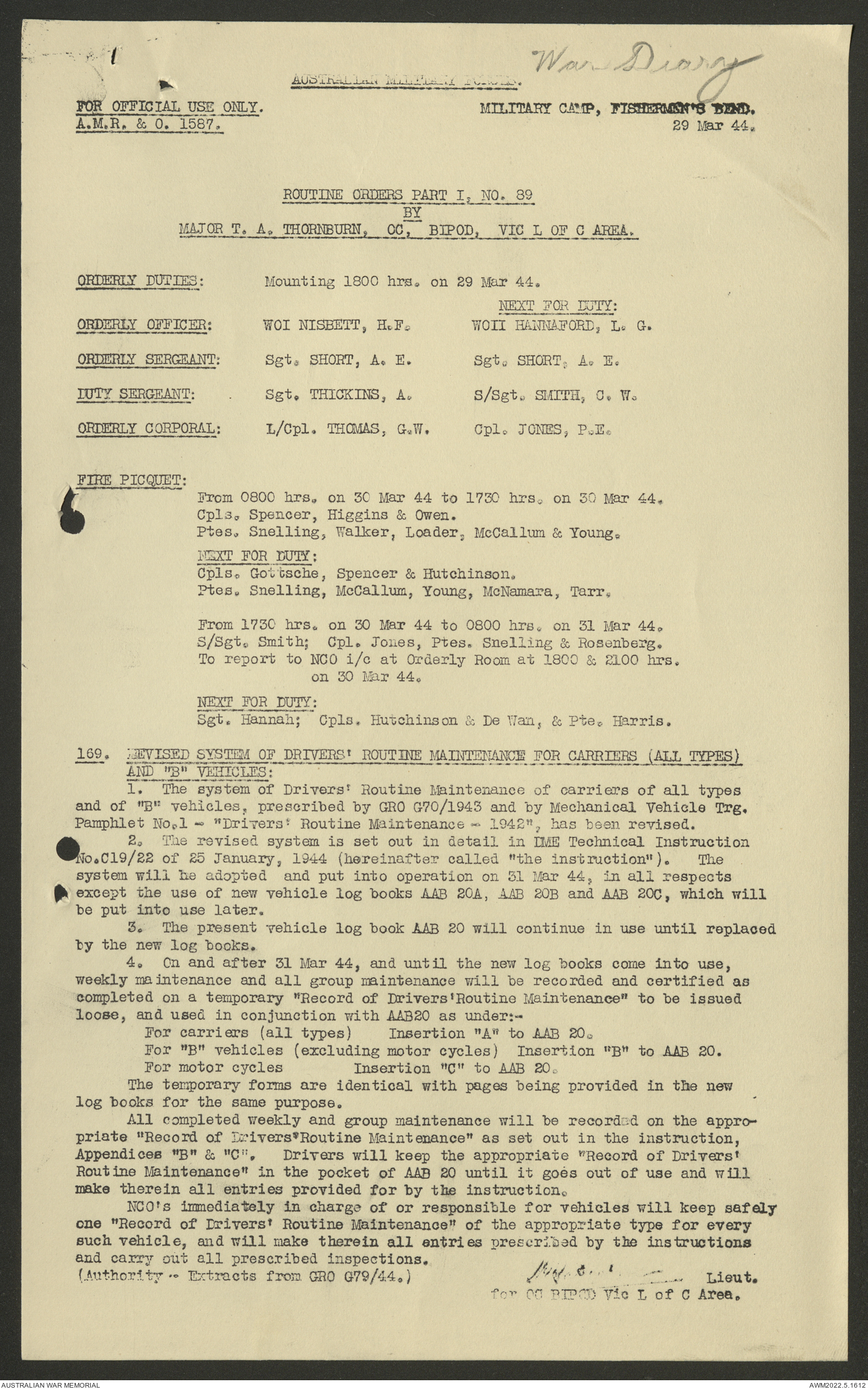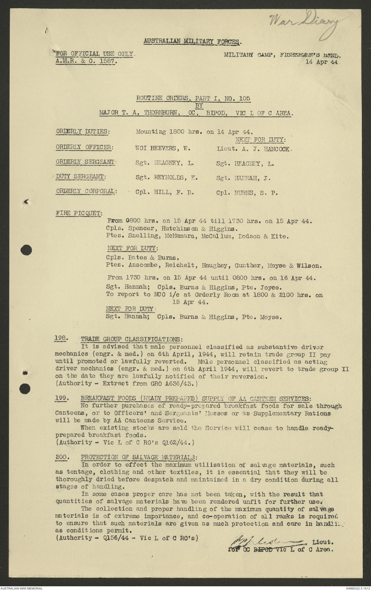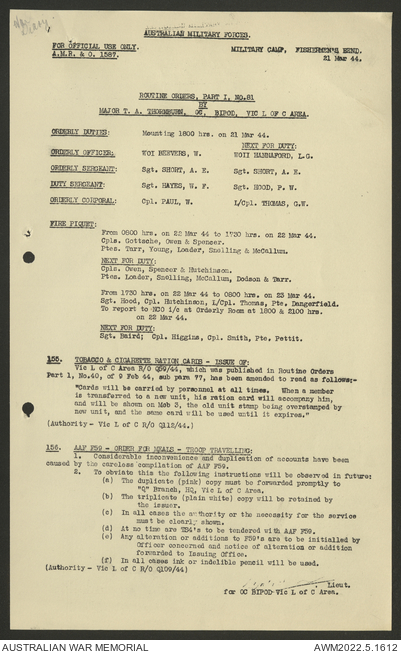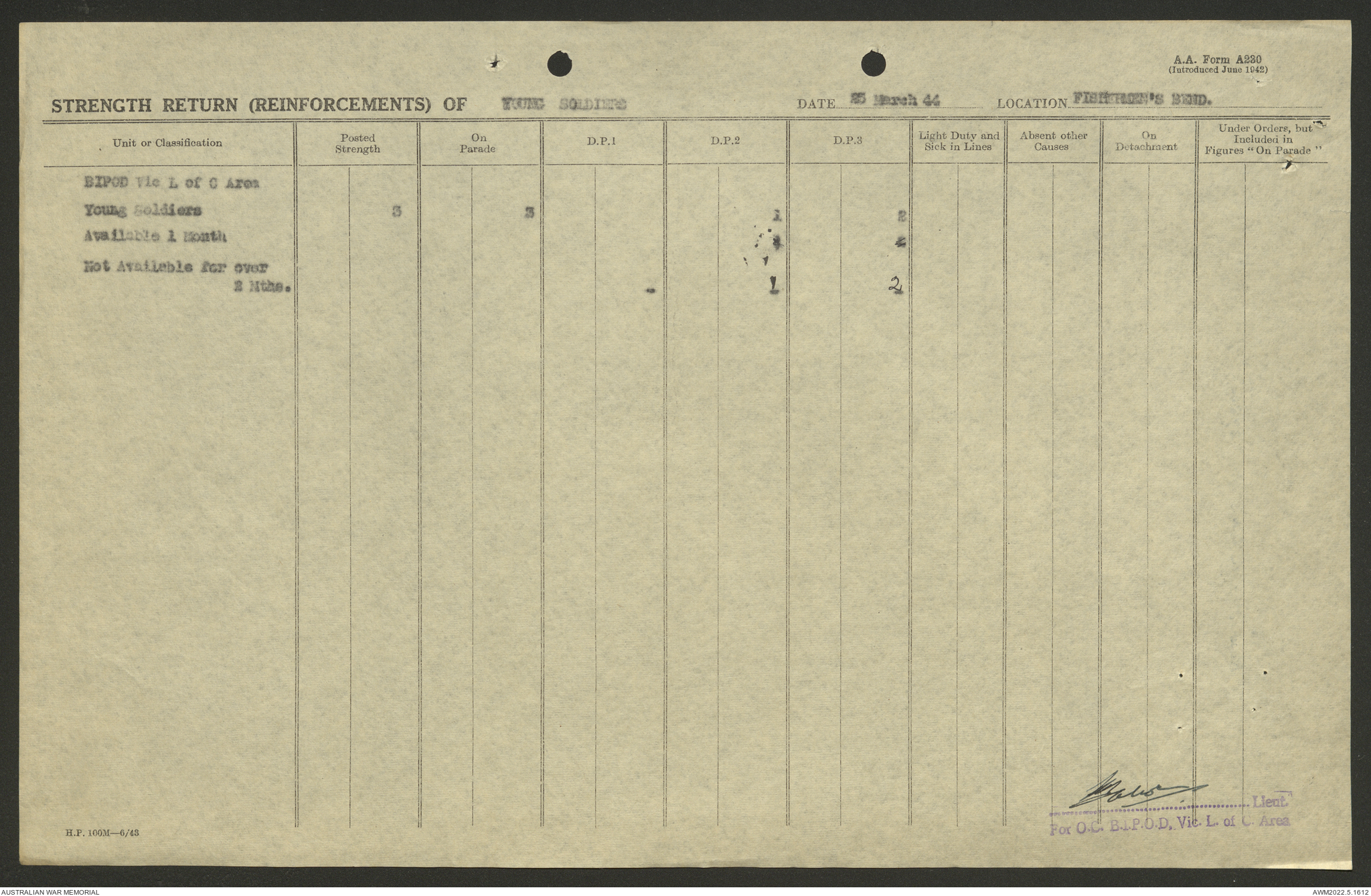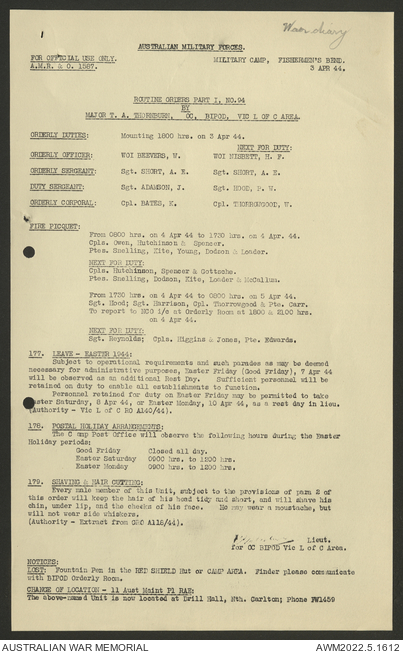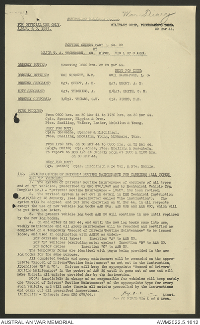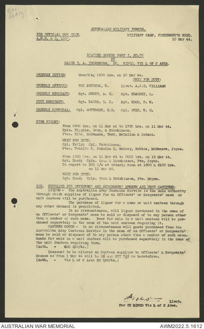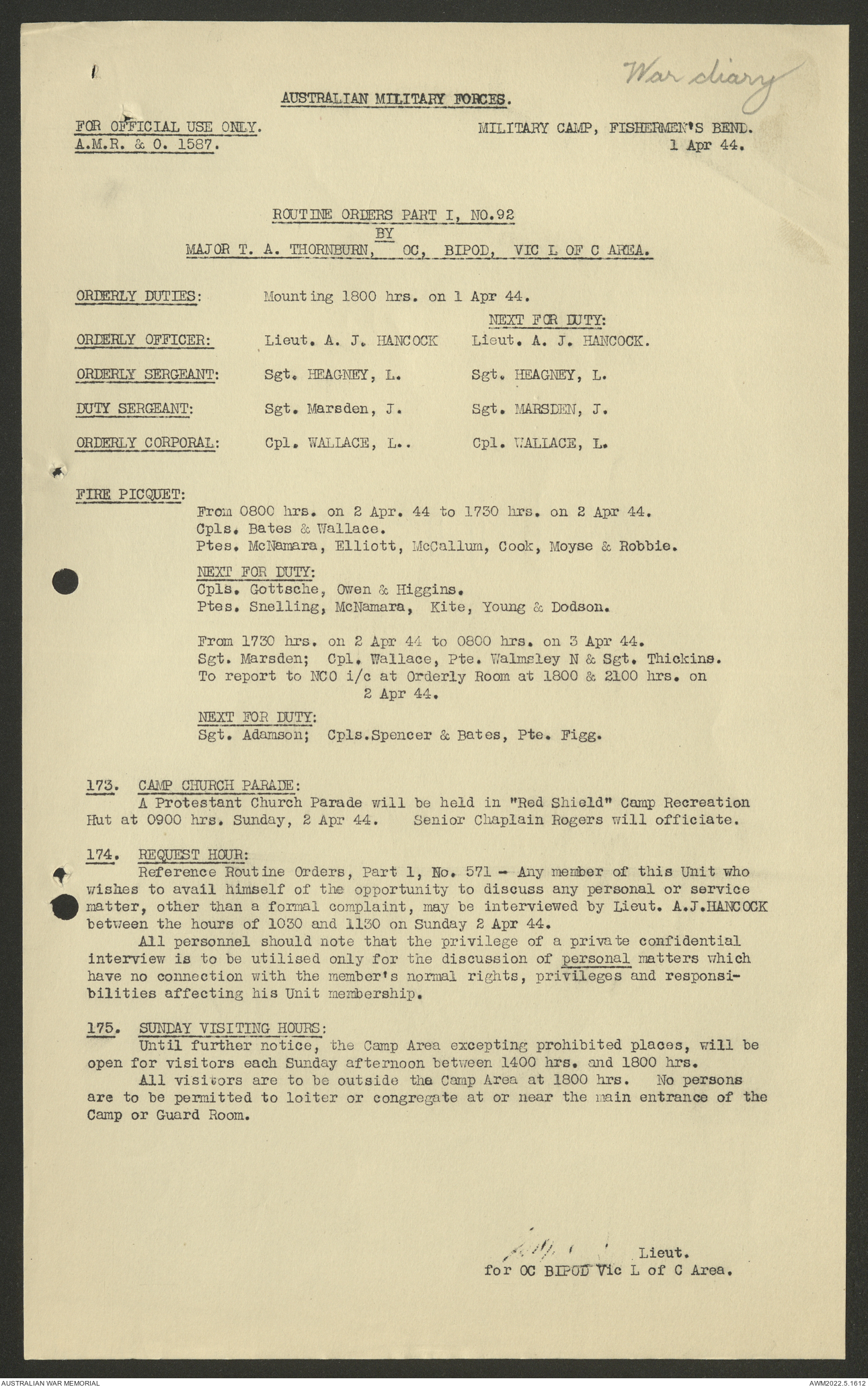 AWM52 10/19/5/14 - [Unit War Diaries, 1939-45 War] Victoria L of C [Lines of Communication] BIPOD [Bulk Issue Petrol and Oil Depot] March - April 1944