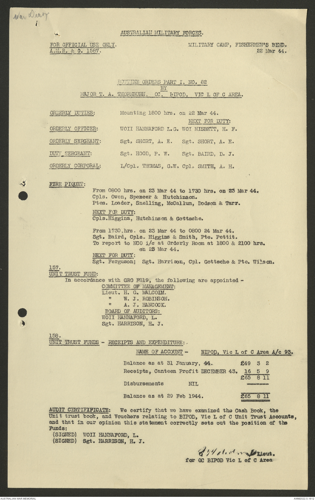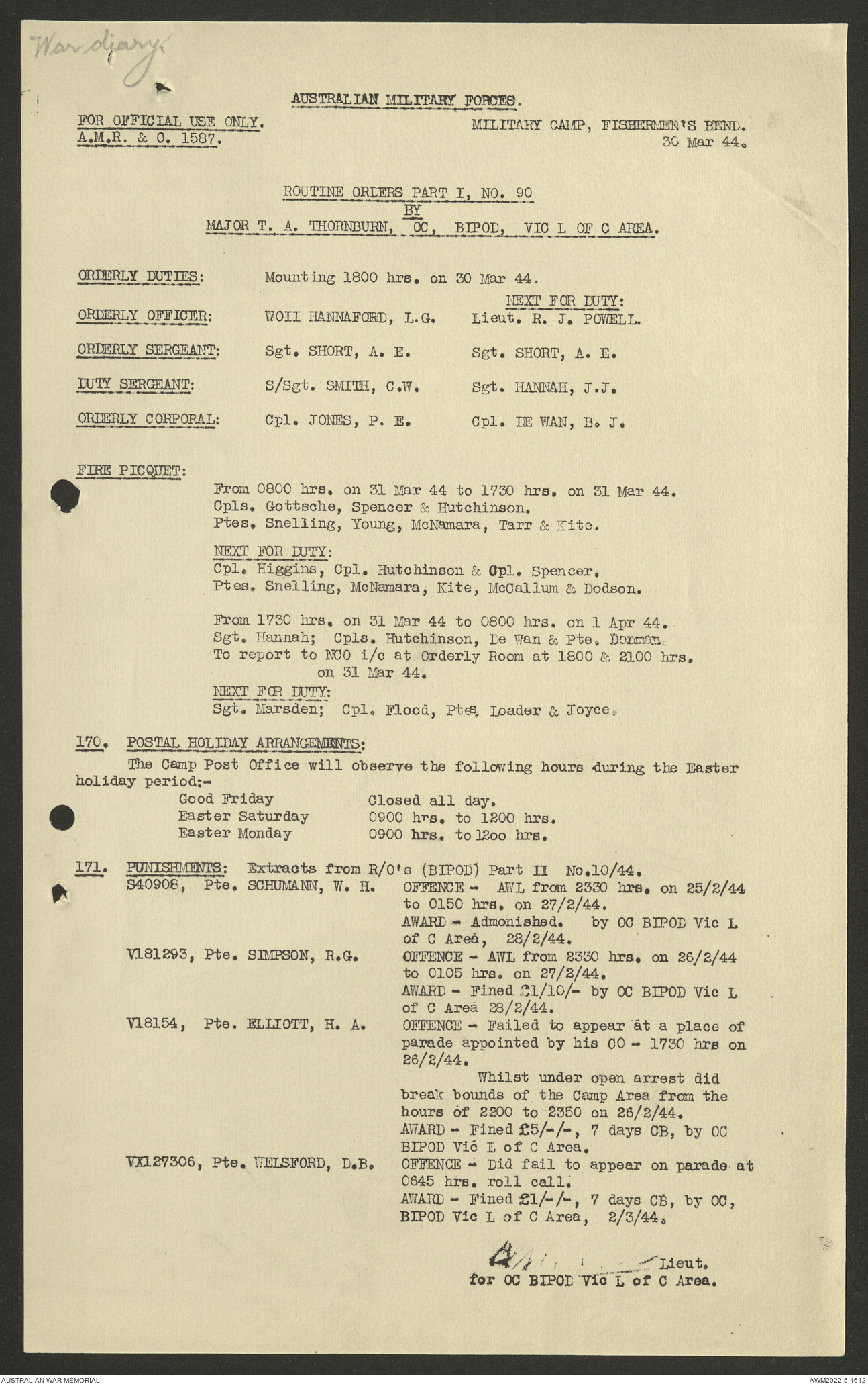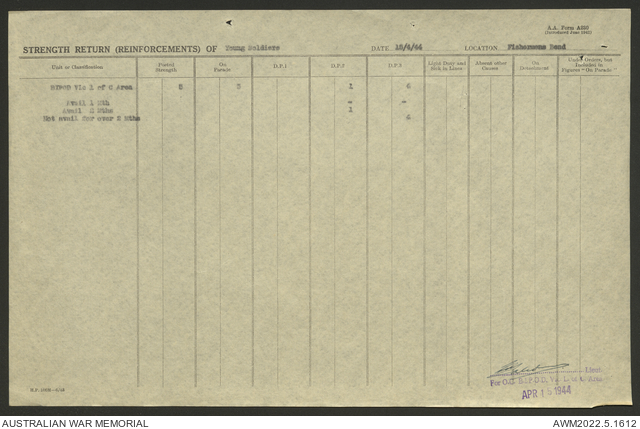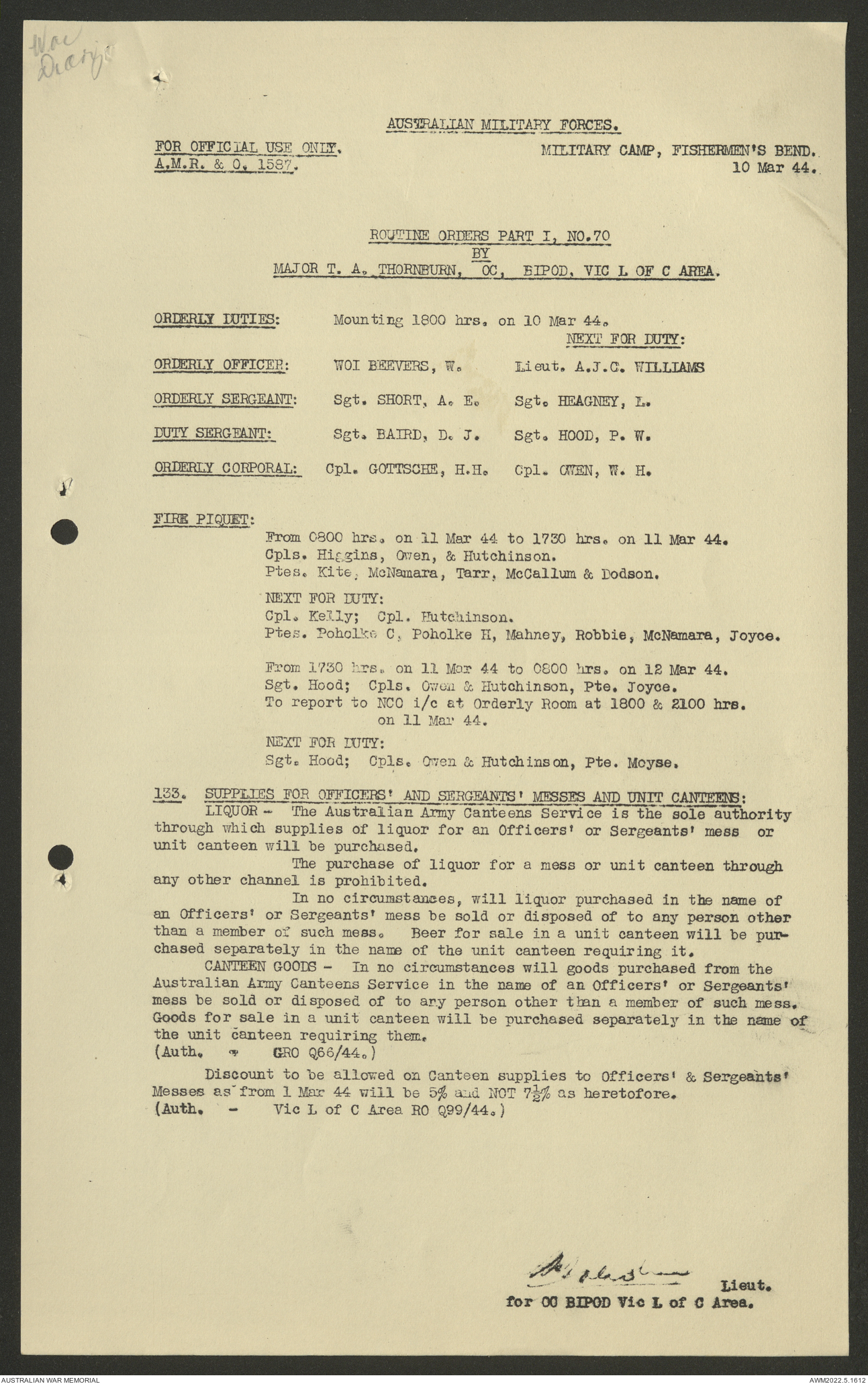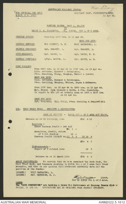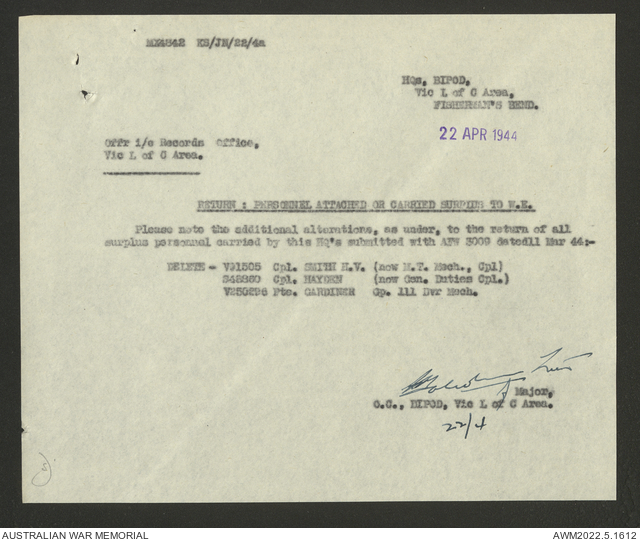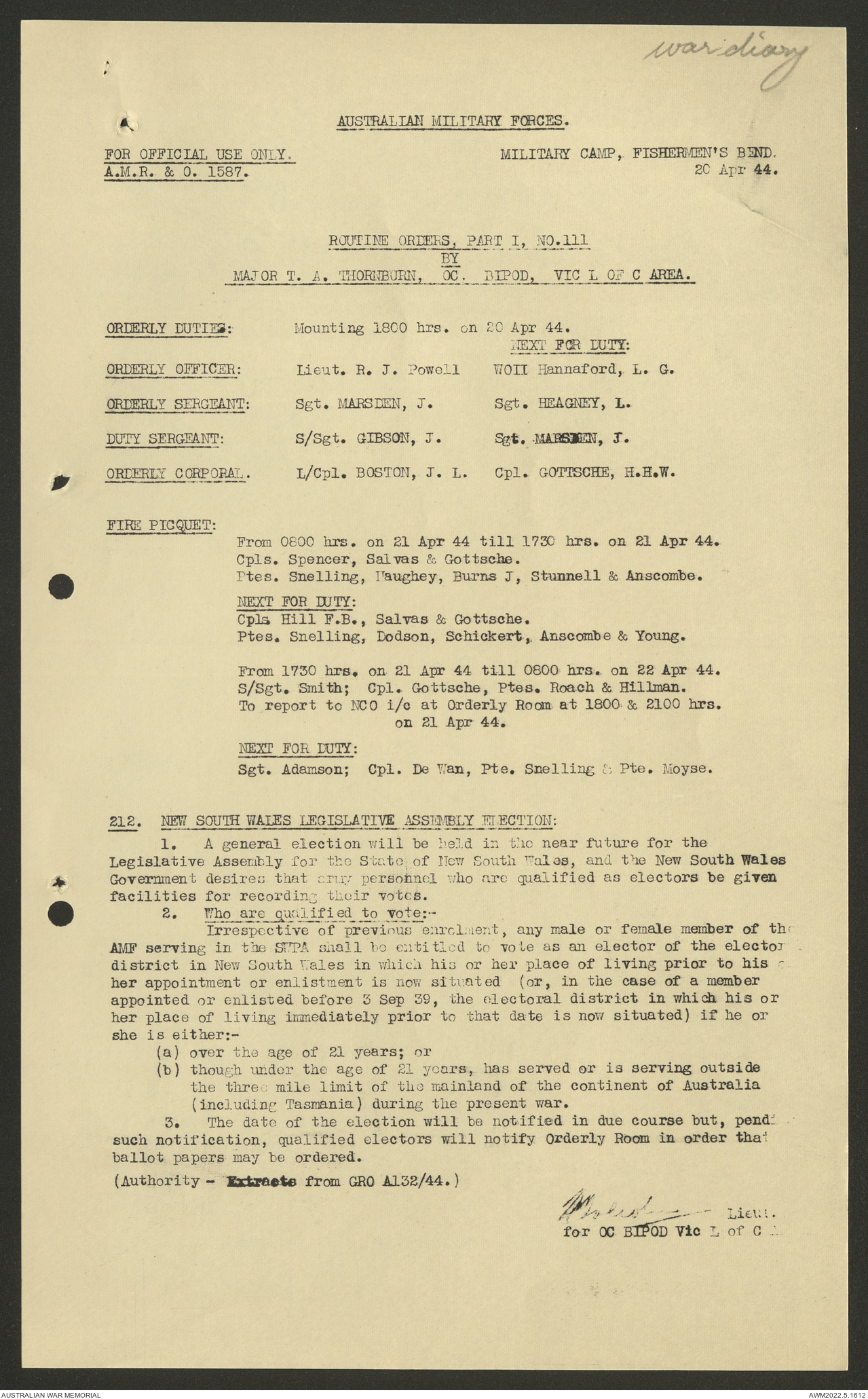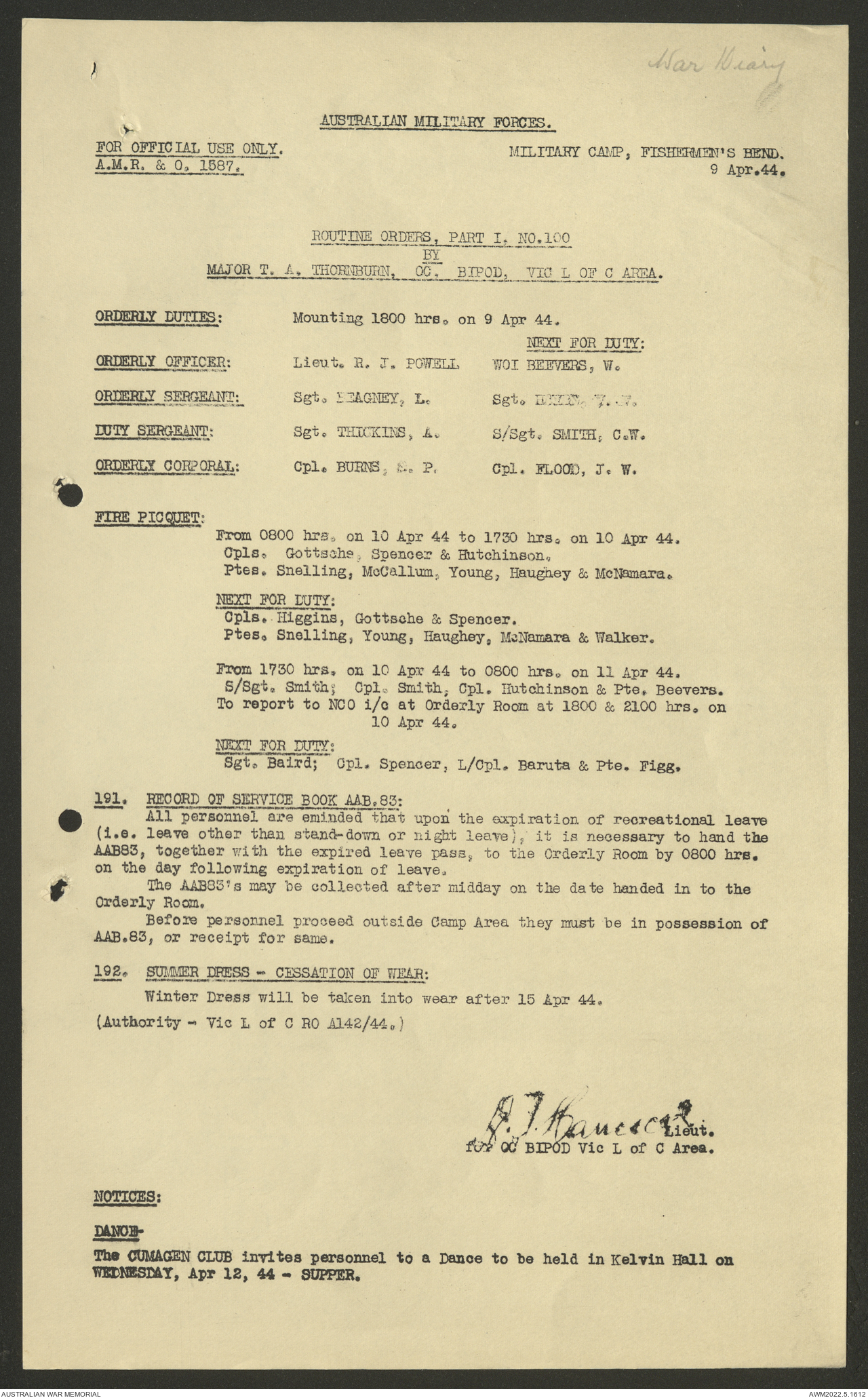 AWM52 10/19/5/14 - [Unit War Diaries, 1939-45 War] Victoria L of C [Lines of Communication] BIPOD [Bulk Issue Petrol and Oil Depot] March - April 1944