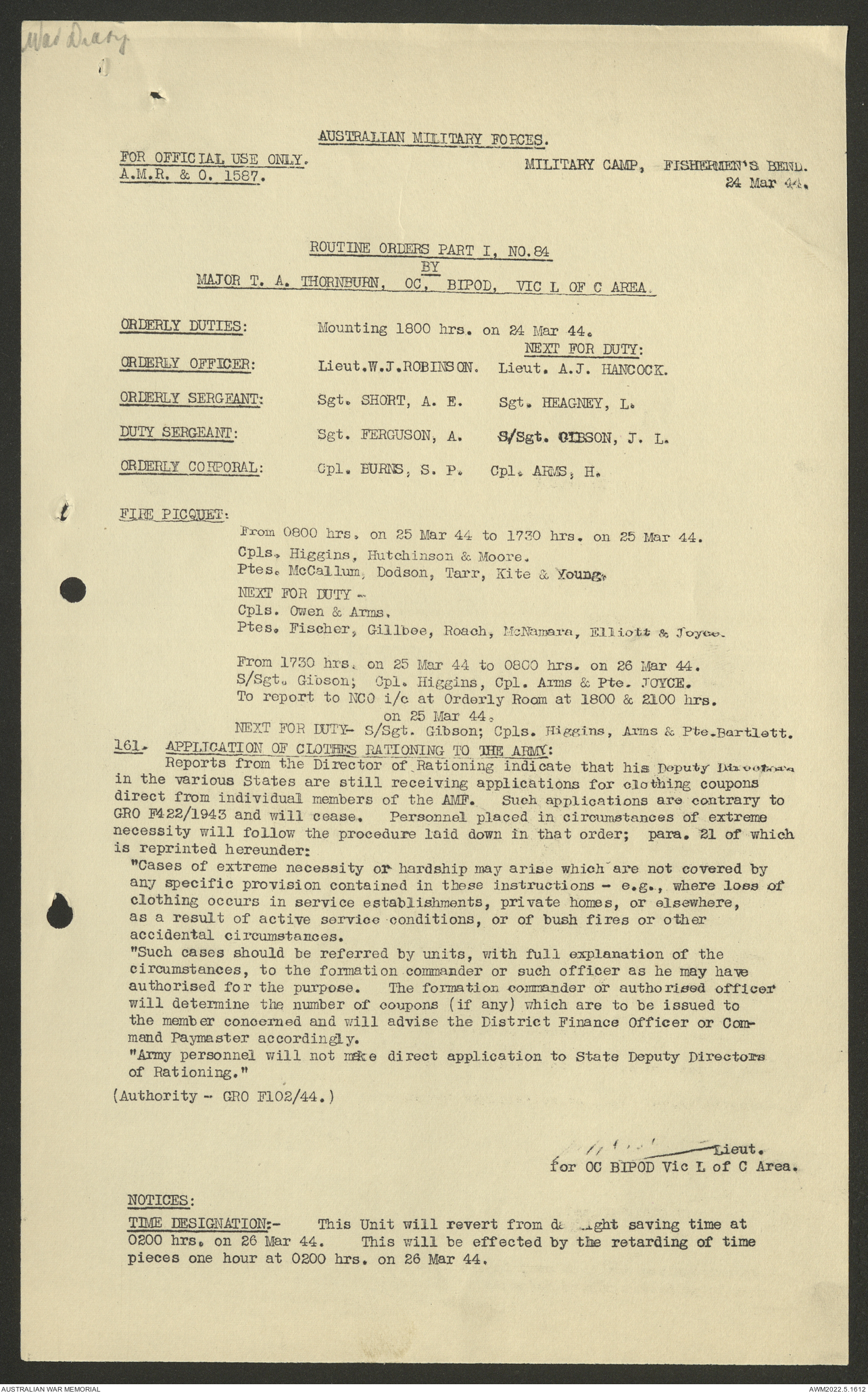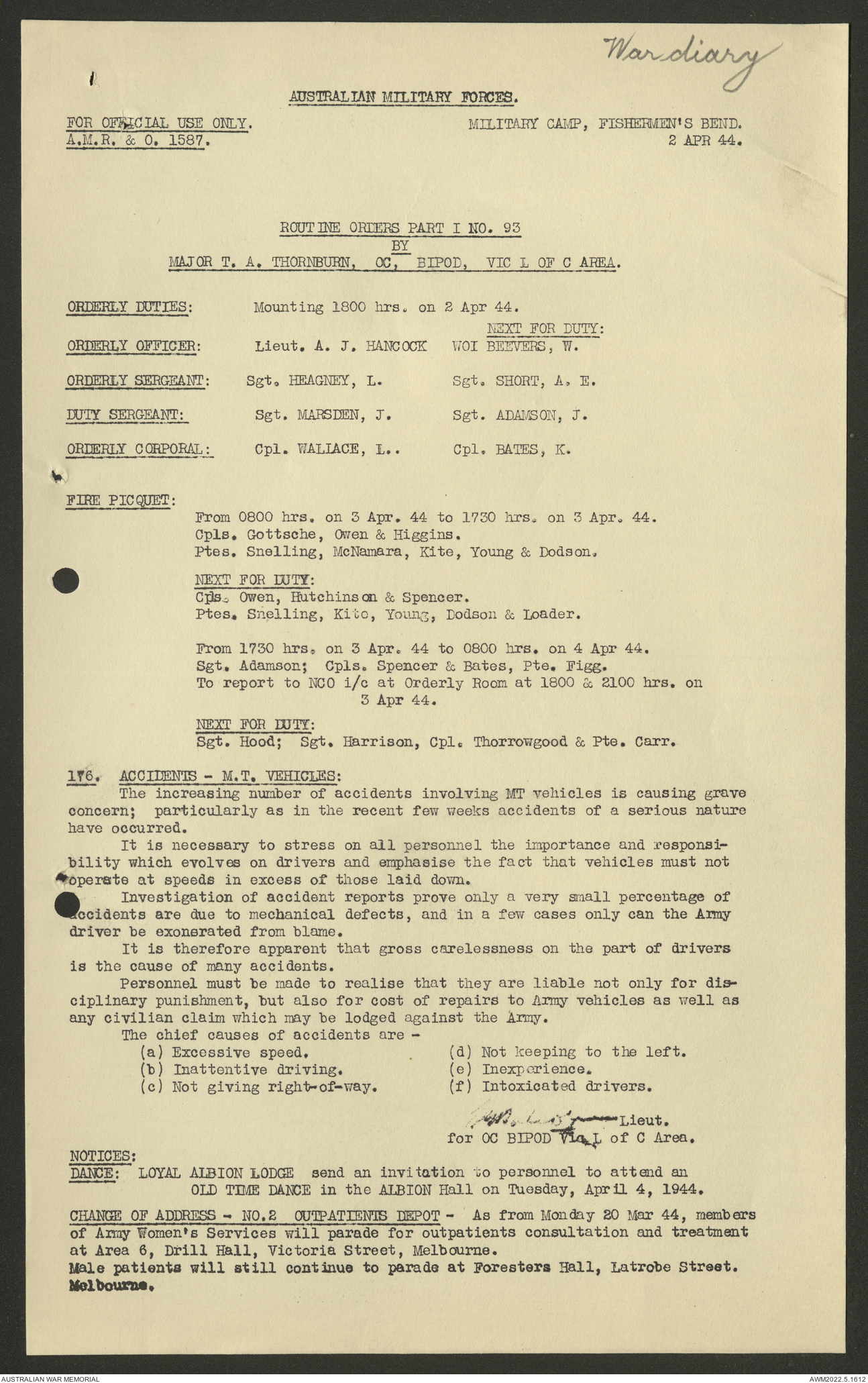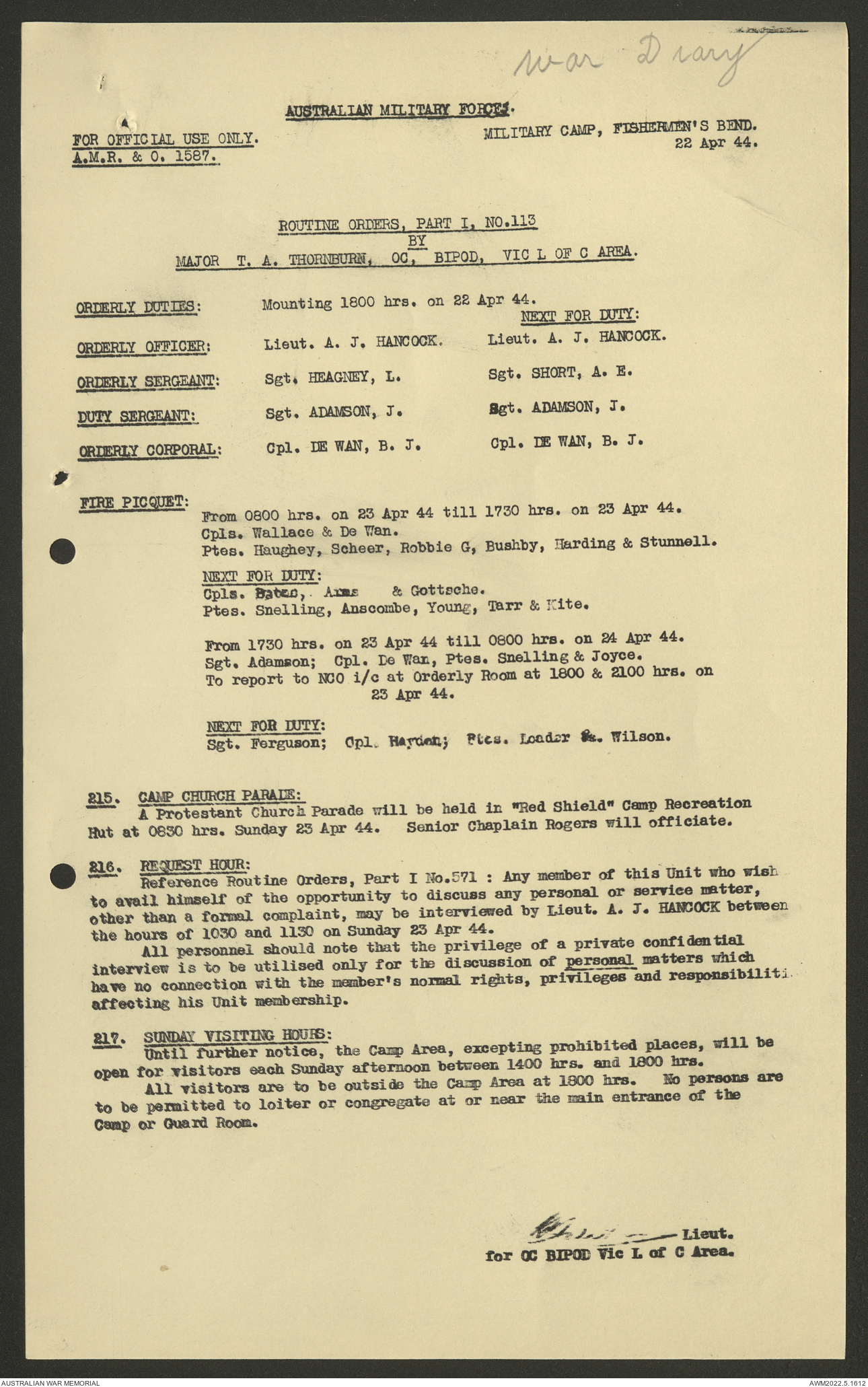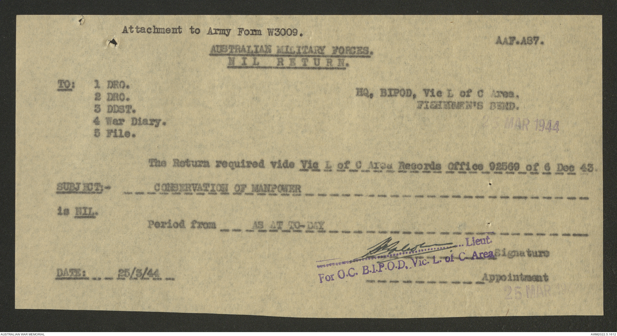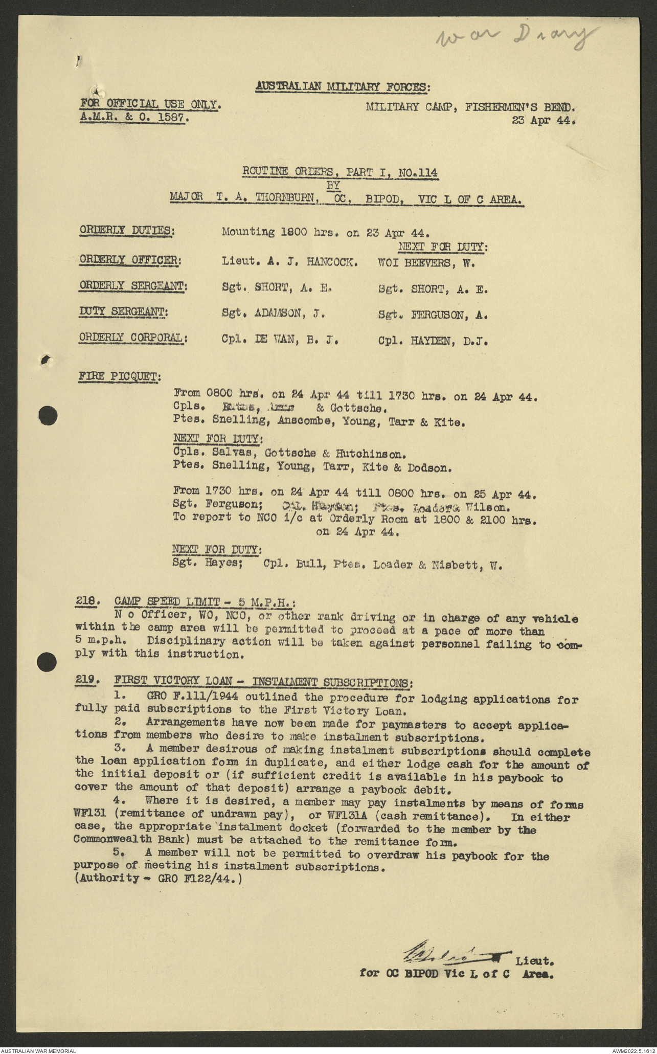 AWM52 10/19/5/14 - [Unit War Diaries, 1939-45 War] Victoria L of C [Lines of Communication] BIPOD [Bulk Issue Petrol and Oil Depot] March - April 1944