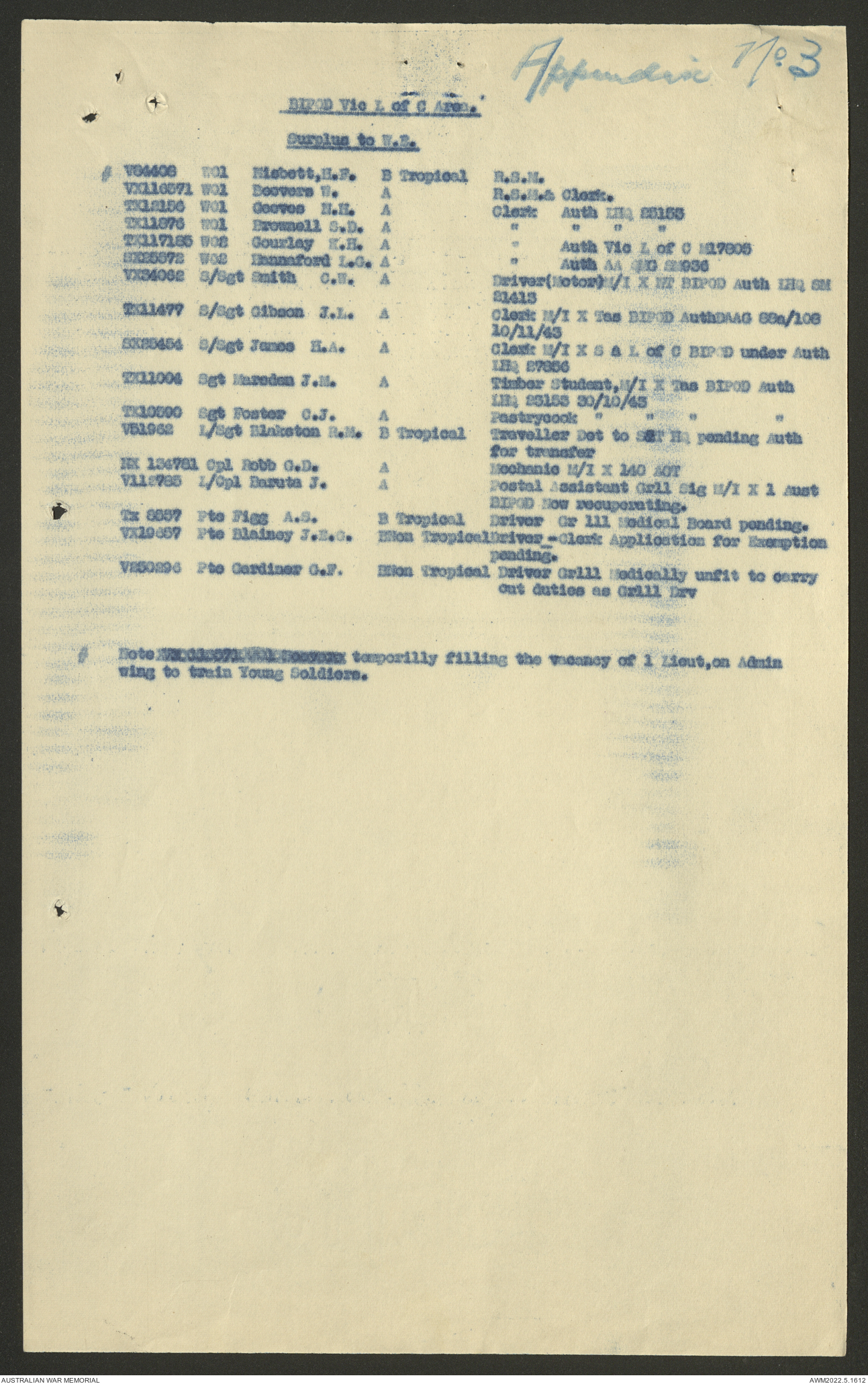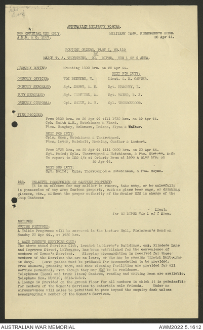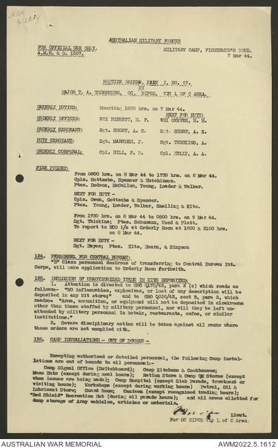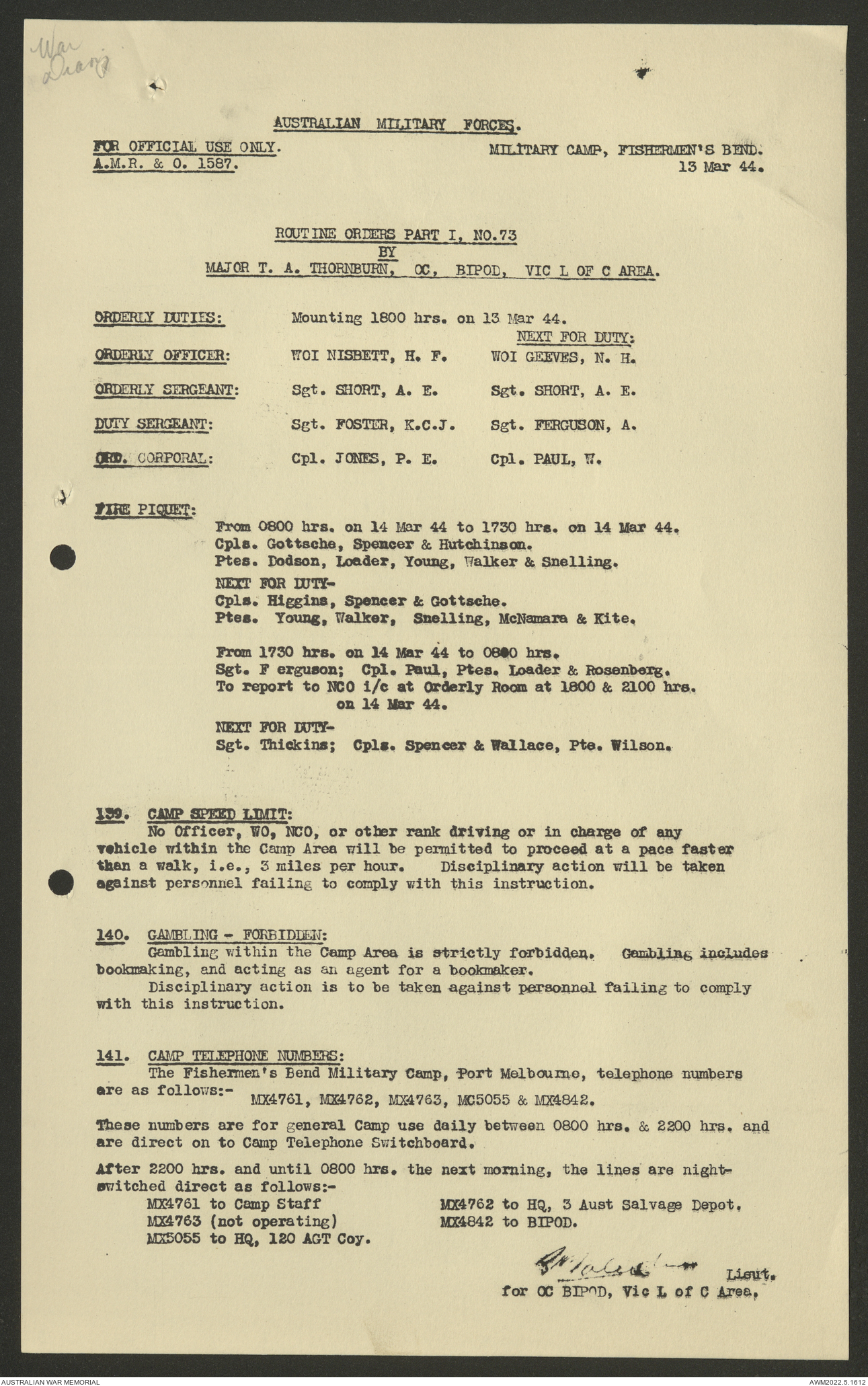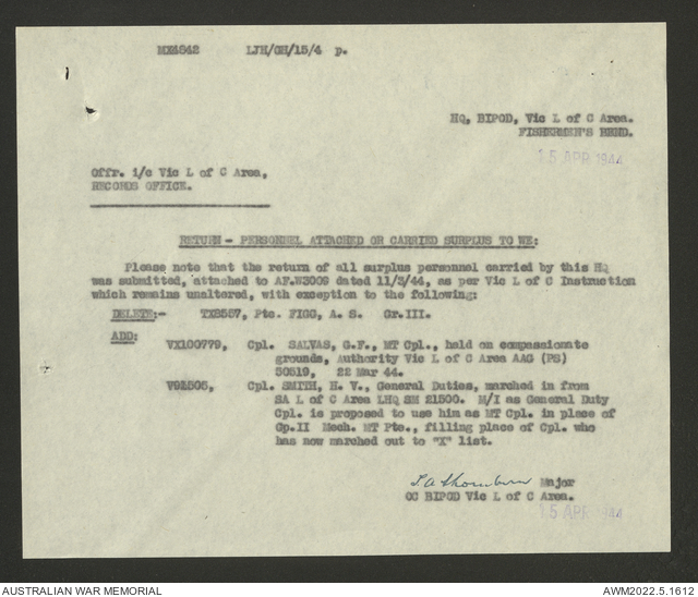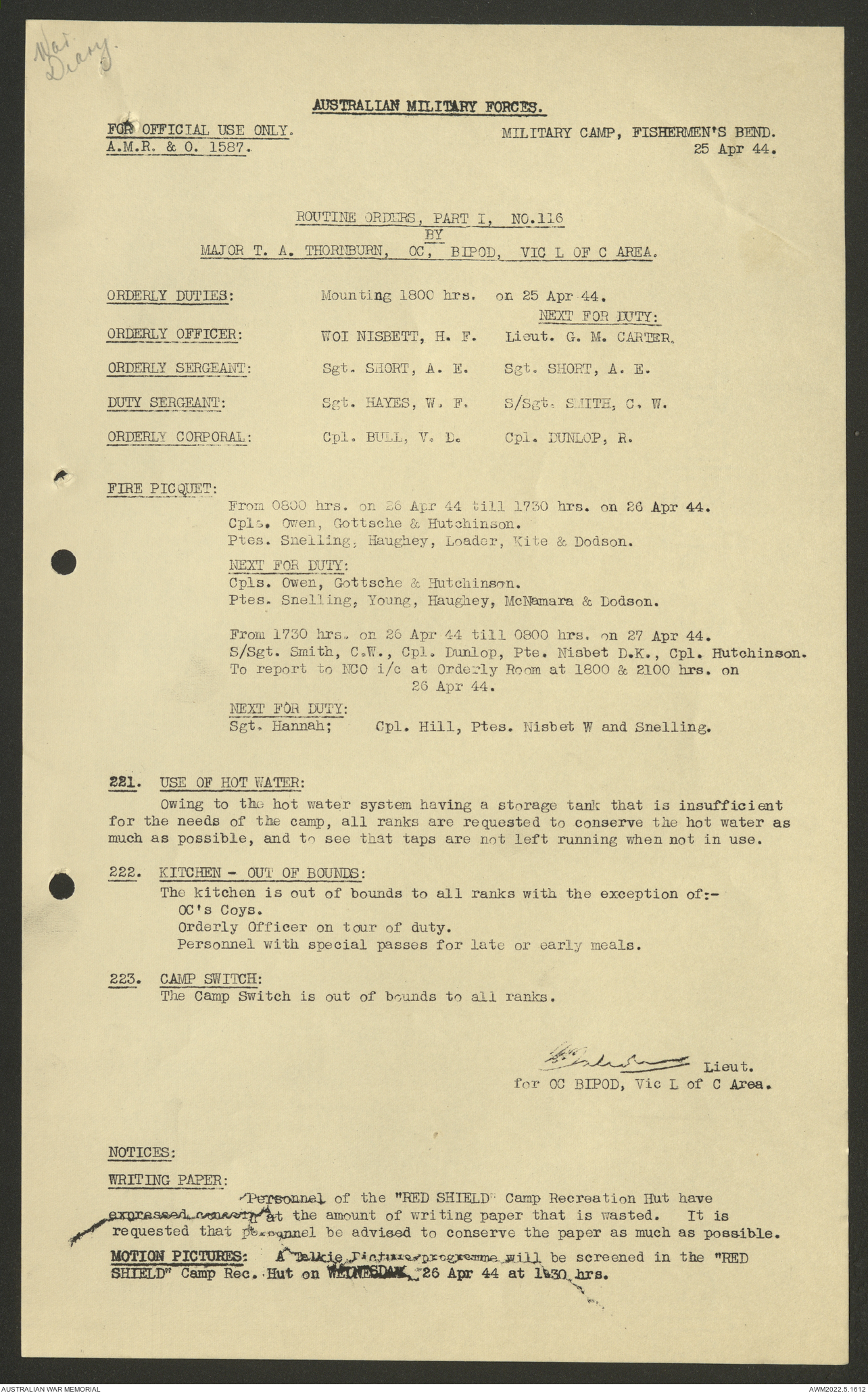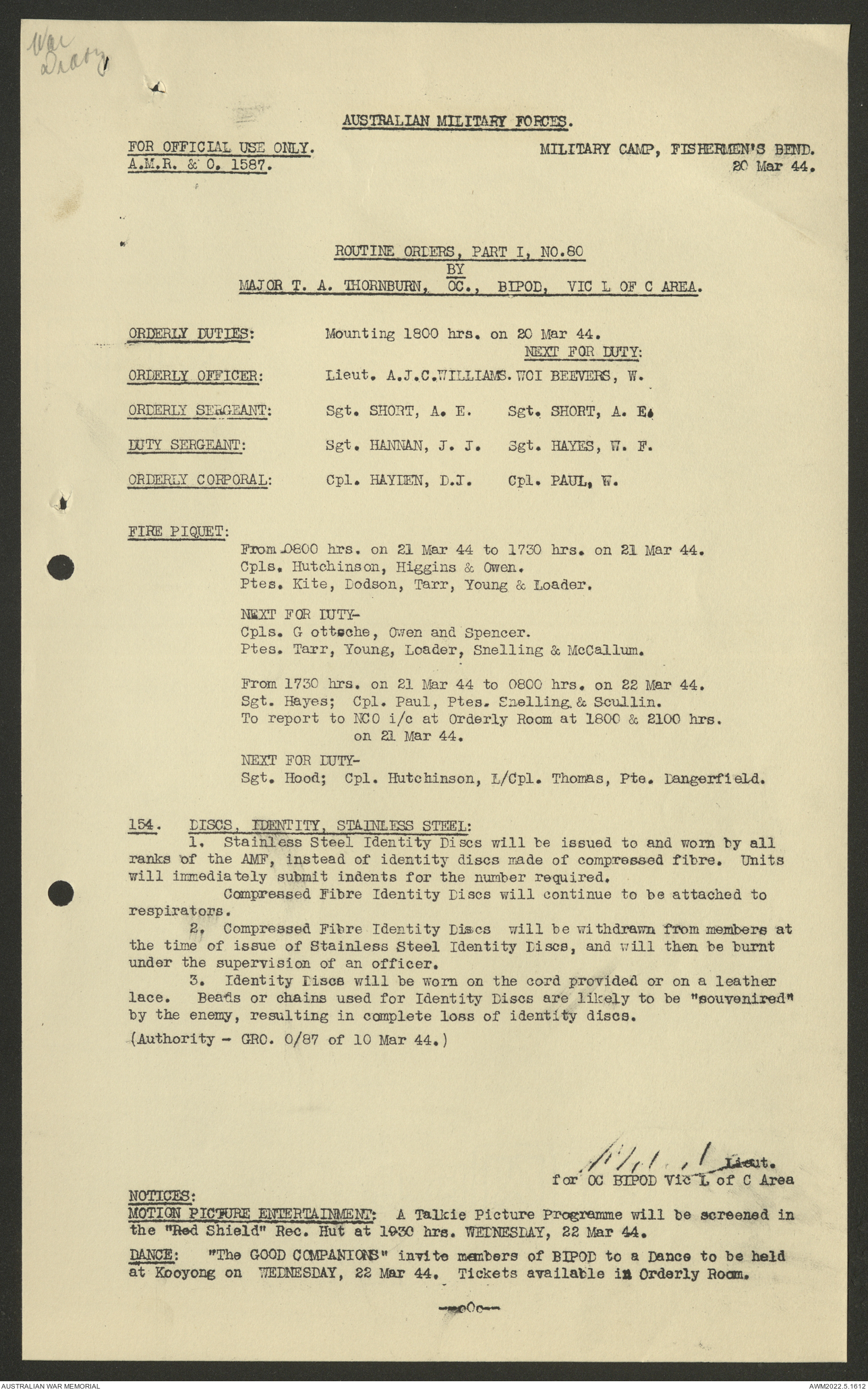 AWM52 10/19/5/14 - [Unit War Diaries, 1939-45 War] Victoria L of C [Lines of Communication] BIPOD [Bulk Issue Petrol and Oil Depot] March - April 1944