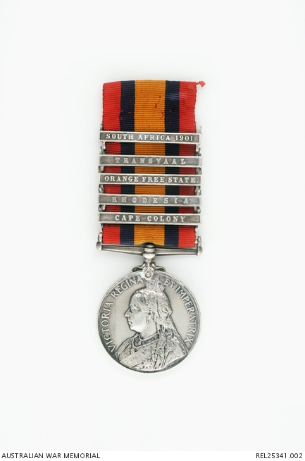 Queen's South Africa Medal (1899-1901) with bars 'CAPE COLONY', 'RHODESIA', 'ORANGE FREE STATE', 'TRANSVAAL' and 'SOUTH AFRICA 1901'. Impressed around edge with recipient's details.