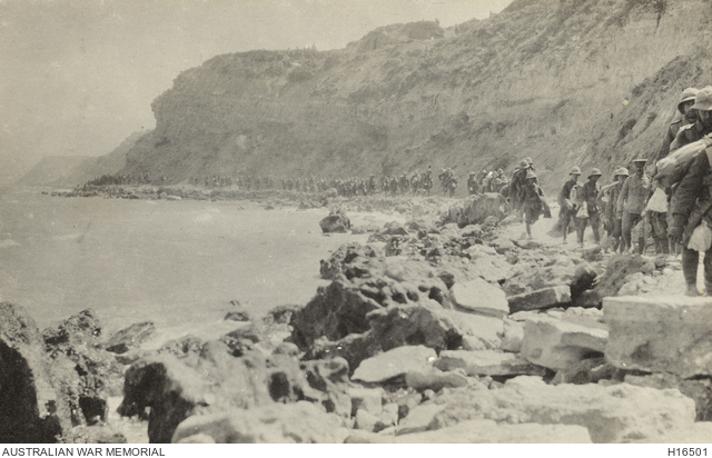 Gallipoli, Turkey. 1915. British troops moving along the beach from Gully Ravine to X Beach in the Cape Helles area. It is believed that this photograph was taken about the time of the evacuation. (Donor Professor J.R. Kay-Mouat)