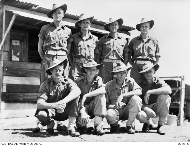 Personnel of No 28 Battery, 2/14th Field Regiment. Identified personnel are: (back row, left to right) SX9139 Gunner (Gnr) G F Smith, VX63107 Gnr L J Brooks, VX32878 Gnr J F Rossack, VX58674 Gnr A Cowlishaw; (front row, left to right) SX11804 Gnr B A Kerber, SX13423 Gnr S B Shegog, SX11316 Gnr G G Chapman, VX50433 Gnr D B Bell.