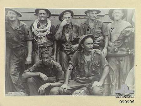 TARAKAN, BORNEO. 1945-04-30. MEN OF 2/13 FIELD COMPANY, ROYAL AUSTRALIAN ENGINEERS, EXHAUSED AFTER THE INITIAL ATTEMPT TO GET ASHORE AT LINGKAS TO BLOW WIRE DEFENCES. THEY REST IN A LANDING CRAFT VEHICLE-PERSONNEL BEFORE A LATER SUCCESSFUL ATTEMPT AT FULL TIDE. IDENTIFIED PERSONNEL ARE:- SAPPER J.F. WILLIAMS (1); SAPPER J.R. MUNRO, LATER KILLED IN ACTION ON SNAG'S TRACK (2); SAPPER J.A. HOFFMANN (3); SAPPER R.A.R. STEVENSON (4); LANCE-CORPORAL R.C. MACE (5); SAPPER D.R. BIDWELL (6); SAPPER C.J. FOLEY (7).