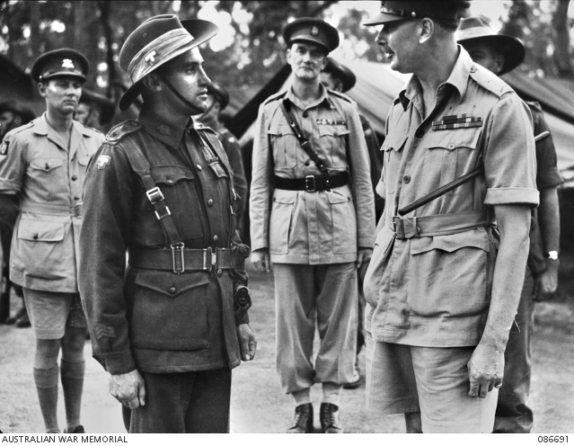 RAVENSHOE AREA, QLD. 1945-02-14. THE DUKE OF GLOUCESTER, GOVERNOR GENERAL OF AUSTRALIA, (2), SPEAKS WITH LIEUTENANT T C DERRICK, VC, DCM, OFFICER OF THE GUARD, 2/48 INFANTRY BATTALION, (1). BRIGADIER D A WHITEHEAD, (3), IS IN THE BACKGROUND.