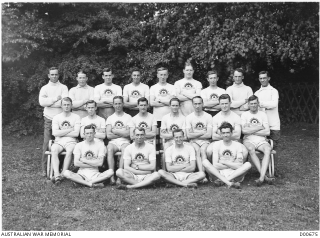 - Outdoor group portrait of members of the AIF athletics team which took part in the Inter-Allied ...