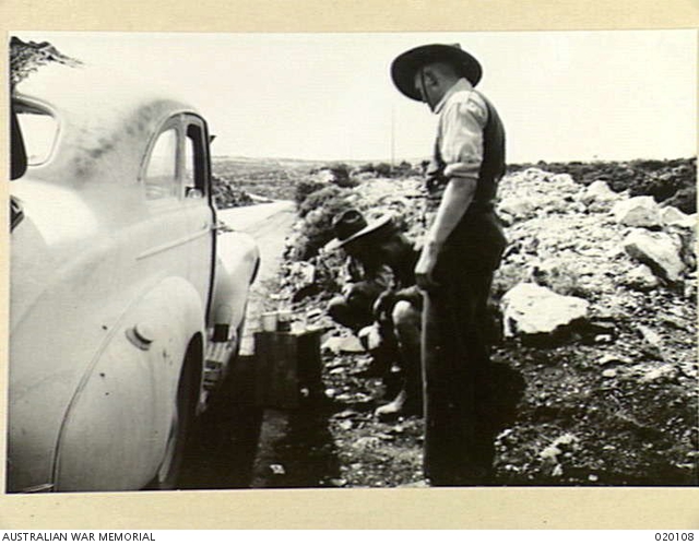 - Liaison Officer’s car of Headquarters, 26th Australian Infantry Brigade, stopped for lunch on the ...